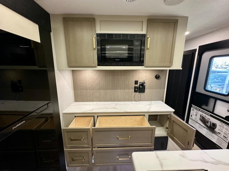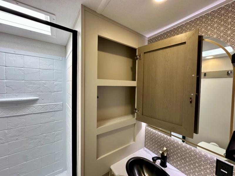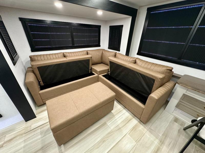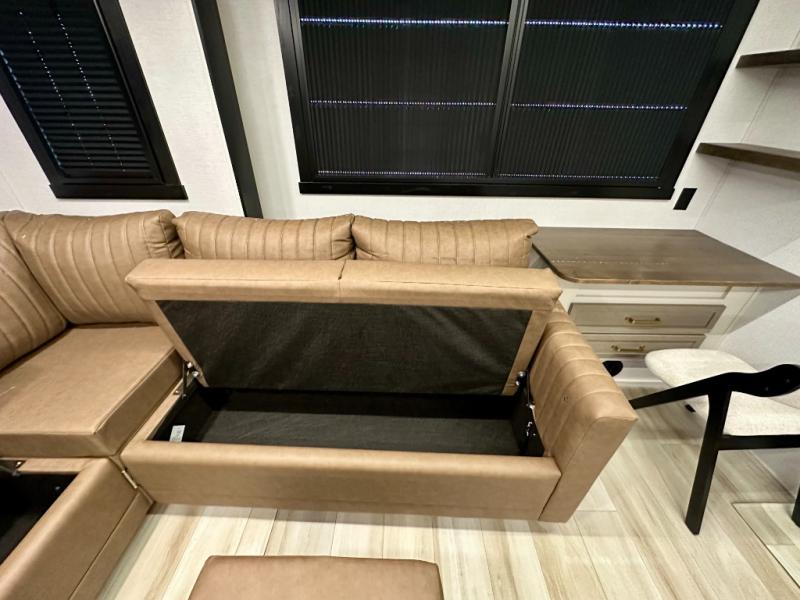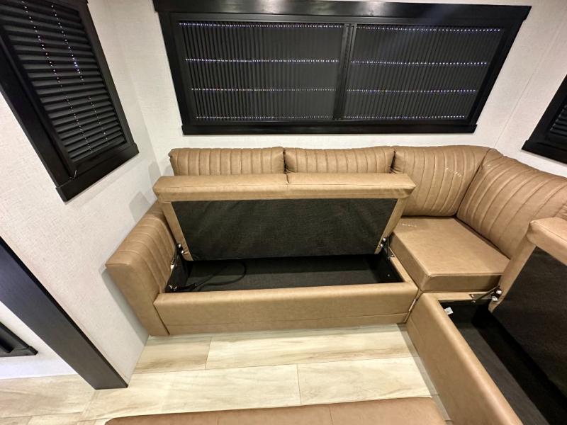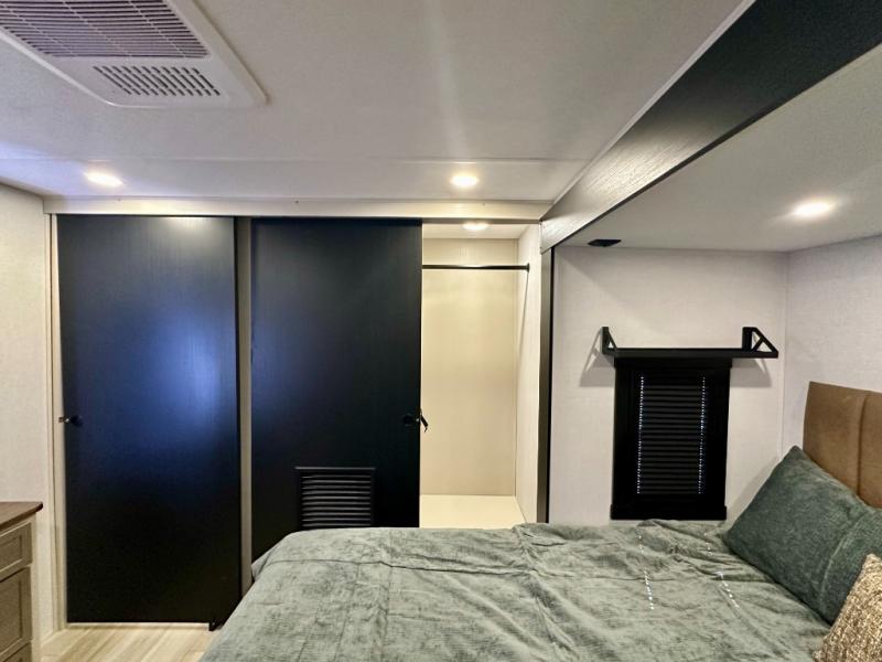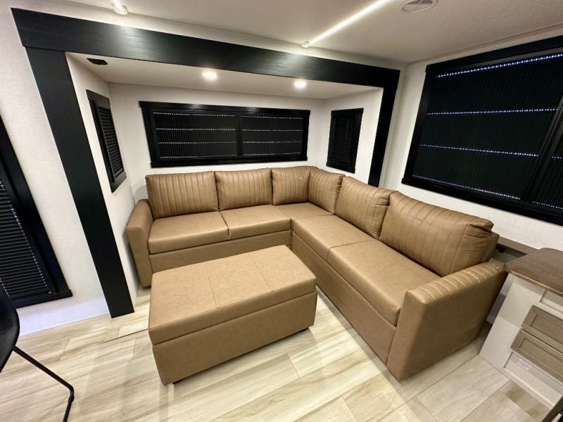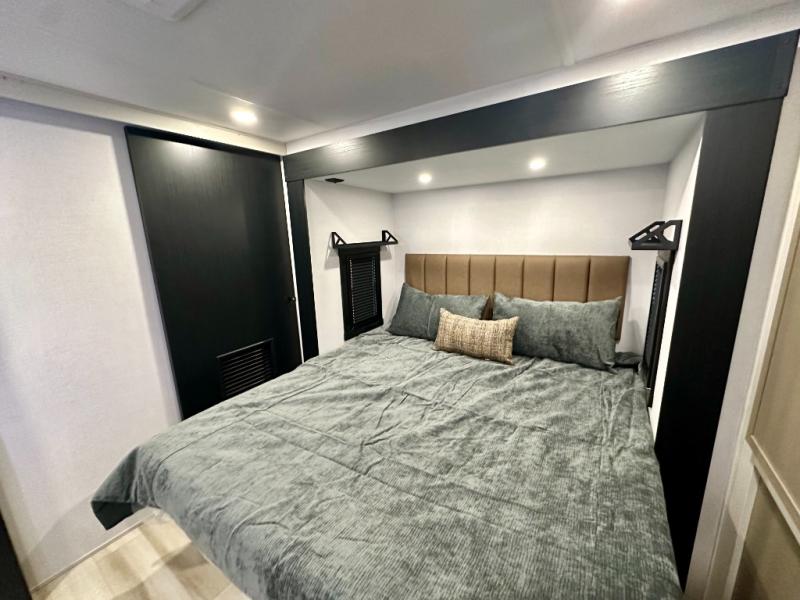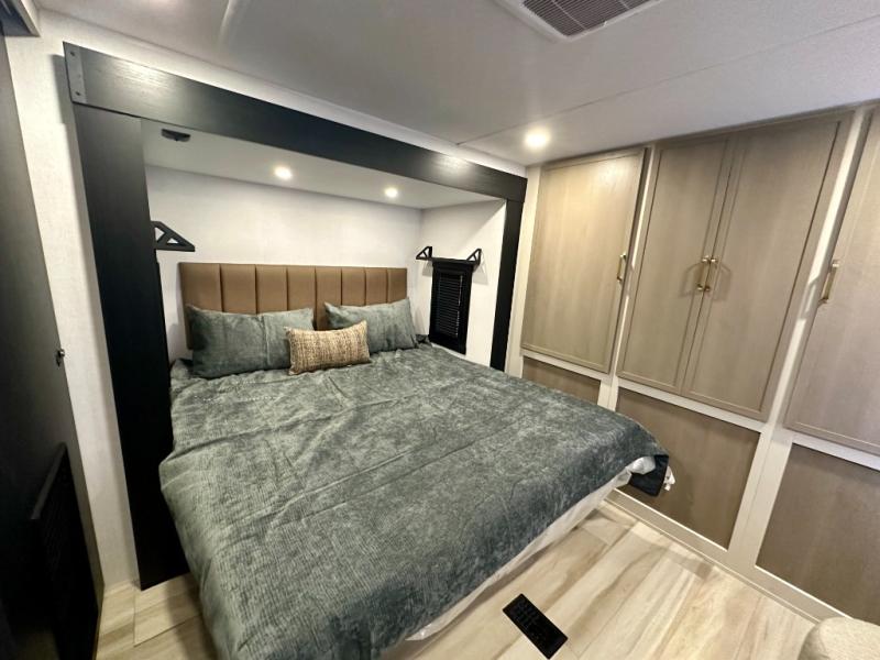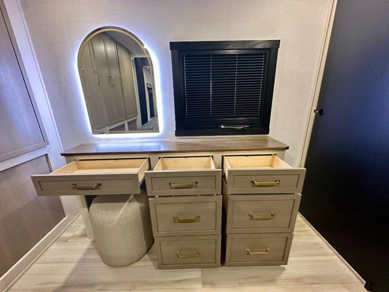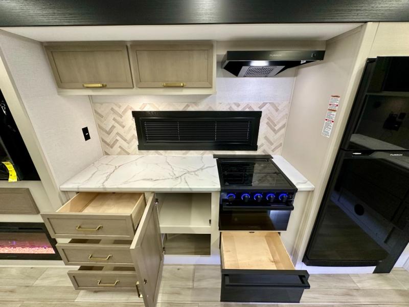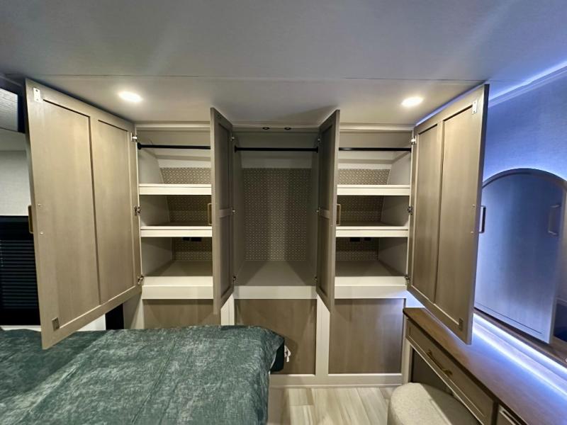 Enjoy comfortable stays at the campground in this spacious travel trailer. The rear living area with panoramic windows will be a favorite place to relax with its L-shaped sofa and ottoman, which is in direct view of the 50" TV and fireplace. There is also a hidden storage behind the TV, and a designated desk space in the back where you can get some work done. The chef of your group can create meals in the full kitchen, and there is dining space at the kitchen island with four chairs. Towards the front, a full bath will let you freshen up each day, and the front private bedroom with a queen bed slide is sure to bring comfort. There are also dual wardrobes with a bench in between, plus a dresser with an ottoman!