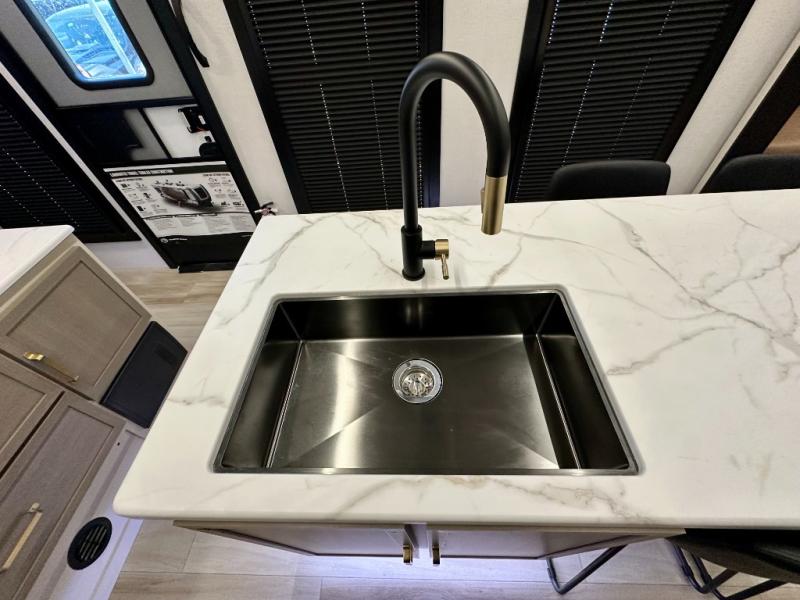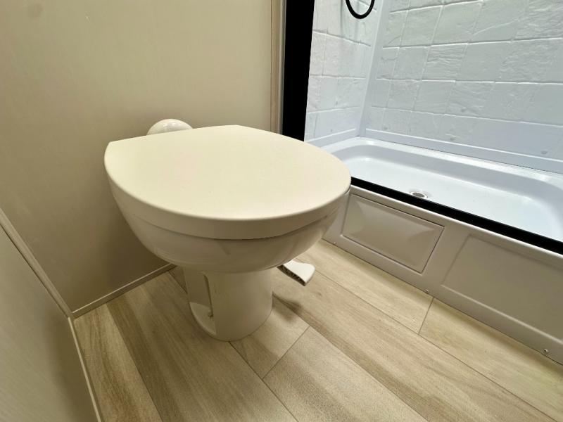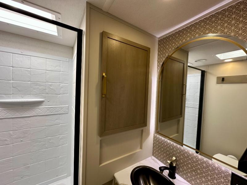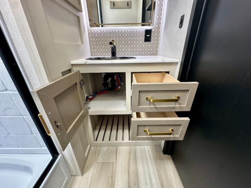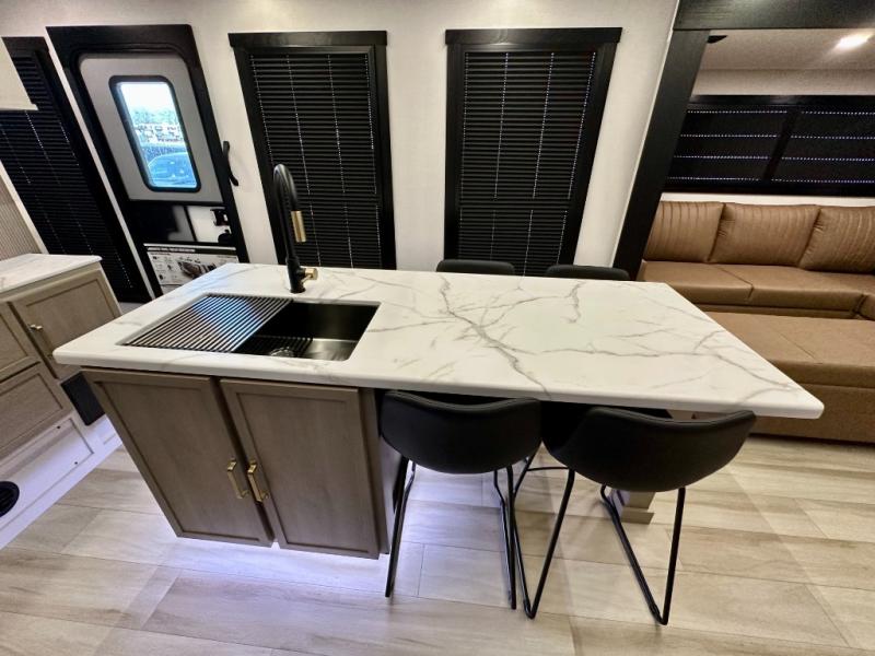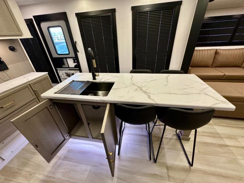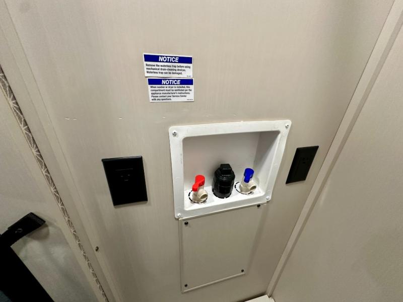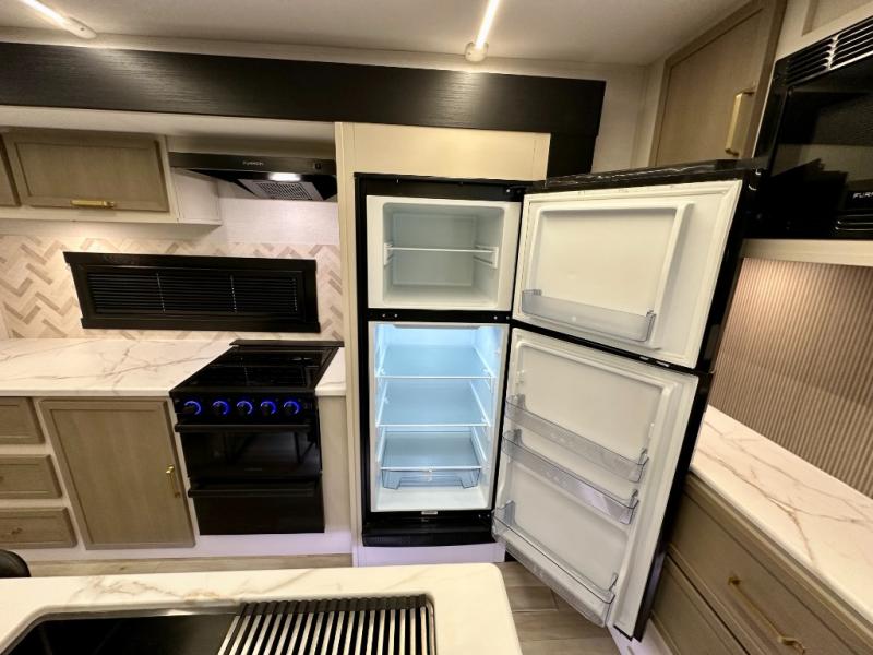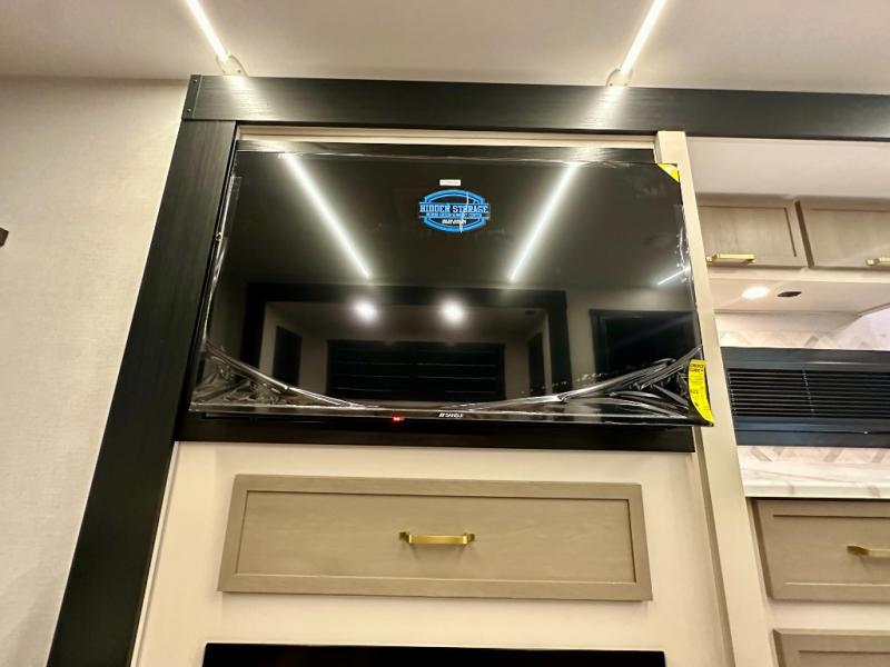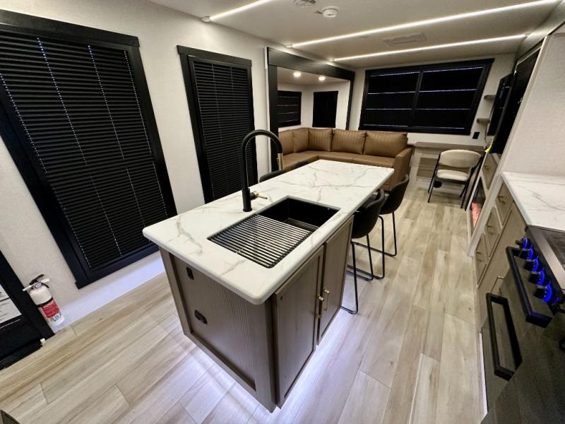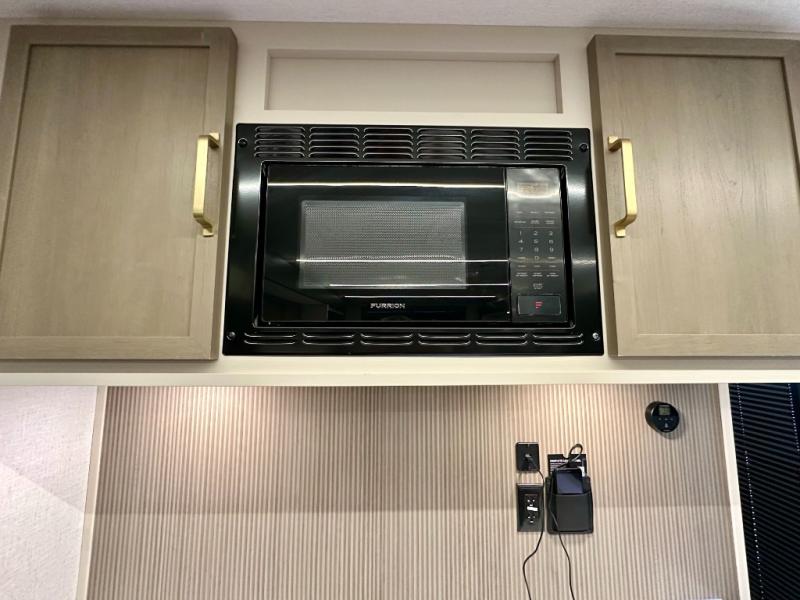Enjoy comfortable stays at the campground in this spacious travel trailer. The rear living area with panoramic windows will be a favorite place to relax with its L-shaped sofa and ottoman, which is in direct view of the 50" TV and fireplace. There is also a hidden storage behind the TV, and a designated desk space in the back where you can get some work done. The chef of your group can create meals in the full kitchen, and there is dining space at the kitchen island with four chairs. Towards the front, a full bath will let you freshen up each day, and the front private bedroom with a queen bed slide is sure to bring comfort. There are also dual wardrobes with a bench in between, plus a dresser with an ottoman!