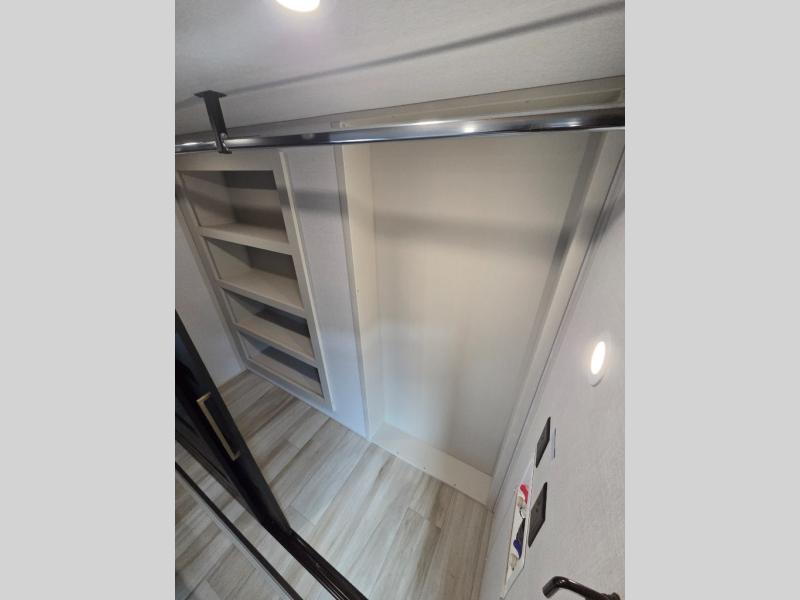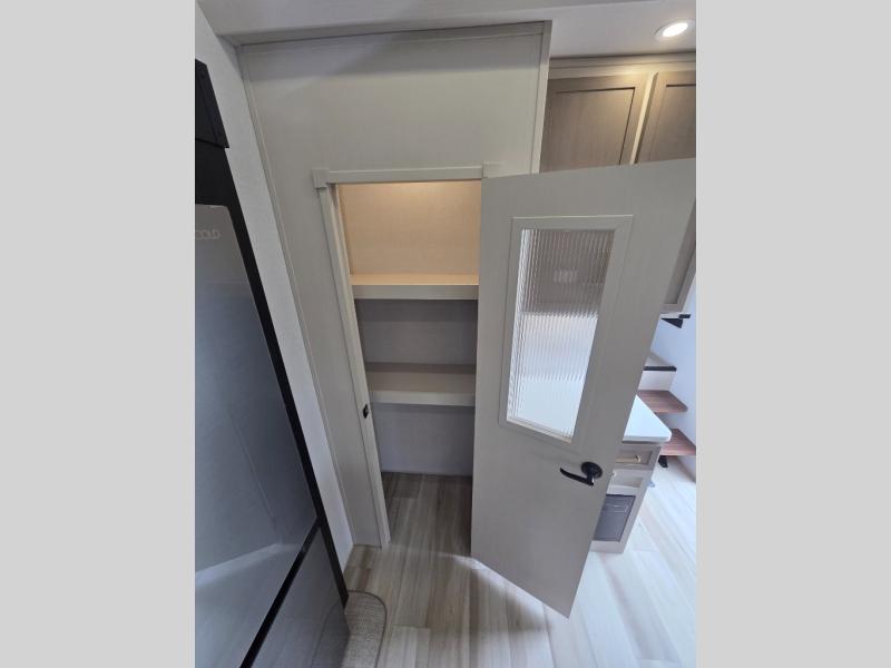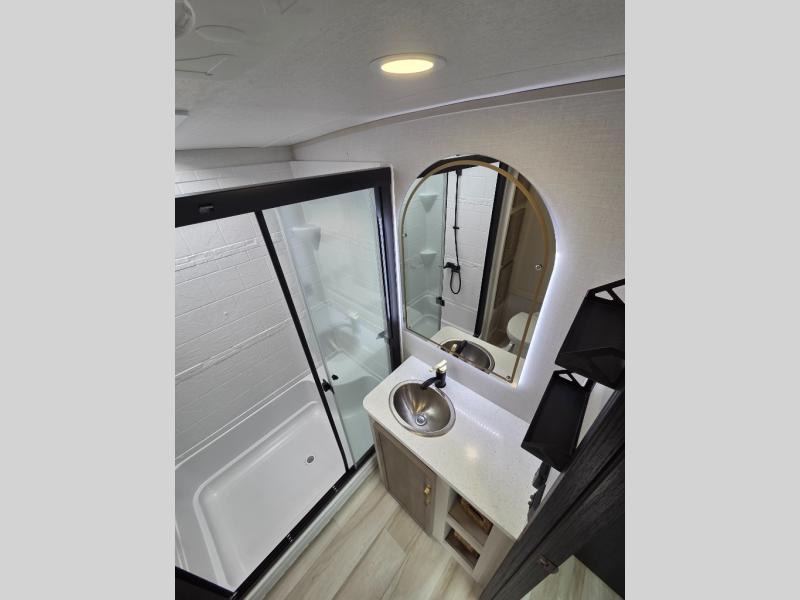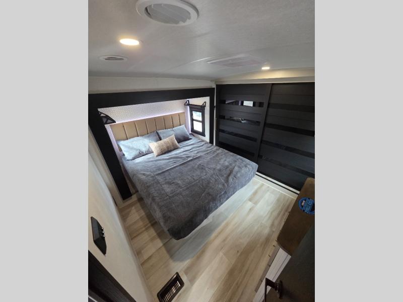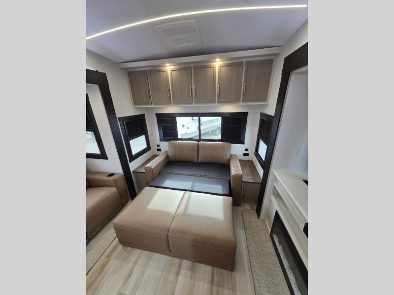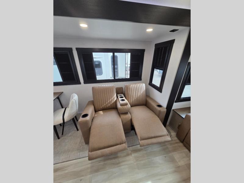 Each camping trip in this fifth wheel will be spent in comfort thanks to the spacious living areas and added amenities. Once you arrive at your favorite campground, you can set up the two awnings, grab your camp chairs from the XL Texas-size pass-through, and relax with a cold drink. If you'd rather kick your feet up inside, the theater seating across from the pop-up TV and fireplace will also bring lots of comfort! A rear tri-fold sofa will allow you to invite two overnight guests along, and the table and chairs provide a place to dine at each morning. You'll feel right at home with a spacious bathroom that includes a residential-style walk-in shower with a skylight, and a front private bedroom. There is a custom king bed with Versa-Tilt here, along with a dresser with a bench beside it, and a walk-in closet with shelves and washer/dryer prep if you plan to go full-time!