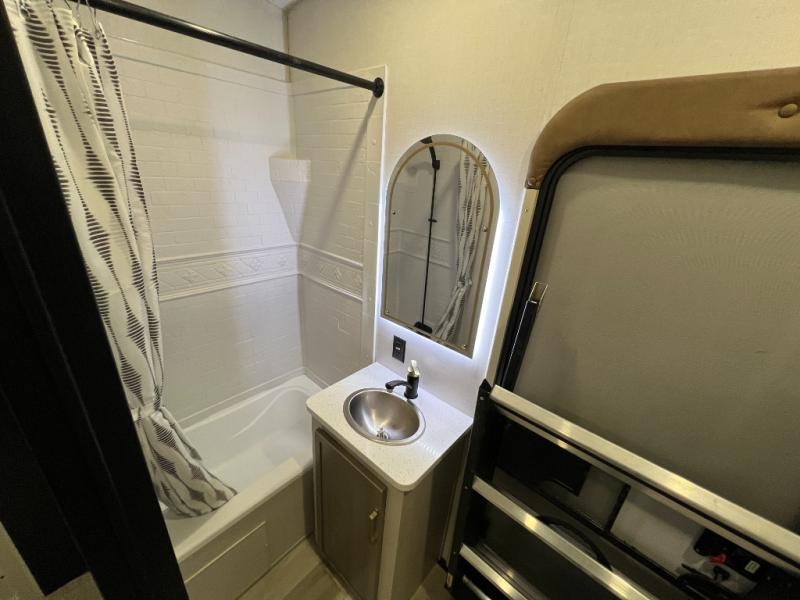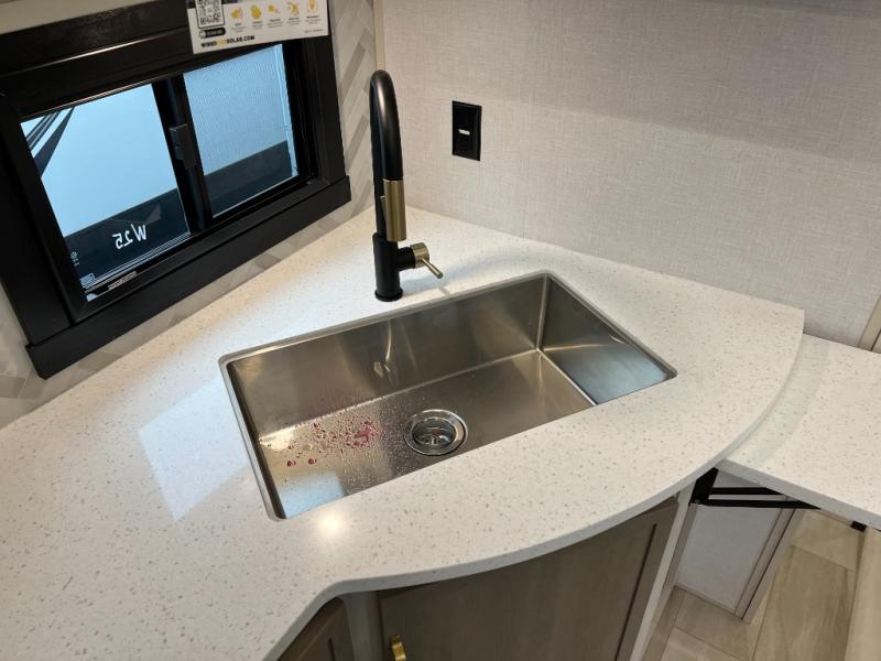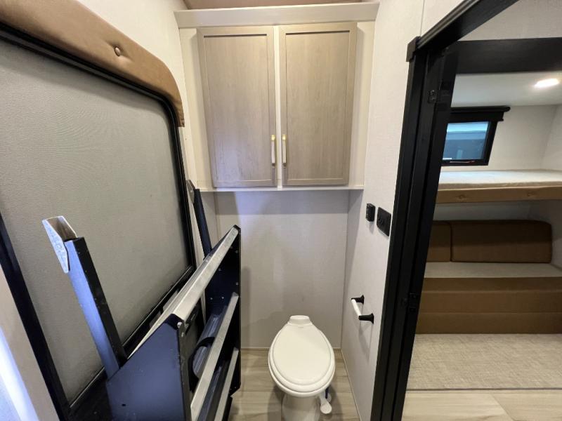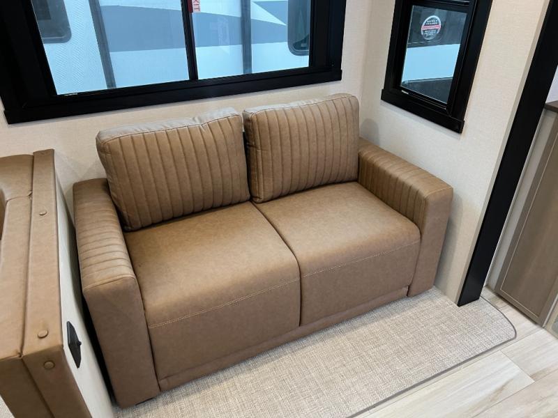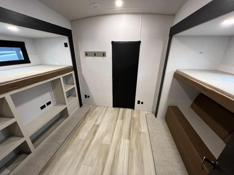 With two full bathrooms, everyone will stay clean in this fifth wheel! The double entry doors makes for a smooth flow of traffic and the unique rear entrance leads directly into the rear full bathroom. The private bunkhouse features not only one bunk above a Versa queen convertible bed/sofa, but also a second bunk above with storage. The U-shaped dinette is the perfect place for you to enjoy your meals at, play some card games and even transform into an extra sleeping space. The exterior has plenty of features you will love too like the outside kitchen/bar so you can have a good time cooking outdoors and a coax/TV hookup that you can add your own outside TV, plus an extra large pass-through storage area for your outdoor gear. When you're ready for bed, the custom king bed will be waiting for you in the front private bedroom!