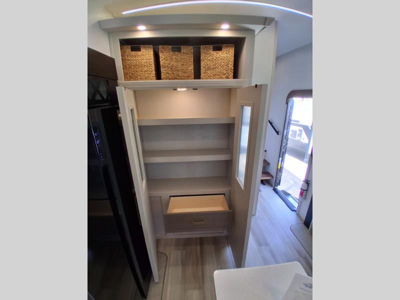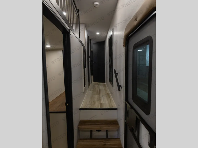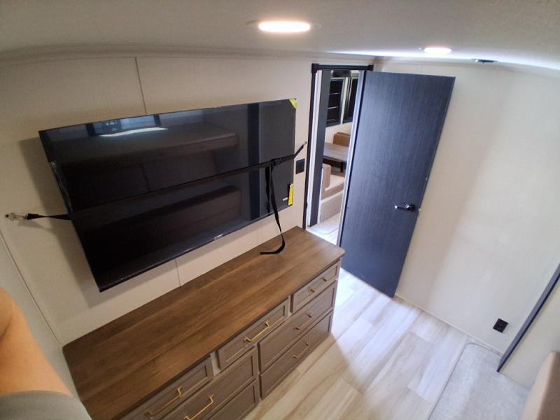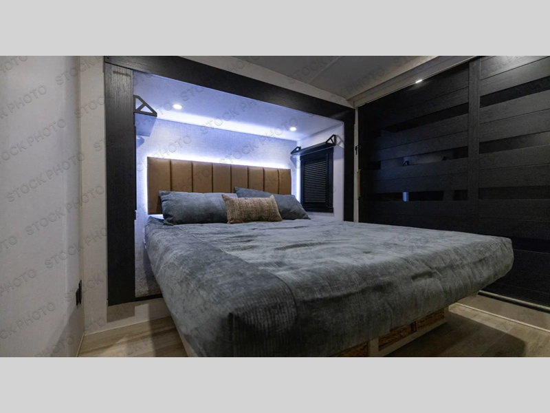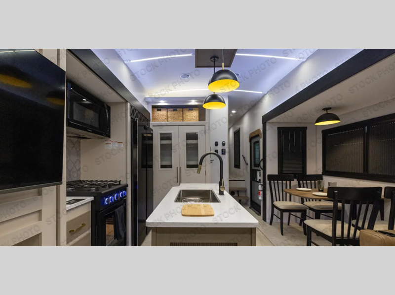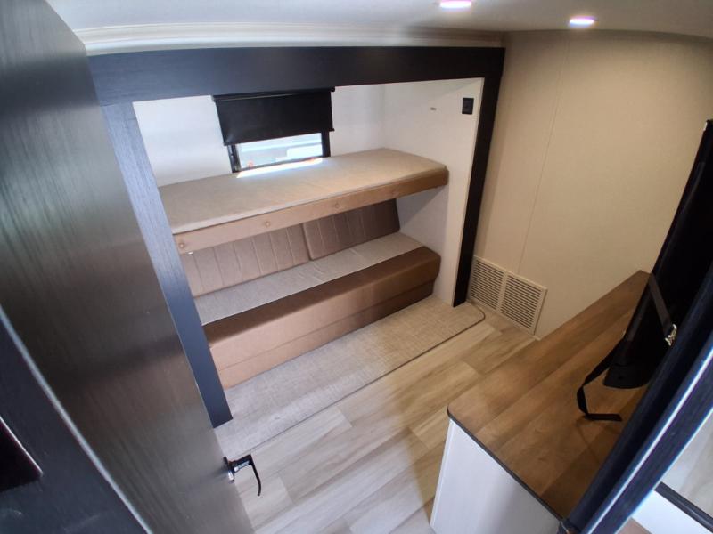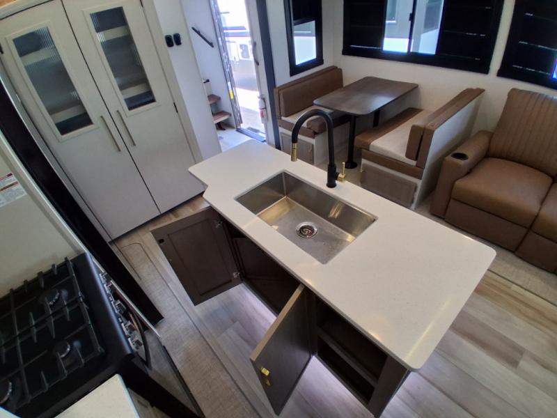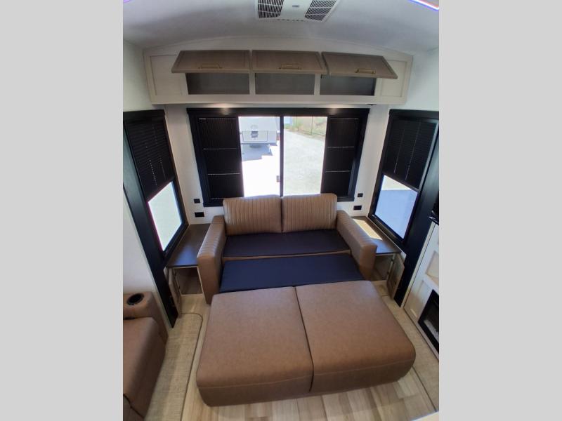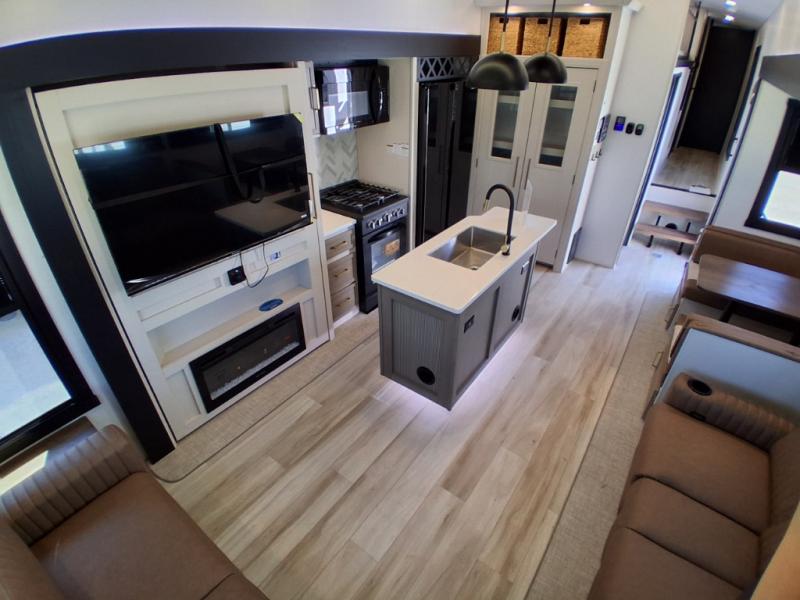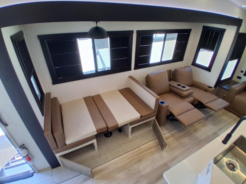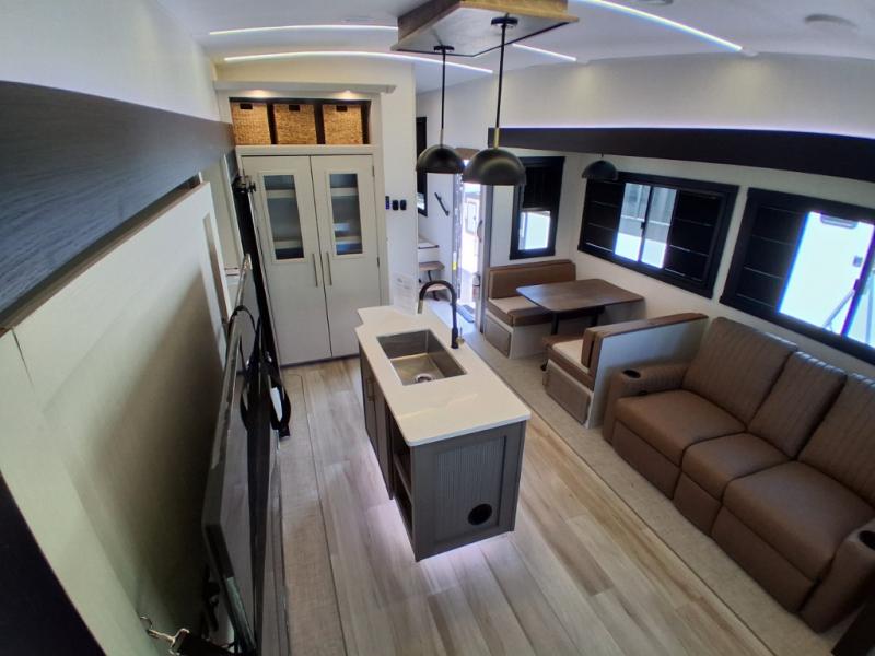 You won't know where to begin when you enter this fifth wheel! The rear living area has plenty of entertainment and seating choices between the tri-fold sofa and the theatre seating with cupholders, and the 50" LED TV will be perfect for movie nights. Meal prepping and clean up will be a breeze thanks to the kitchen island with a large sink, and the deluxe French door pantry that is big enough to store everyone's favorite snacks. Inside the middle bunkhouse, you will find a bunk with a Versa queen convertible bed/sofa below it and a loft above this room, plus there is a desk with a TV hookup and a dresser with a wardrobe. The outside also has lots of features you will love like the exterior storage with a refrigerator, the coax/TV hookup, two awnings and the Texas-sized pass-through storage area!