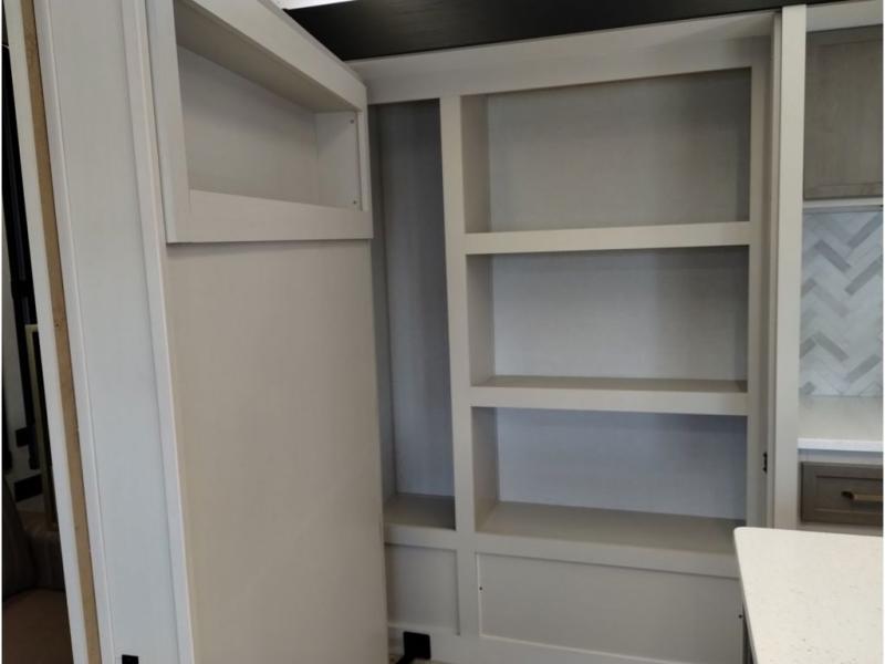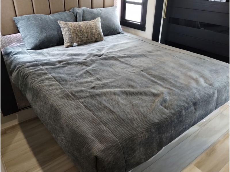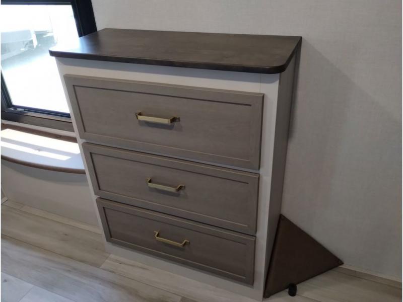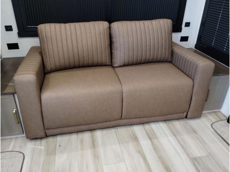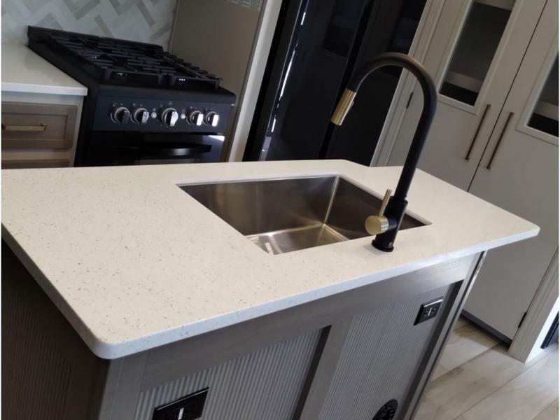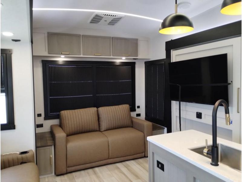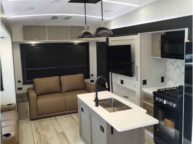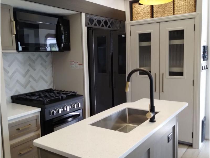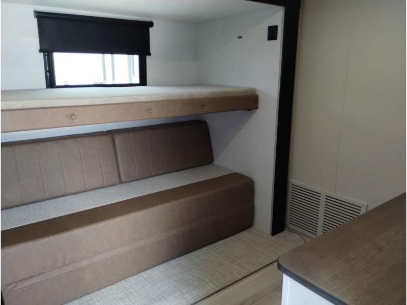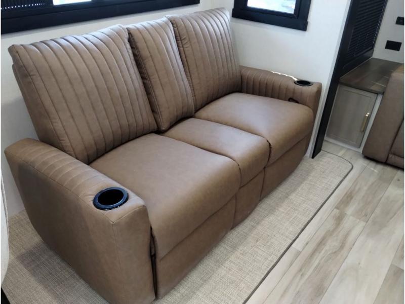 You won't know where to begin when you enter this fifth wheel! The rear living area has plenty of entertainment and seating choices between the tri-fold sofa and the theatre seating with cupholders, and the 50" LED TV will be perfect for movie nights. Meal prepping and clean up will be a breeze thanks to the kitchen island with a large sink, and the deluxe French door pantry that is big enough to store everyone's favorite snacks. Inside the middle bunkhouse, you will find a bunk with a Versa queen convertible bed/sofa below it and a loft above this room, plus there is a desk with a TV hookup and a dresser with a wardrobe. The outside also has lots of features you will love like the exterior storage with a refrigerator, the coax/TV hookup, two awnings and the Texas-sized pass-through storage area!
