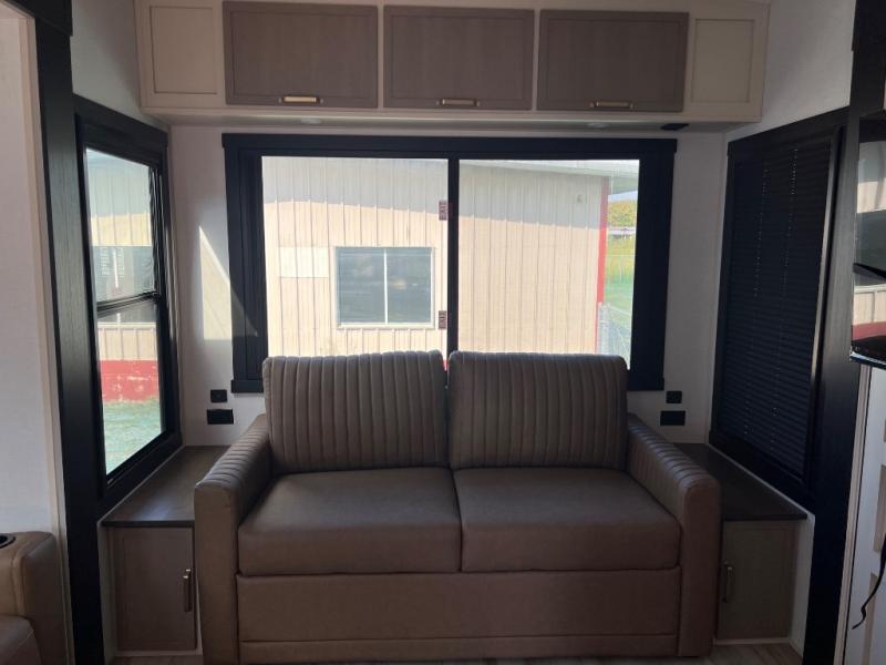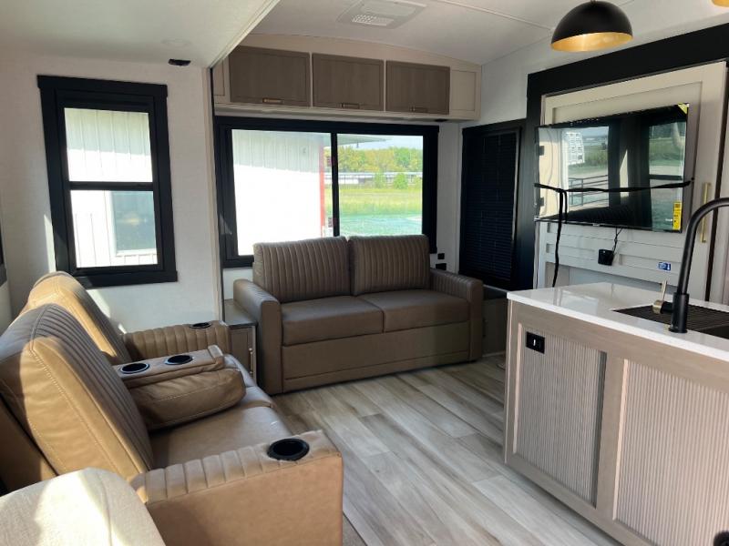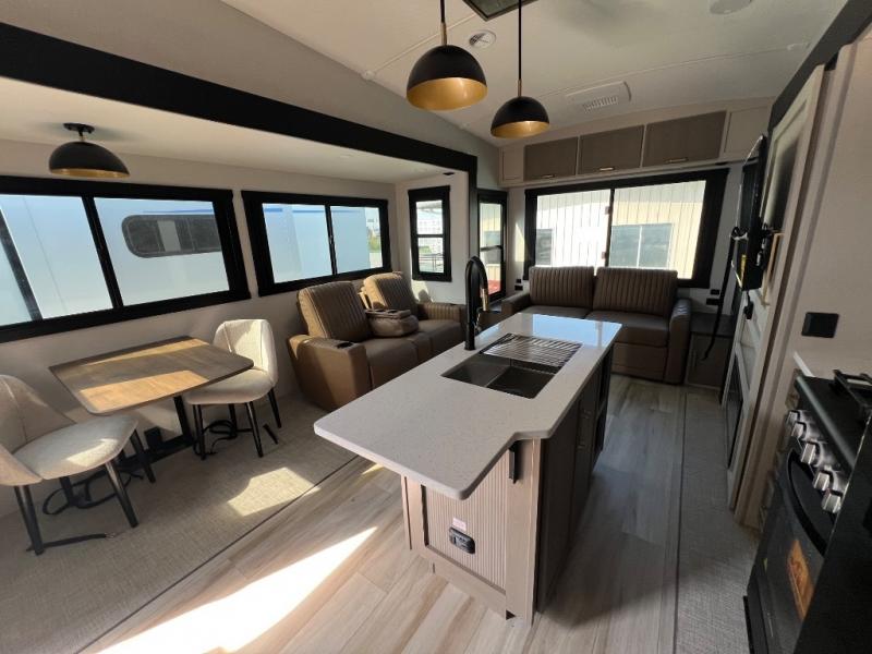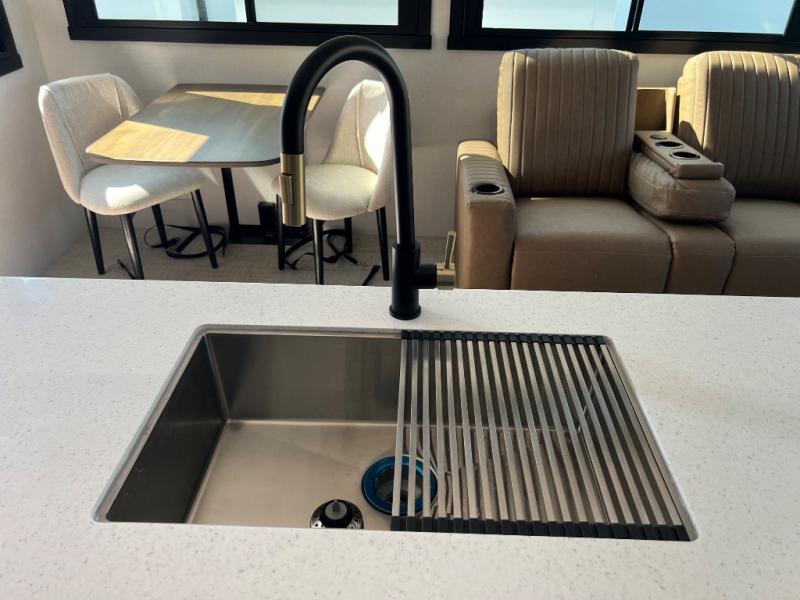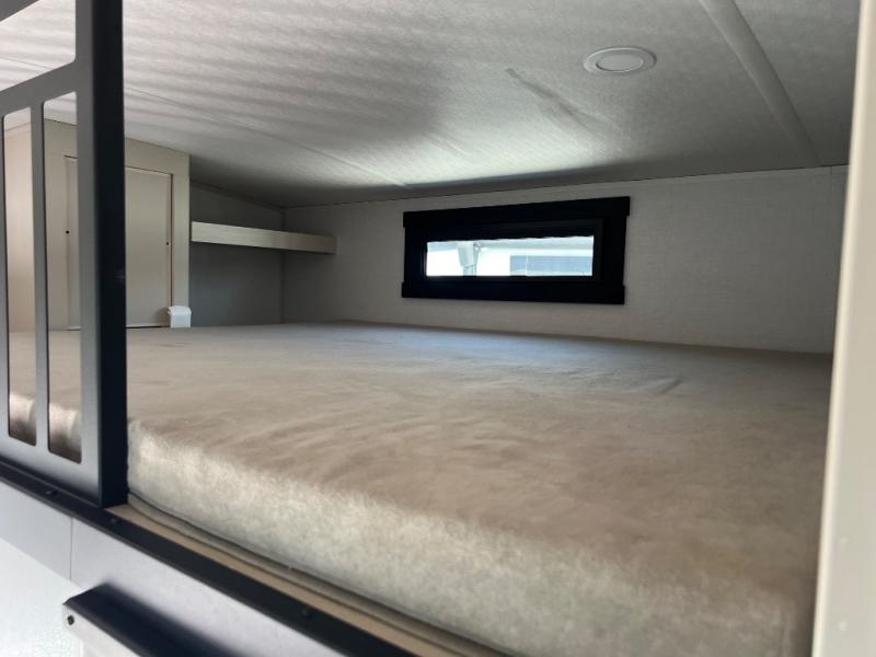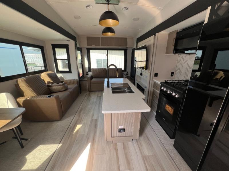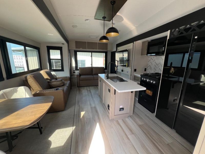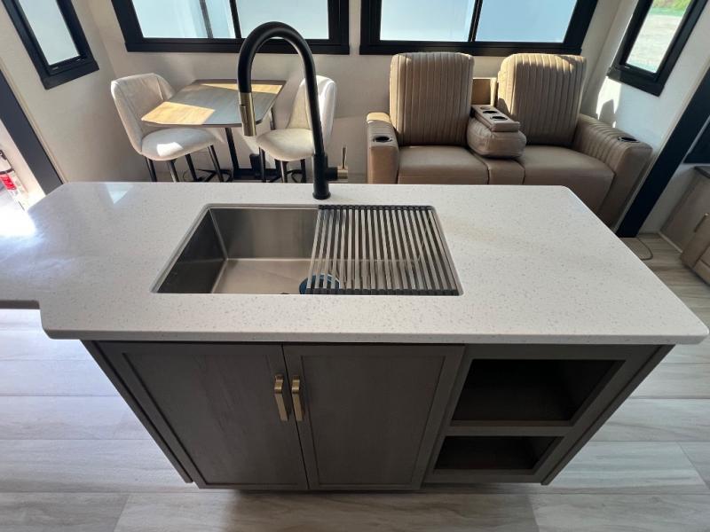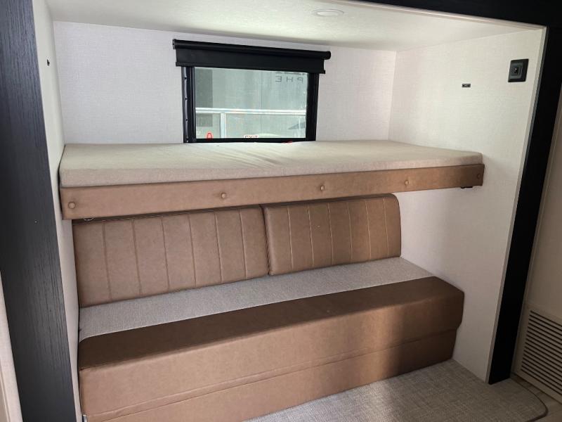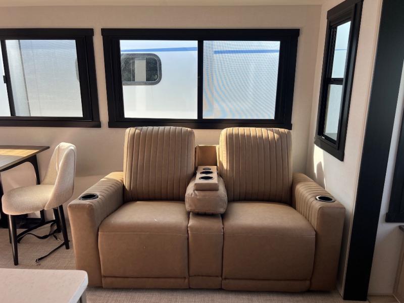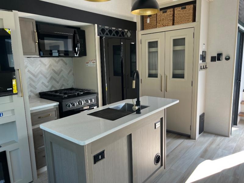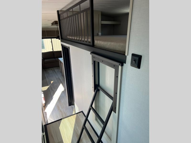 You won't know where to begin when you enter this fifth wheel! The rear living area has plenty of entertainment and seating choices between the tri-fold sofa and the theatre seating with cupholders, and the 50" LED TV will be perfect for movie nights. Meal prepping and clean up will be a breeze thanks to the kitchen island with a large sink, and the deluxe French door pantry that is big enough to store everyone's favorite snacks. Inside the middle bunkhouse, you will find a bunk with a Versa queen convertible bed/sofa below it and a loft above this room, plus there is a desk with a TV hookup and a dresser with a wardrobe. The outside also has lots of features you will love like the exterior storage with a refrigerator, the coax/TV hookup, two awnings and the Texas-sized pass-through storage area!