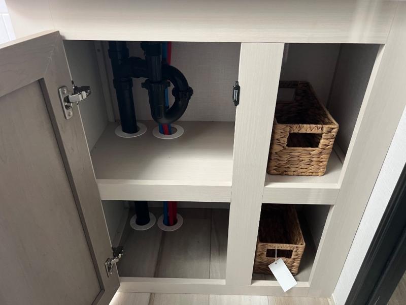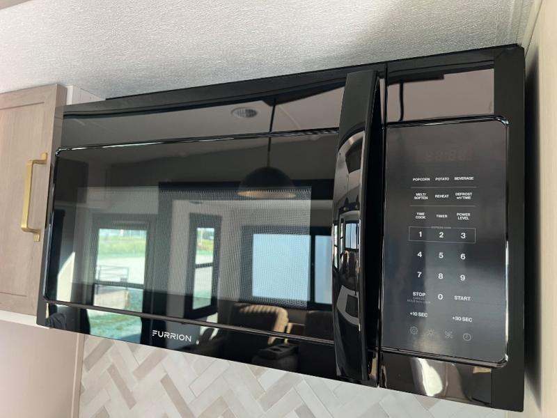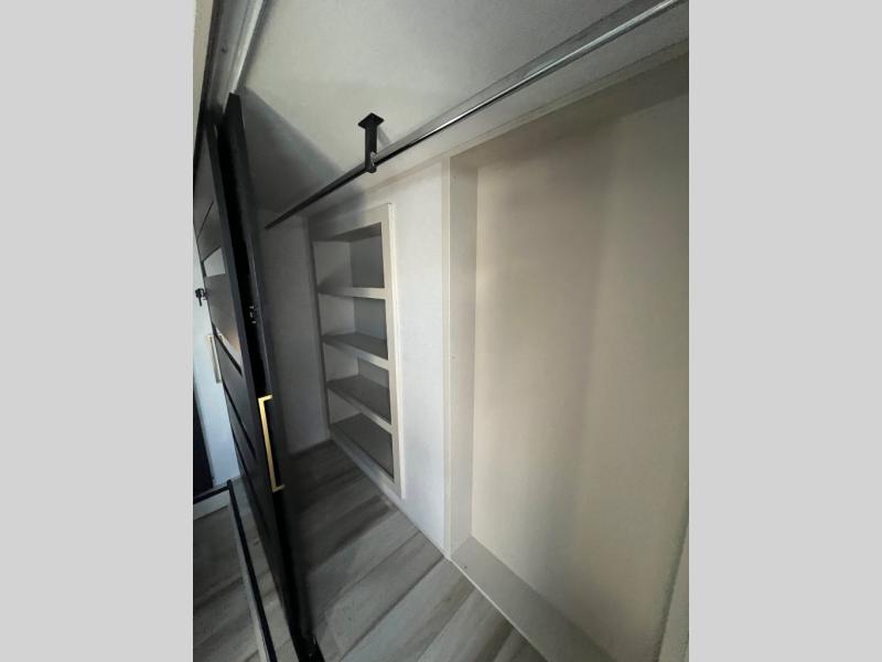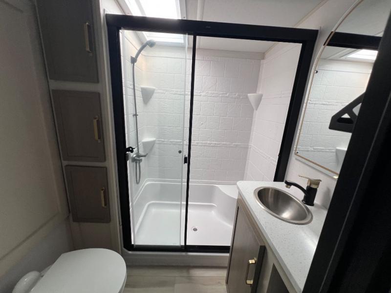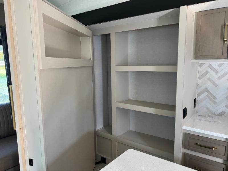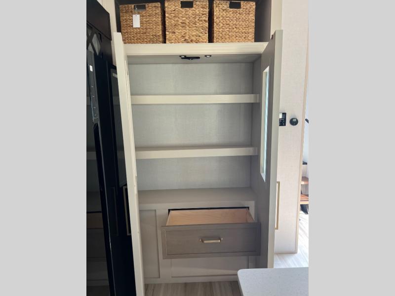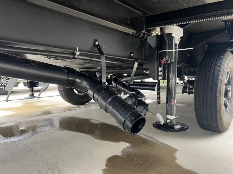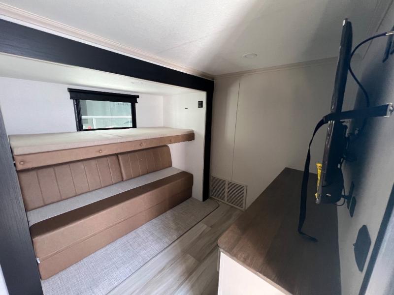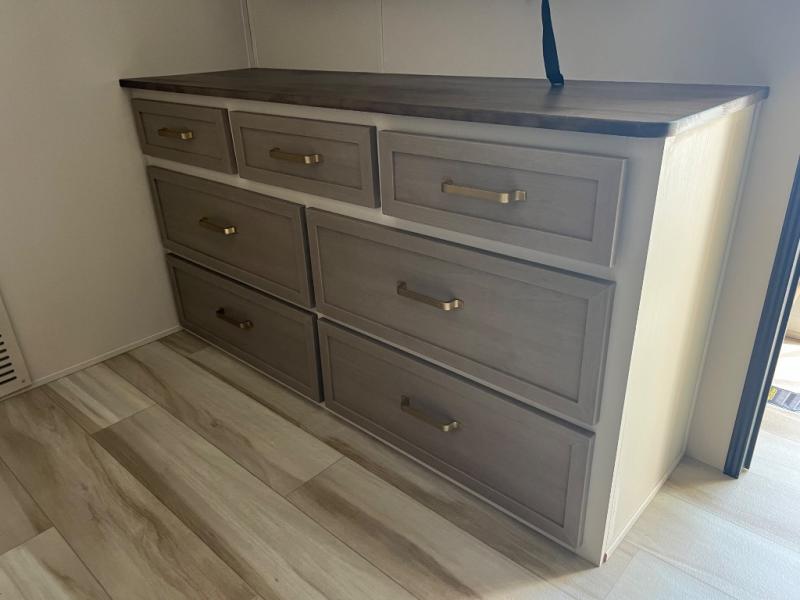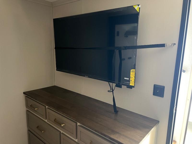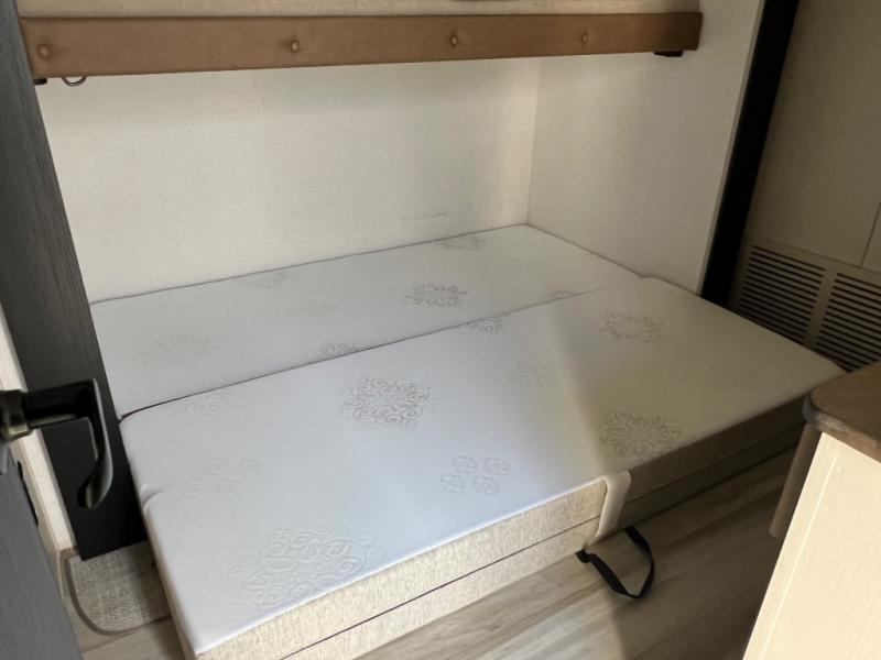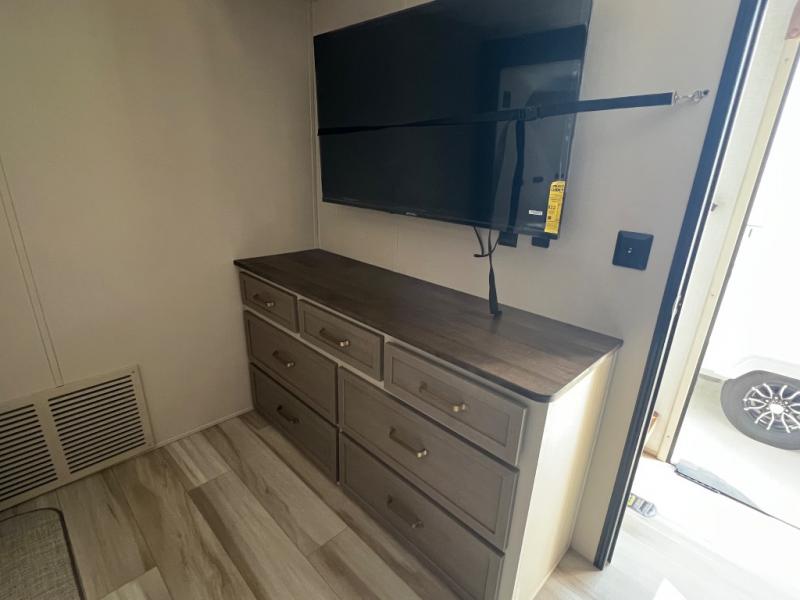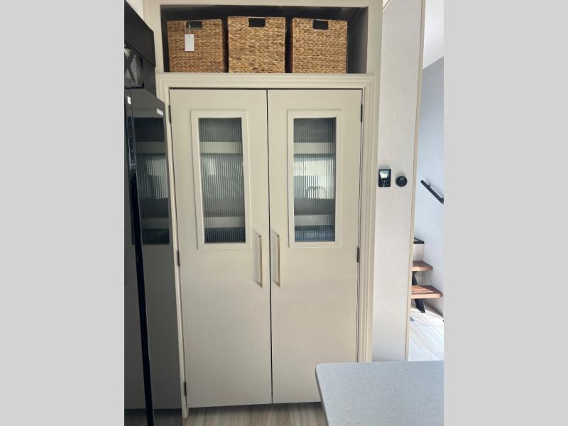 You won't know where to begin when you enter this fifth wheel! The rear living area has plenty of entertainment and seating choices between the tri-fold sofa and the theatre seating with cupholders, and the 50" LED TV will be perfect for movie nights. Meal prepping and clean up will be a breeze thanks to the kitchen island with a large sink, and the deluxe French door pantry that is big enough to store everyone's favorite snacks. Inside the middle bunkhouse, you will find a bunk with a Versa queen convertible bed/sofa below it and a loft above this room, plus there is a desk with a TV hookup and a dresser with a wardrobe. The outside also has lots of features you will love like the exterior storage with a refrigerator, the coax/TV hookup, two awnings and the Texas-sized pass-through storage area!