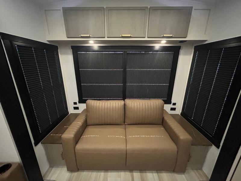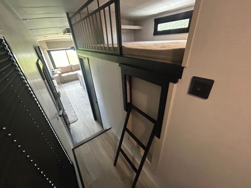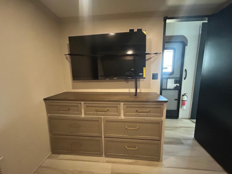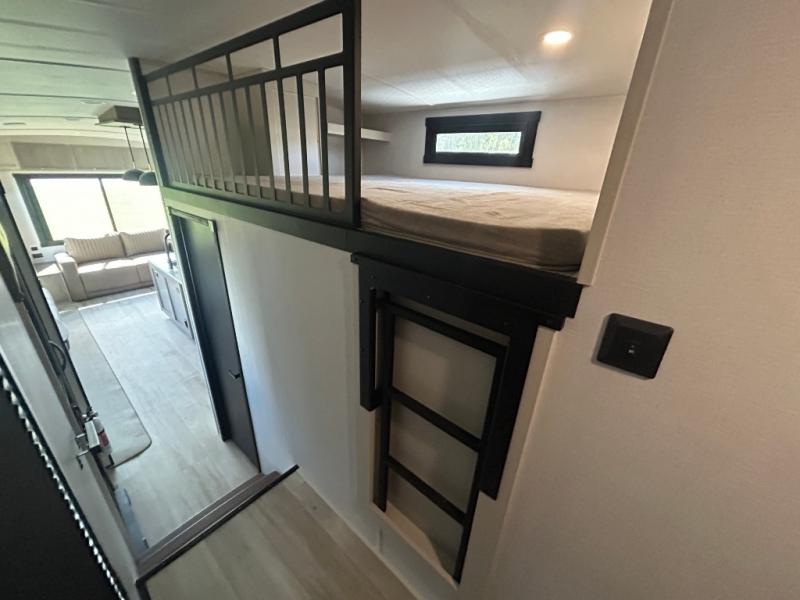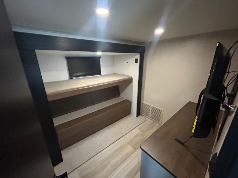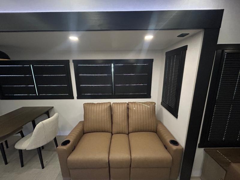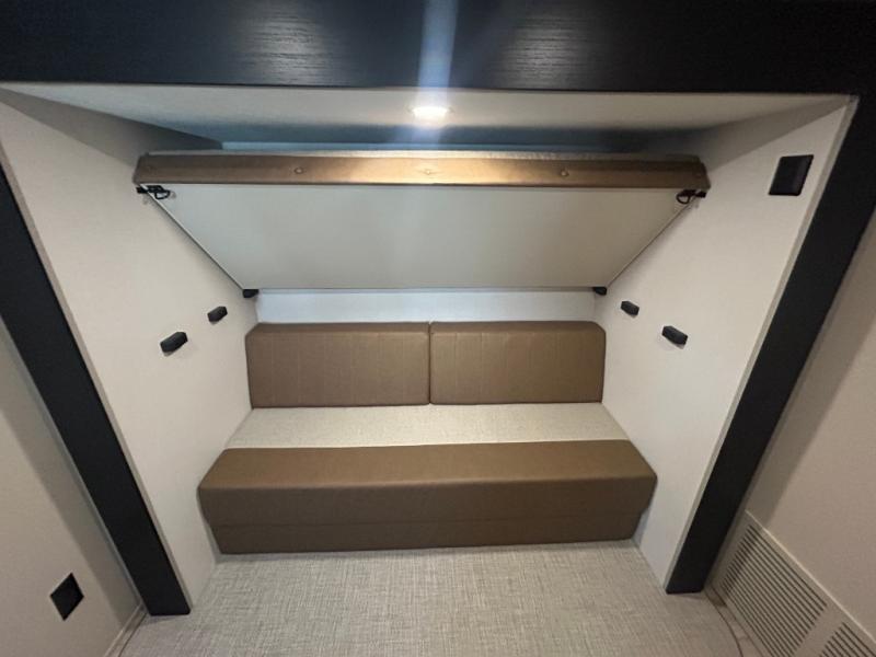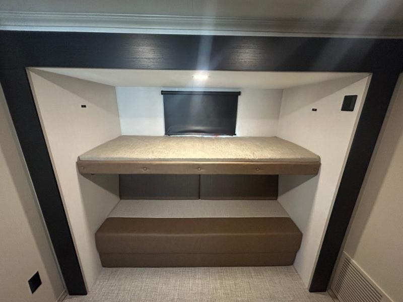 You won't know where to begin when you enter this fifth wheel! The rear living area has plenty of entertainment and seating choices between the tri-fold sofa and the theatre seating with cupholders, and the 50" LED TV will be perfect for movie nights. Meal prepping and clean up will be a breeze thanks to the kitchen island with a large sink, and the deluxe French door pantry that is big enough to store everyone's favorite snacks. Inside the middle bunkhouse, you will find a bunk with a Versa queen convertible bed/sofa below it and a loft above this room, plus there is a desk with a TV hookup and a dresser with a wardrobe. The outside also has lots of features you will love like the exterior storage with a refrigerator, the coax/TV hookup, two awnings and the Texas-sized pass-through storage area!