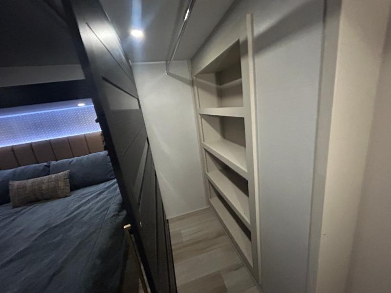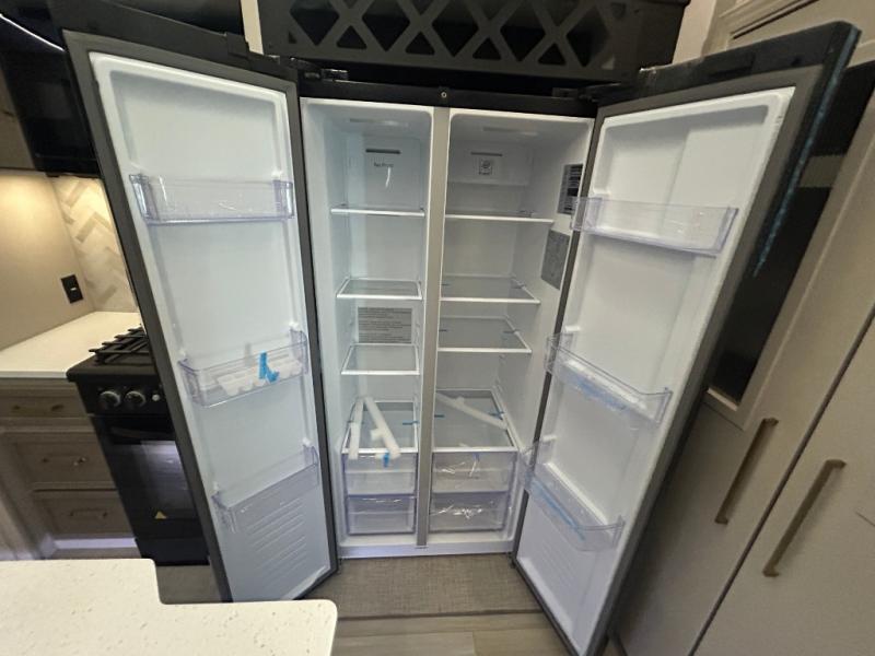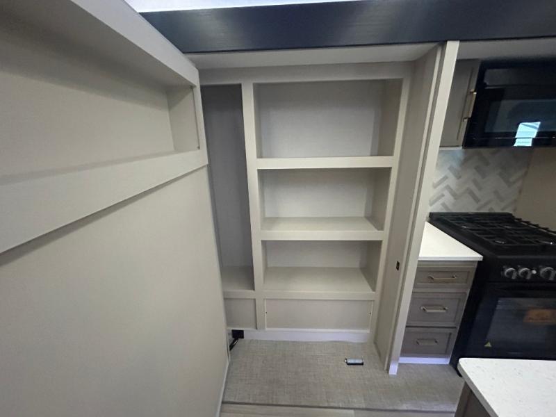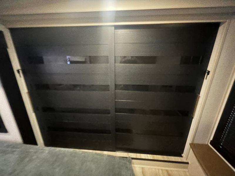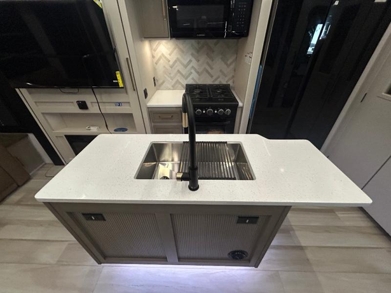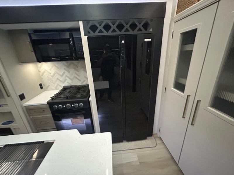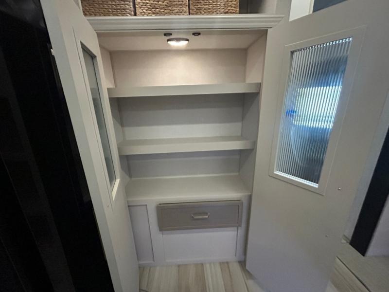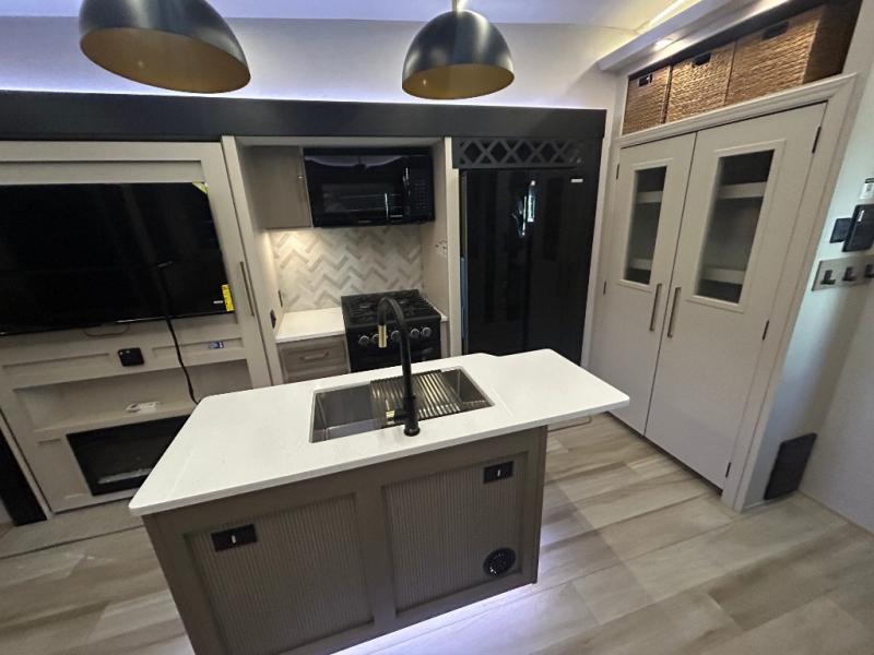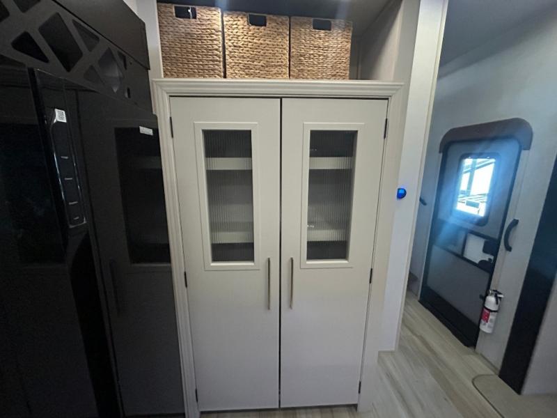 You won't know where to begin when you enter this fifth wheel! The rear living area has plenty of entertainment and seating choices between the tri-fold sofa and the theatre seating with cupholders, and the 50" LED TV will be perfect for movie nights. Meal prepping and clean up will be a breeze thanks to the kitchen island with a large sink, and the deluxe French door pantry that is big enough to store everyone's favorite snacks. Inside the middle bunkhouse, you will find a bunk with a Versa queen convertible bed/sofa below it and a loft above this room, plus there is a desk with a TV hookup and a dresser with a wardrobe. The outside also has lots of features you will love like the exterior storage with a refrigerator, the coax/TV hookup, two awnings and the Texas-sized pass-through storage area!