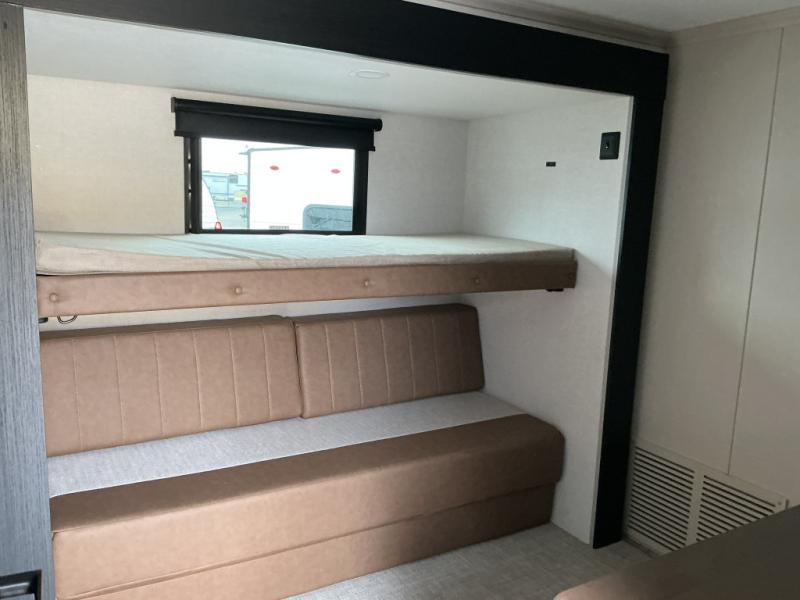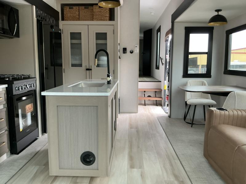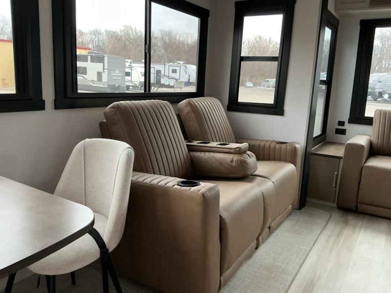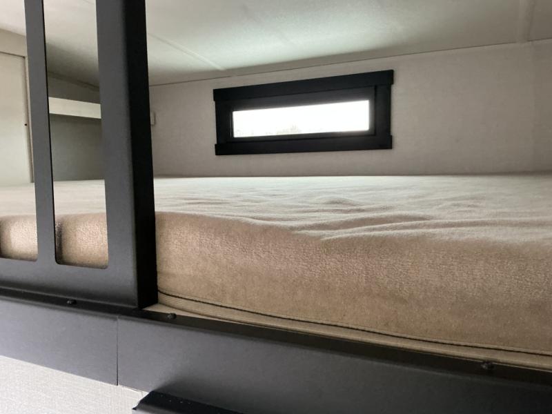 You won't know where to begin when you enter this fifth wheel! The rear living area has plenty of entertainment and seating choices between the tri-fold sofa and the theatre seating with cupholders, and the 50" LED TV will be perfect for movie nights. Meal prepping and clean up will be a breeze thanks to the kitchen island with a large sink, and the deluxe French door pantry that is big enough to store everyone's favorite snacks. Inside the middle bunkhouse, you will find a bunk with a Versa queen convertible bed/sofa below it and a loft above this room, plus there is a desk with a TV hookup and a dresser with a wardrobe. The outside also has lots of features you will love like the exterior storage with a refrigerator, the coax/TV hookup, two awnings and the Texas-sized pass-through storage area!