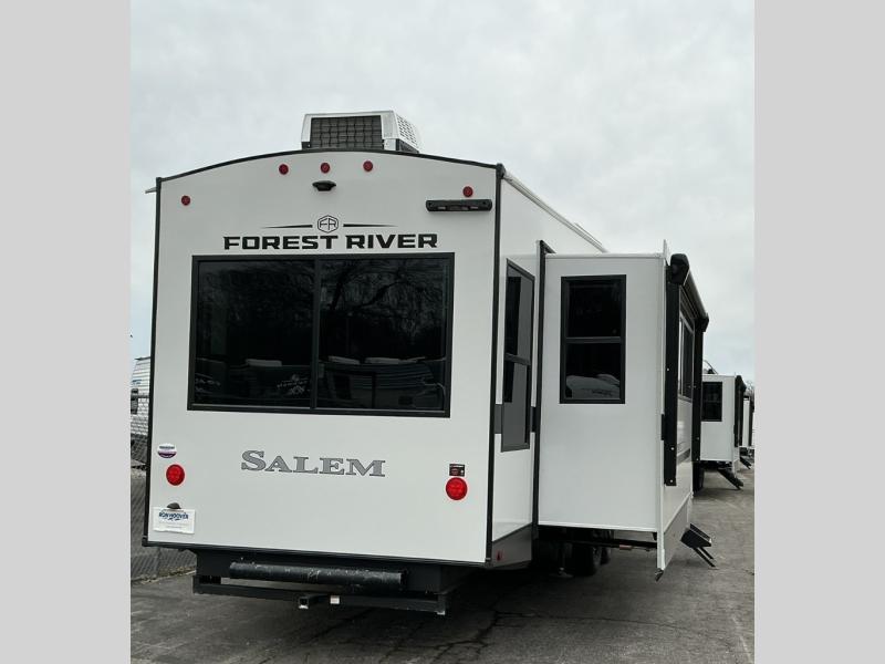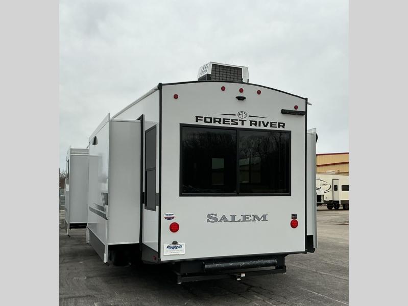 The Salem Hemisphere fifth wheels by Forest River are packed with features, while still being value-minded! Each model is constructed with laminated "Aluma Frame" sidewalls and floor with block foam insulation plus full-length barreled ceilings for added head space. There are LED awning, marker and taillights outside, along with an extra-large pass-thru storage with slam latch baggage doors, plus solar prep and Lippert On-The-Go ladder prep. The 60K on-demand tankless water heater will provide endless hot showers, and the JBL sound system includes a head unit plus interior and exterior speakers to keep the party going. There are also many interior comforts found throughout that will make you feel right at home!