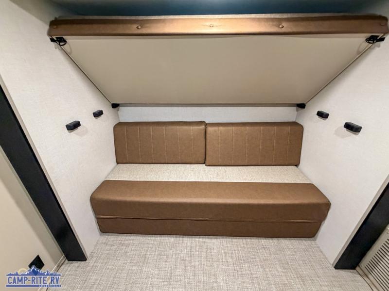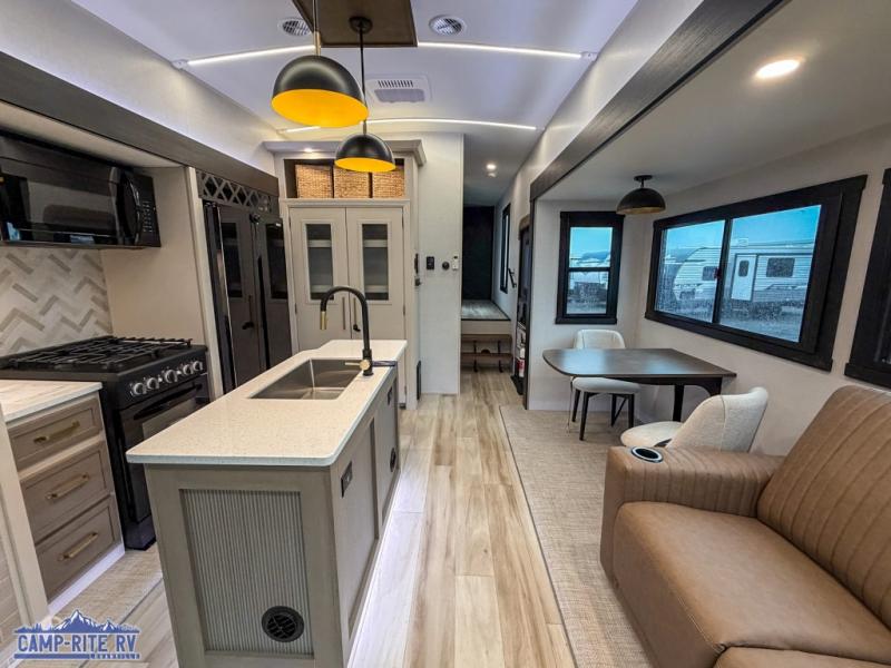 You won't know where to begin when you enter this fifth wheel! The rear living area has plenty of entertainment and seating choices between the tri-fold sofa and the theatre seating with cupholders, and the 50" LED TV will be perfect for movie nights. Meal prepping and clean up will be a breeze thanks to the kitchen island with a large sink, and the deluxe French door pantry that is big enough to store everyone's favorite snacks. Inside the middle bunkhouse, you will find a bunk with a Versa queen convertible bed/sofa below it and a loft above this room, plus there is a desk with a TV hookup and a dresser with a wardrobe. The outside also has lots of features you will love like the exterior storage with a refrigerator, the coax/TV hookup, two awnings and the Texas-sized pass-through storage area!