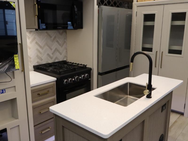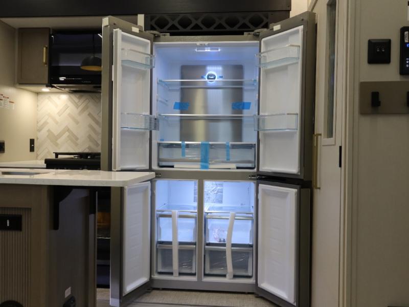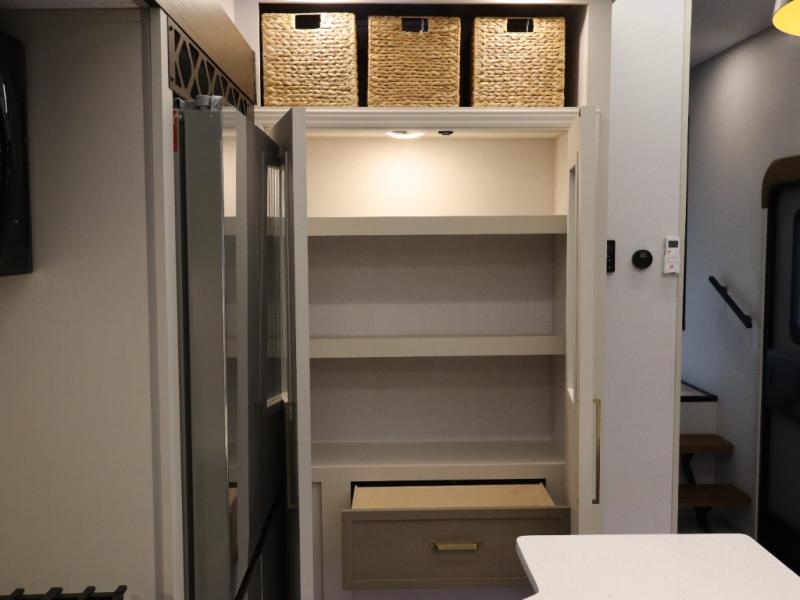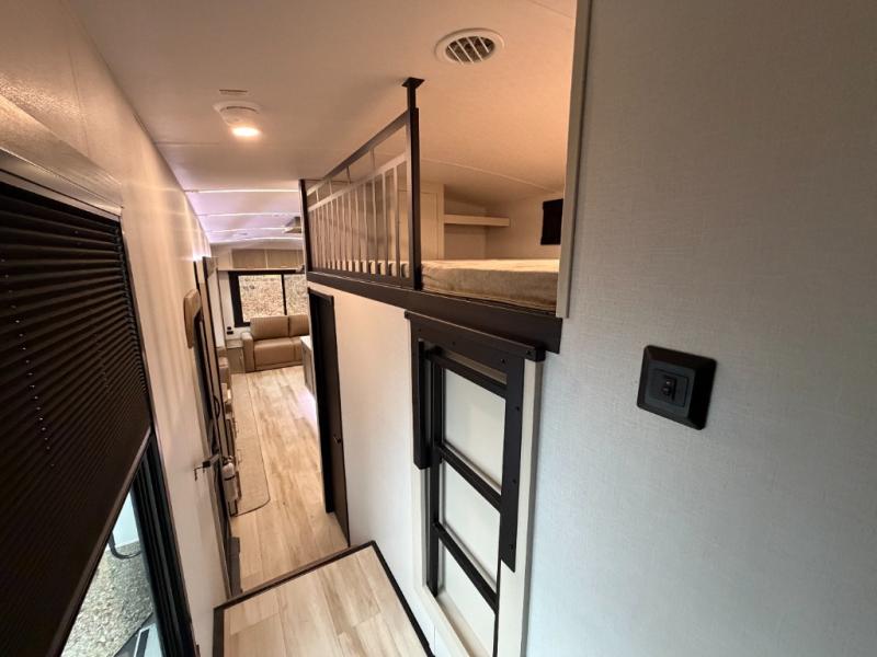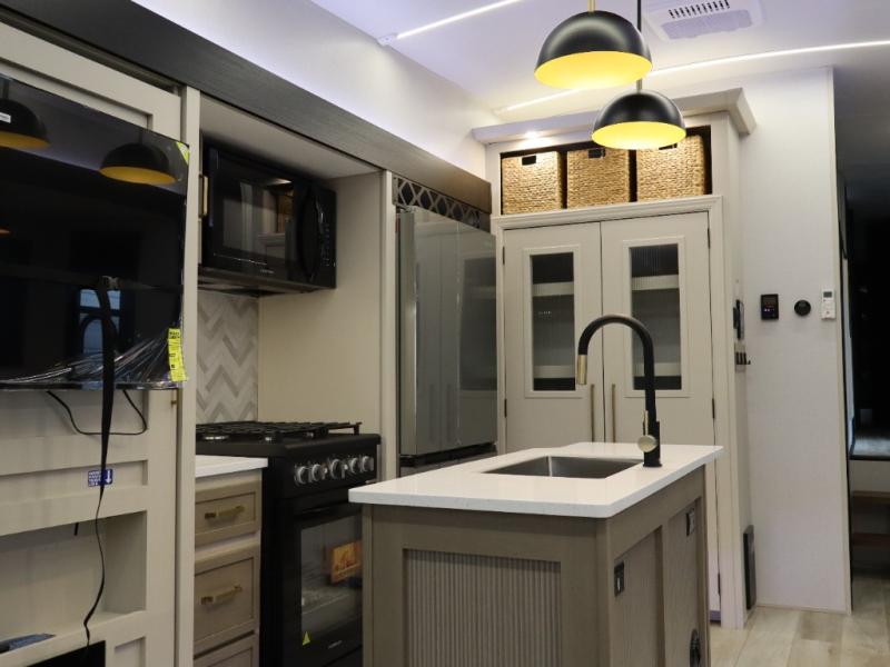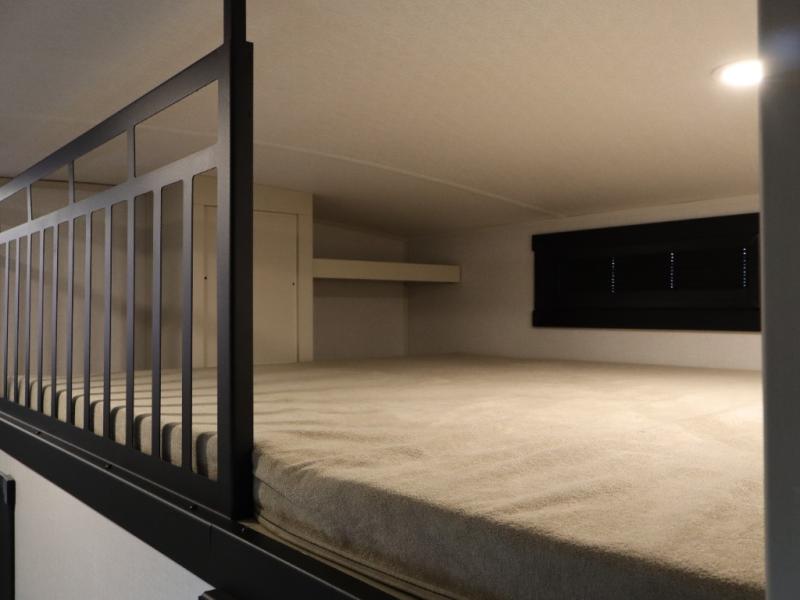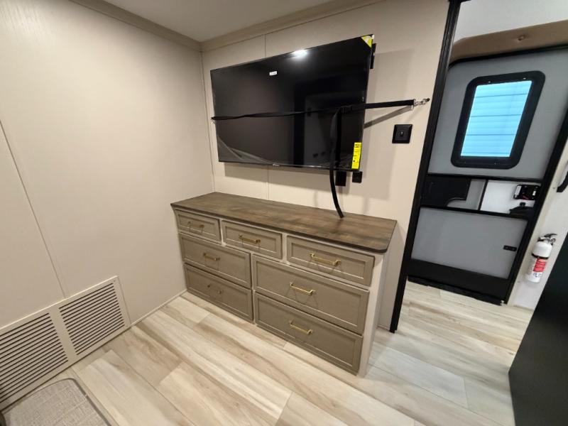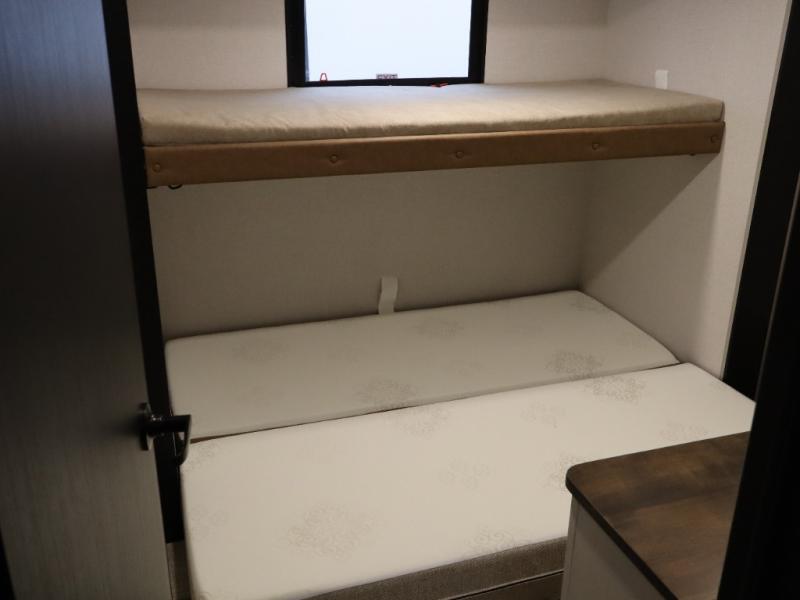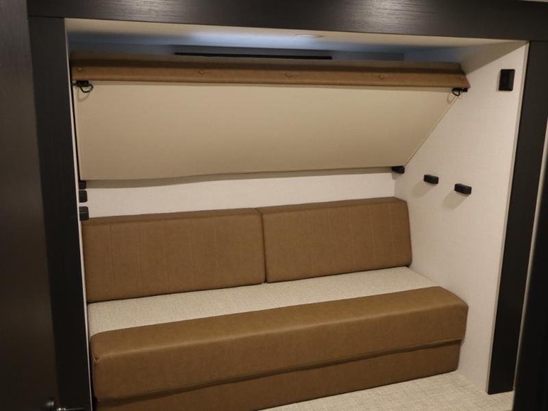 You won't know where to begin when you enter this fifth wheel! The rear living area has plenty of entertainment and seating choices between the tri-fold sofa and the theatre seating with cupholders, and the 50" LED TV will be perfect for movie nights. Meal prepping and clean up will be a breeze thanks to the kitchen island with a large sink, and the deluxe French door pantry that is big enough to store everyone's favorite snacks. Inside the middle bunkhouse, you will find a bunk with a Versa queen convertible bed/sofa below it and a loft above this room, plus there is a desk with a TV hookup and a dresser with a wardrobe. The outside also has lots of features you will love like the exterior storage with a refrigerator, the coax/TV hookup, two awnings and the Texas-sized pass-through storage area!