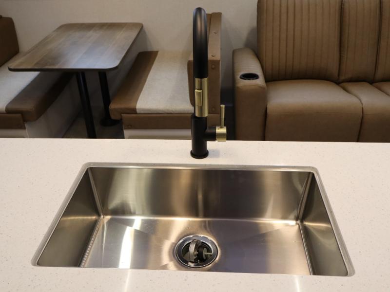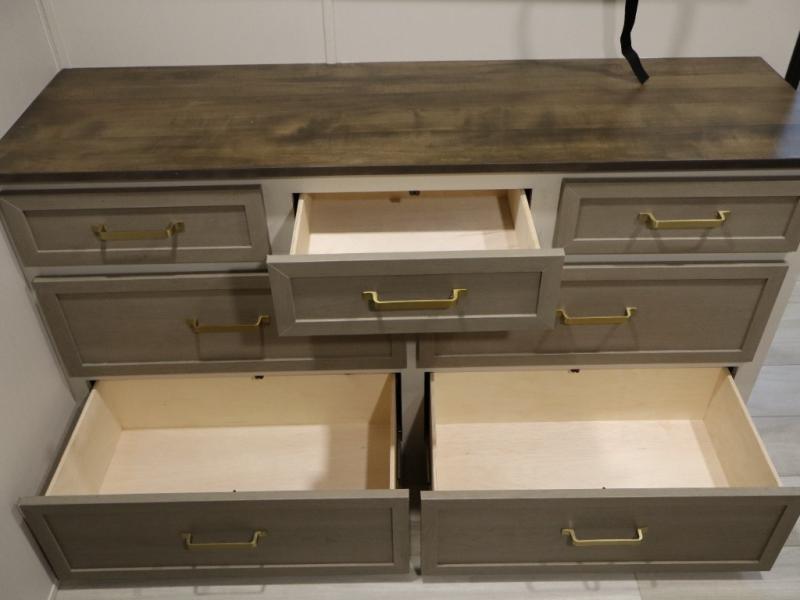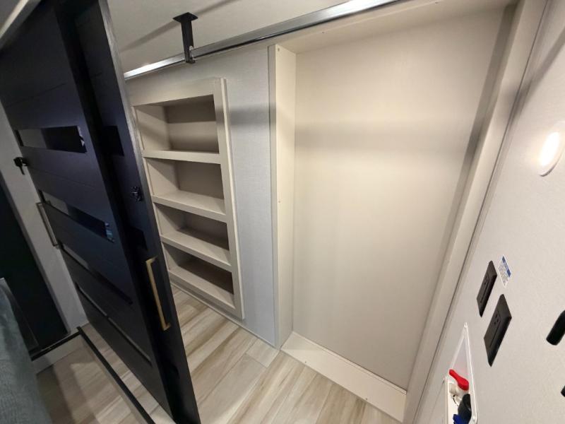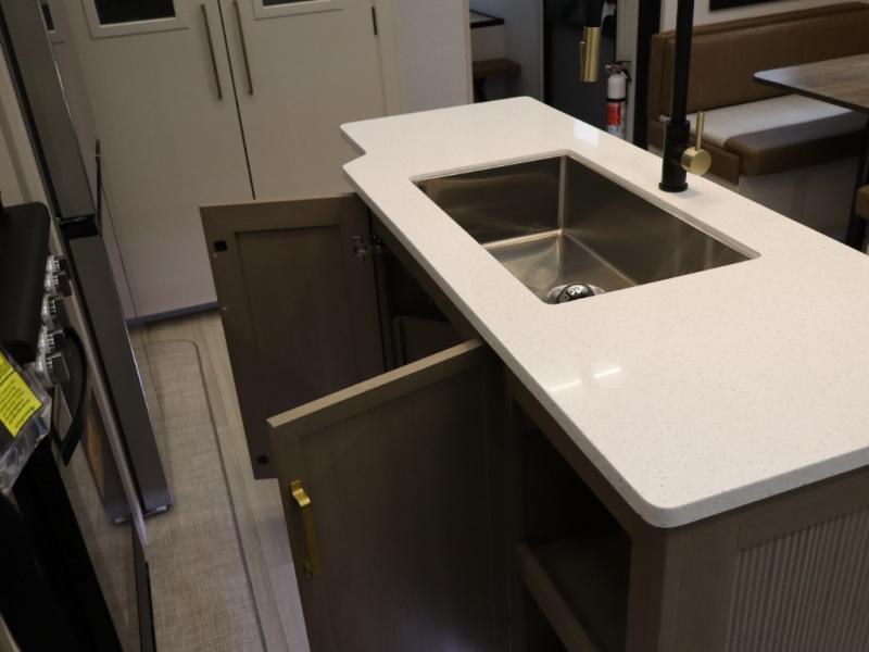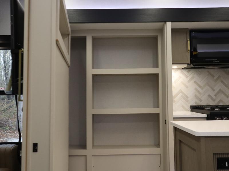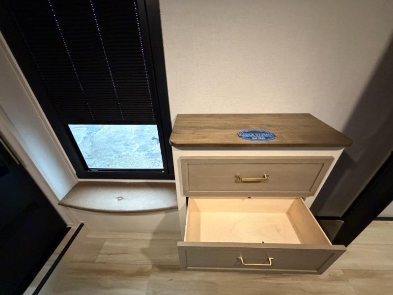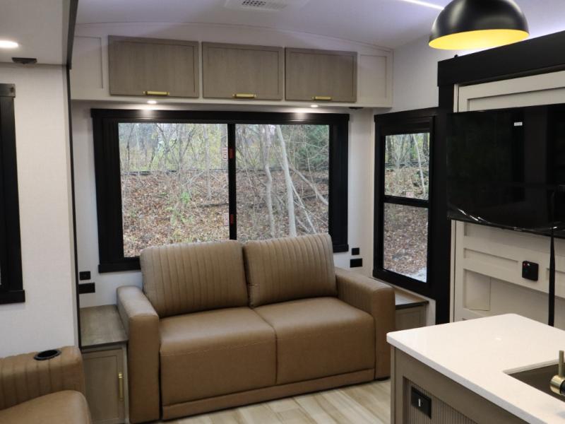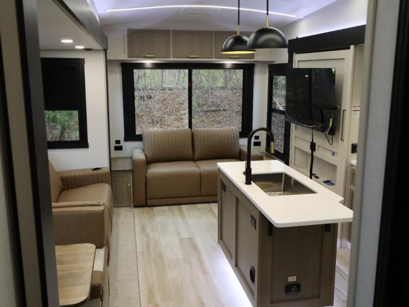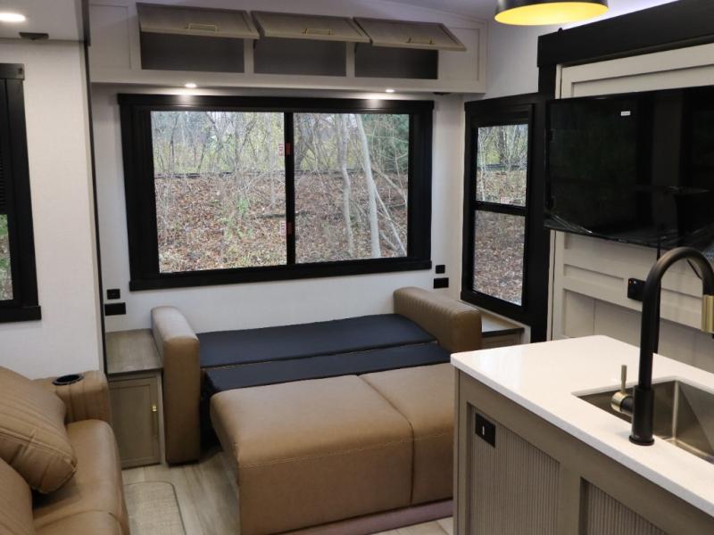 You won't know where to begin when you enter this fifth wheel! The rear living area has plenty of entertainment and seating choices between the tri-fold sofa and the theatre seating with cupholders, and the 50" LED TV will be perfect for movie nights. Meal prepping and clean up will be a breeze thanks to the kitchen island with a large sink, and the deluxe French door pantry that is big enough to store everyone's favorite snacks. Inside the middle bunkhouse, you will find a bunk with a Versa queen convertible bed/sofa below it and a loft above this room, plus there is a desk with a TV hookup and a dresser with a wardrobe. The outside also has lots of features you will love like the exterior storage with a refrigerator, the coax/TV hookup, two awnings and the Texas-sized pass-through storage area!