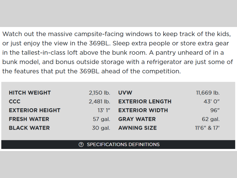 | Awning Info | 11'6" & 17' Electric with LED Lights |