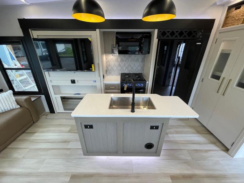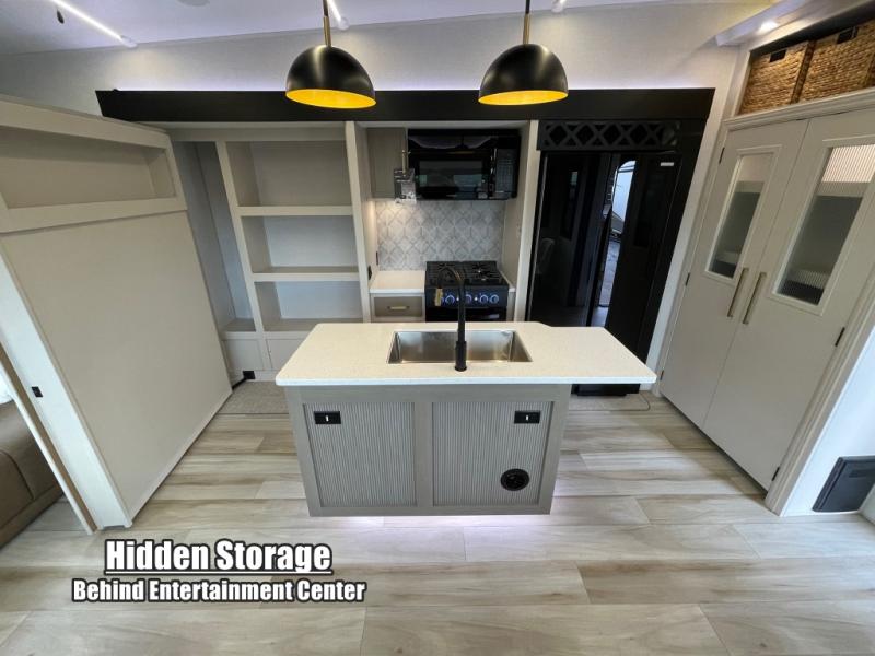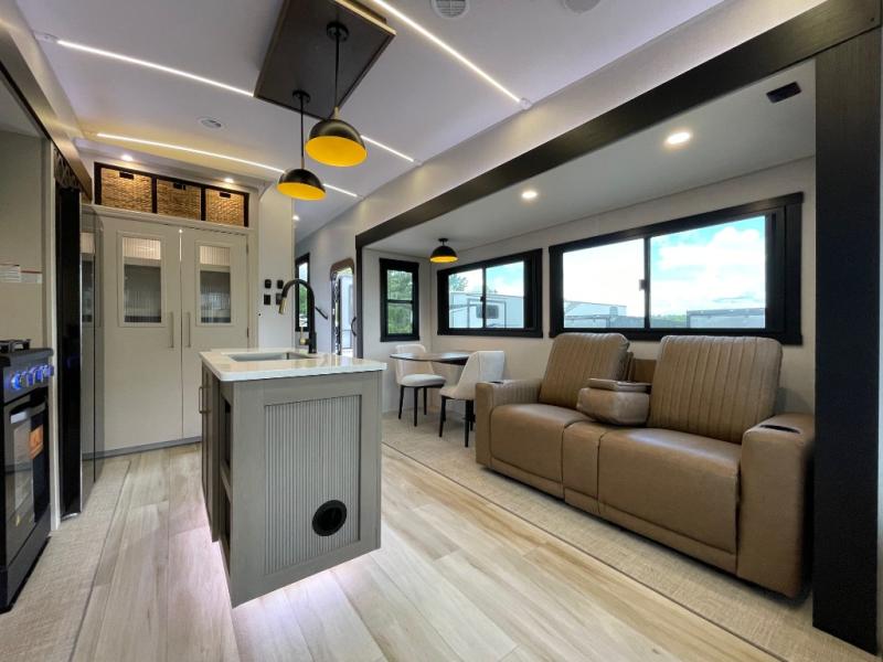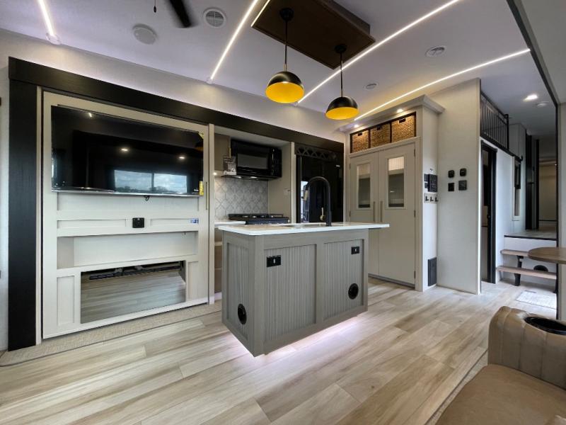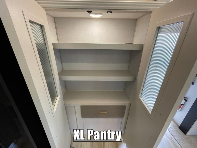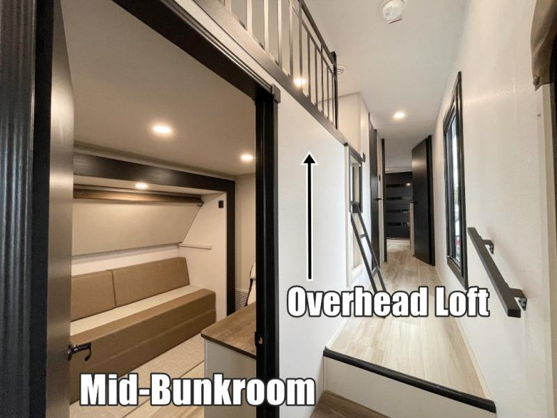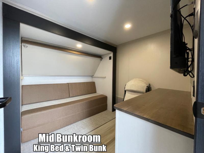 You won't know where to begin when you enter this fifth wheel! The rear living area has plenty of entertainment and seating choices between the tri-fold sofa and the theatre seating with cupholders, and the 50" LED TV will be perfect for movie nights. Meal prepping and clean up will be a breeze thanks to the kitchen island with a large sink, and the deluxe French door pantry that is big enough to store everyone's favorite snacks. Inside the middle bunkhouse, you will find a bunk with a Versa queen convertible bed/sofa below it and a loft above this room, plus there is a desk with a TV hookup and a dresser with a wardrobe. The outside also has lots of features you will love like the exterior storage with a refrigerator, the coax/TV hookup, two awnings and the Texas-sized pass-through storage area!