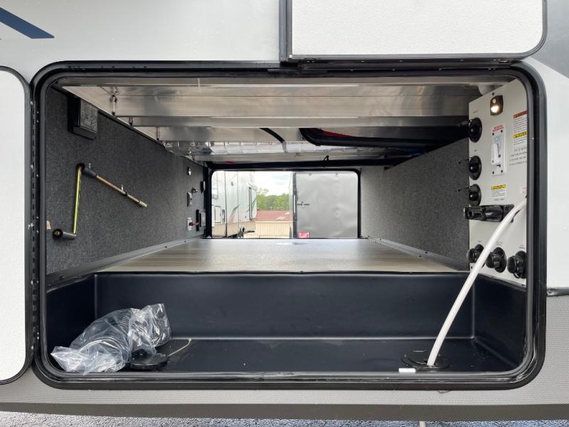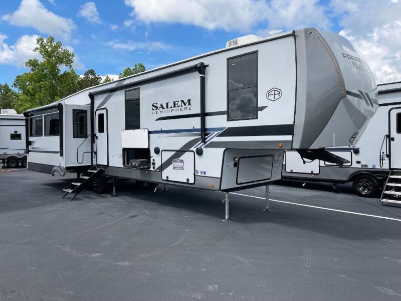 The Salem Hemisphere fifth wheels by Forest River are packed with features, while still being value-minded! Each model is constructed with laminated "Aluma Frame" sidewalls and floor with block foam insulation plus full-length barreled ceilings for added head space. There are LED awning, marker and taillights outside, along with an extra-large pass-thru storage with slam latch baggage doors, plus solar prep and Lippert On-The-Go ladder prep. The 60K on-demand tankless water heater will provide endless hot showers, and the JBL sound system includes a head unit plus interior and exterior speakers to keep the party going. There are also many interior comforts found throughout that will make you feel right at home!