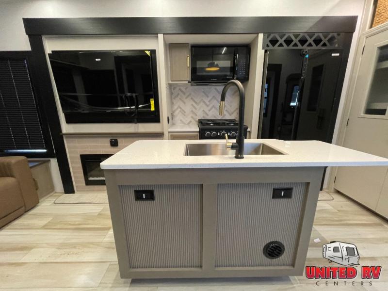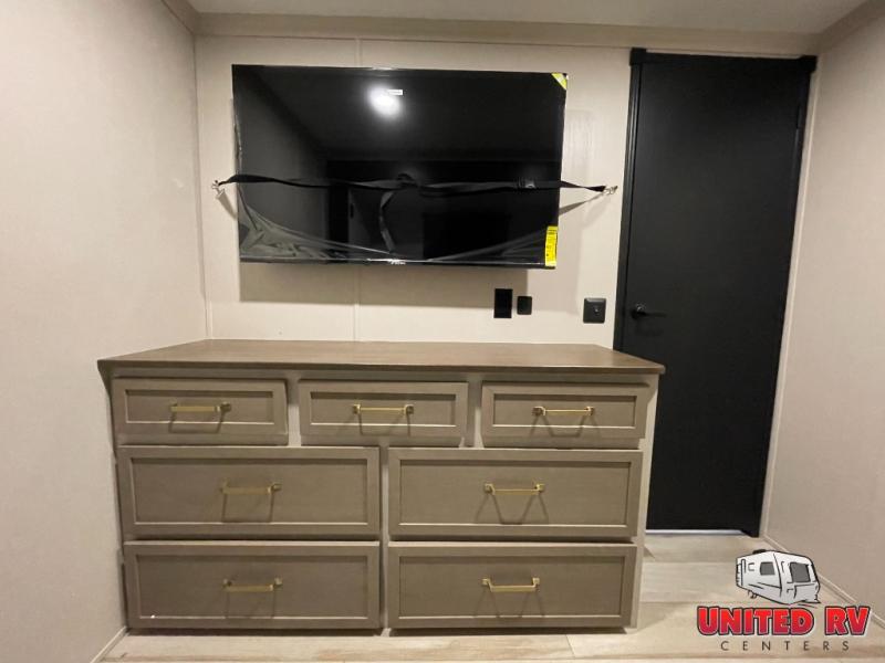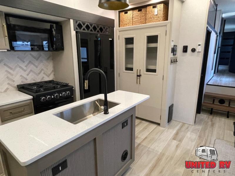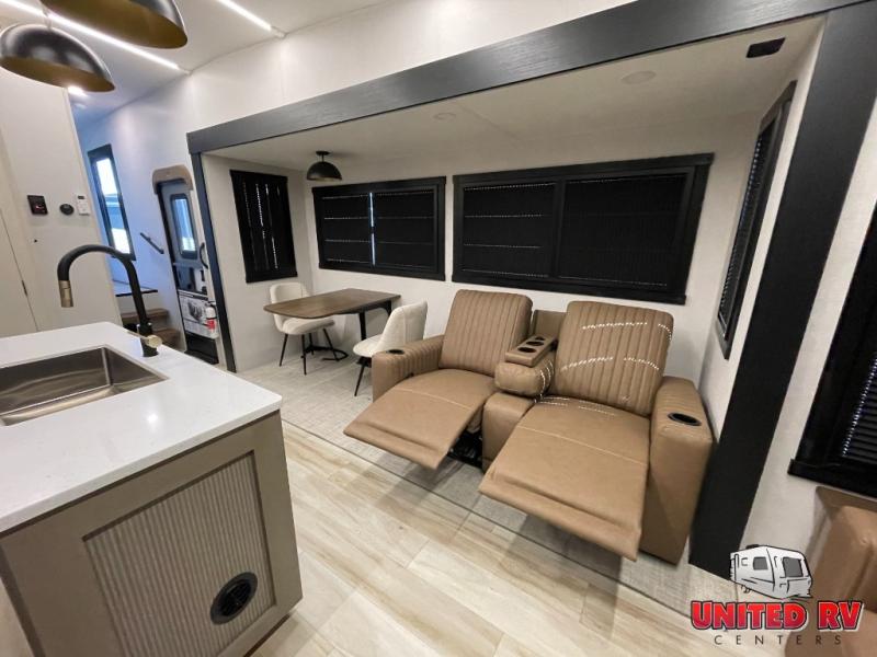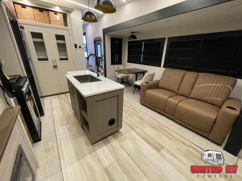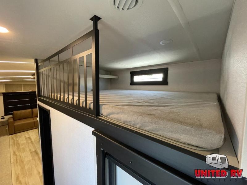 You won't know where to begin when you enter this fifth wheel! The rear living area has plenty of entertainment and seating choices between the tri-fold sofa and the theatre seating with cupholders, and the 50" LED TV will be perfect for movie nights. Meal prepping and clean up will be a breeze thanks to the kitchen island with a large sink, and the deluxe French door pantry that is big enough to store everyone's favorite snacks. Inside the middle bunkhouse, you will find a bunk with a Versa queen convertible bed/sofa below it and a loft above this room, plus there is a desk with a TV hookup and a dresser with a wardrobe. The outside also has lots of features you will love like the exterior storage with a refrigerator, the coax/TV hookup, two awnings and the Texas-sized pass-through storage area!