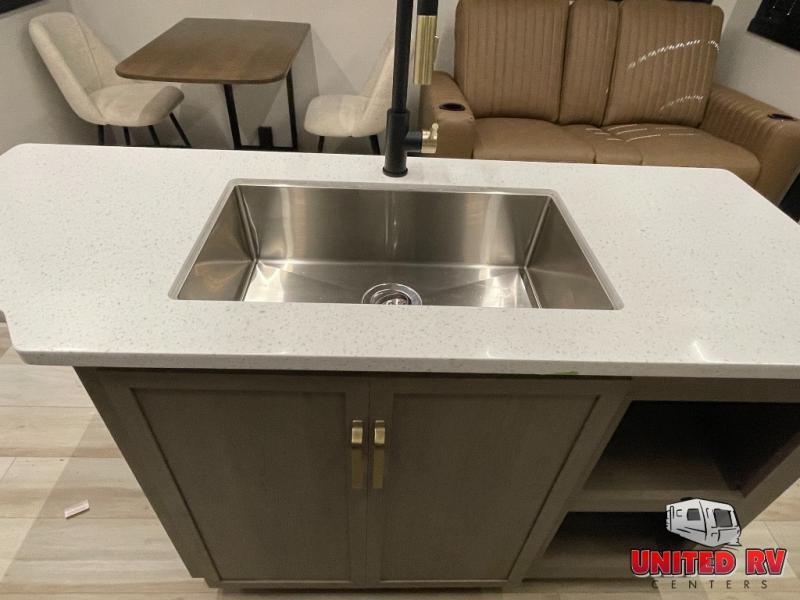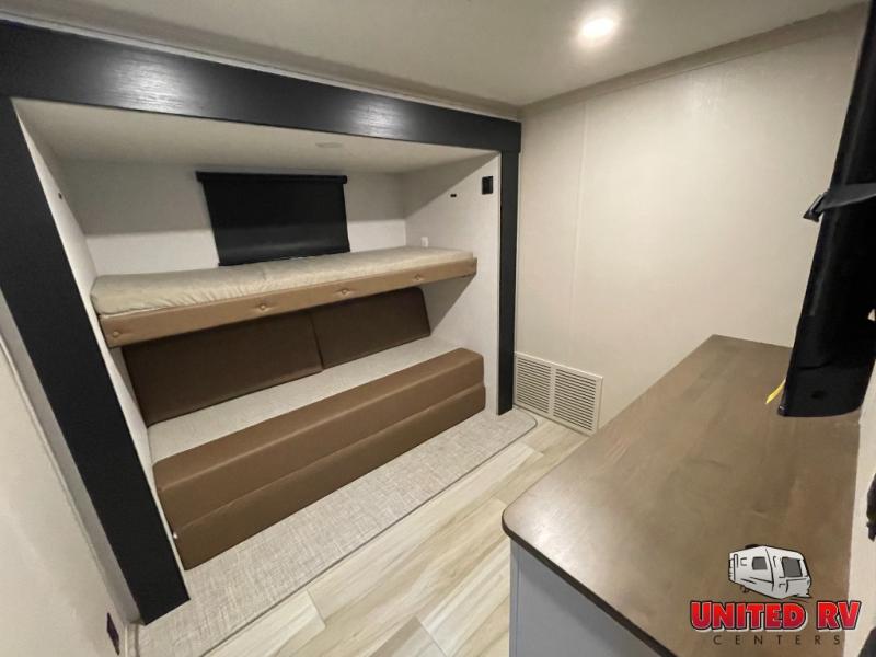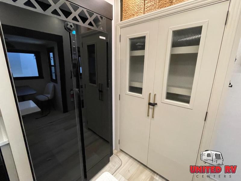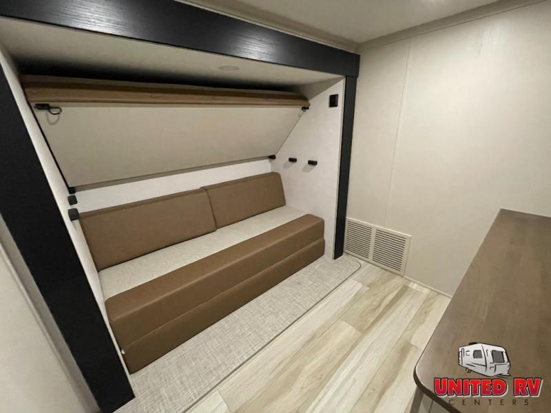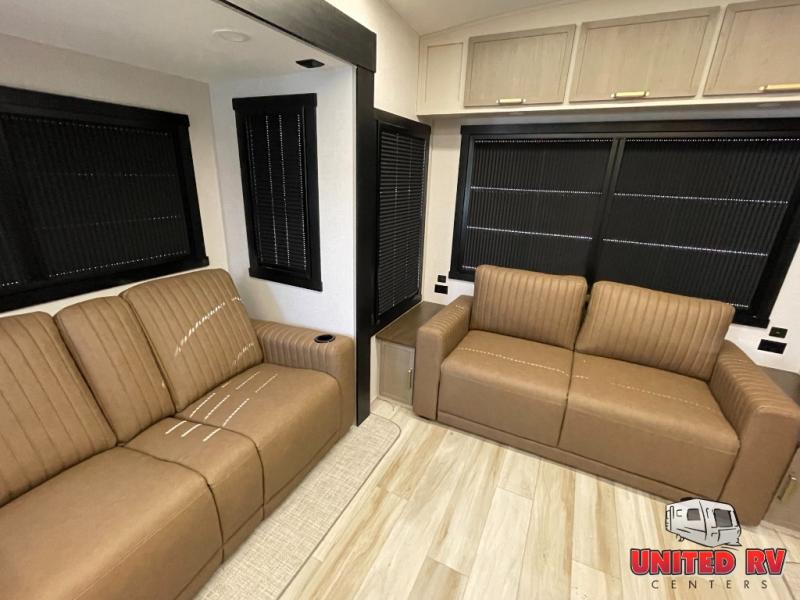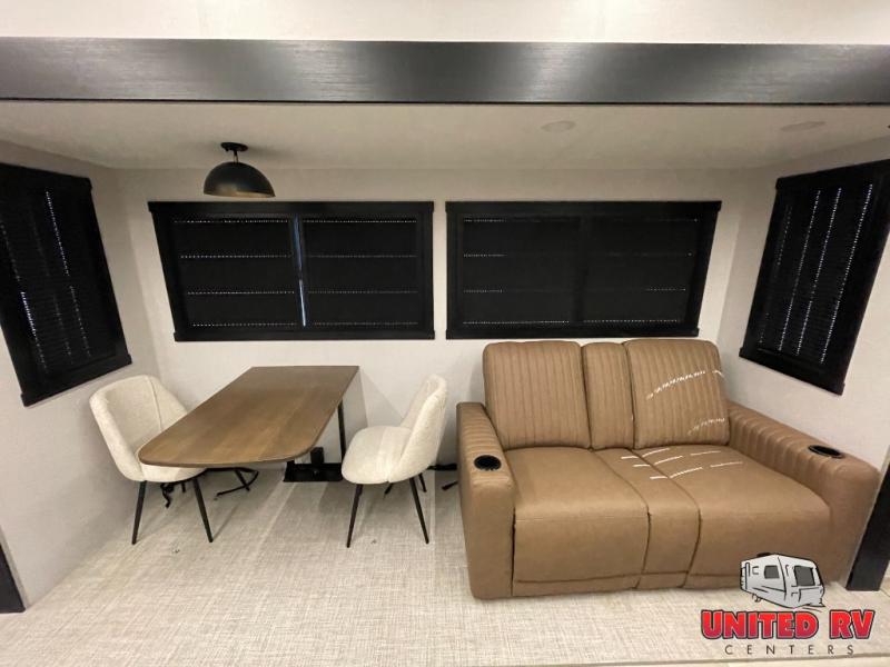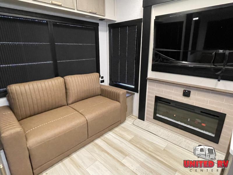 You won't know where to begin when you enter this fifth wheel! The rear living area has plenty of entertainment and seating choices between the tri-fold sofa and the theatre seating with cupholders, and the 50" LED TV will be perfect for movie nights. Meal prepping and clean up will be a breeze thanks to the kitchen island with a large sink, and the deluxe French door pantry that is big enough to store everyone's favorite snacks. Inside the middle bunkhouse, you will find a bunk with a Versa queen convertible bed/sofa below it and a loft above this room, plus there is a desk with a TV hookup and a dresser with a wardrobe. The outside also has lots of features you will love like the exterior storage with a refrigerator, the coax/TV hookup, two awnings and the Texas-sized pass-through storage area!