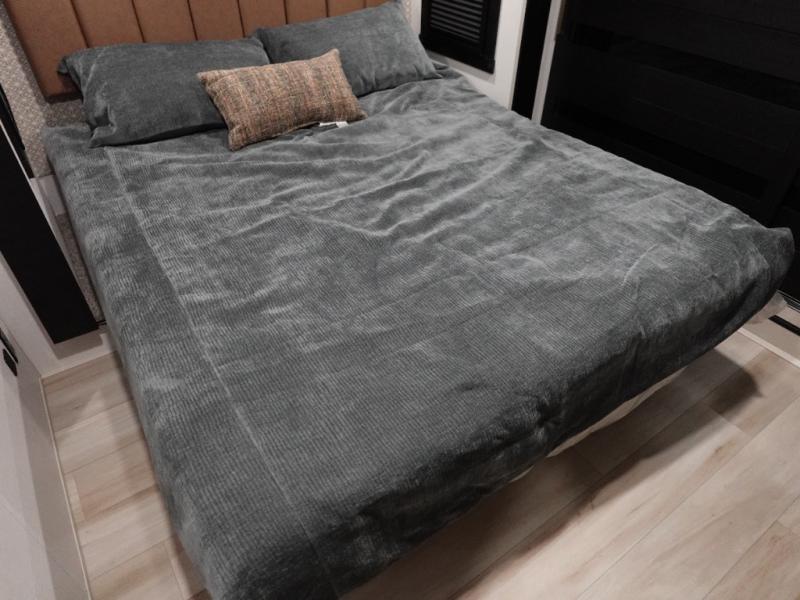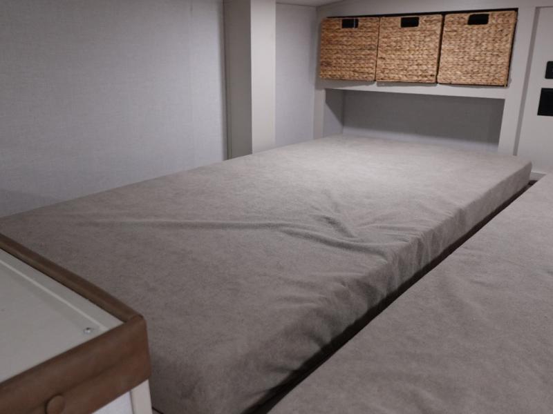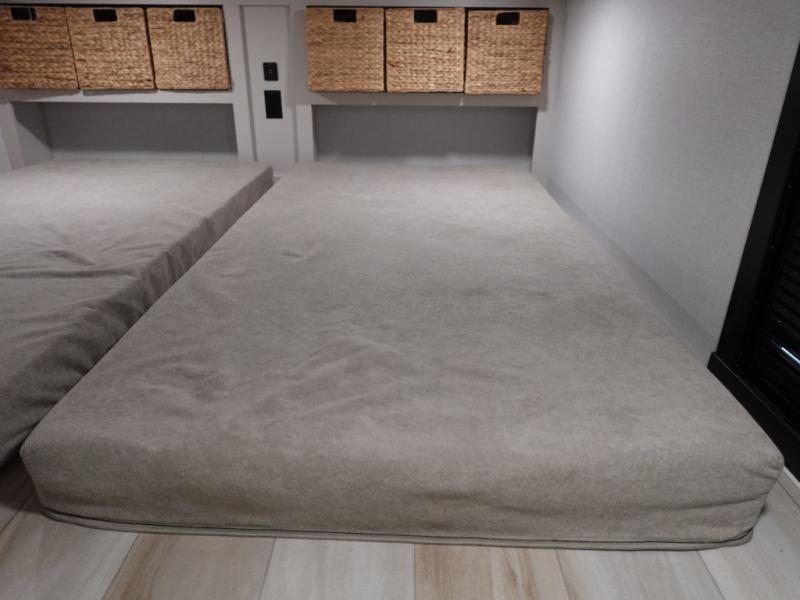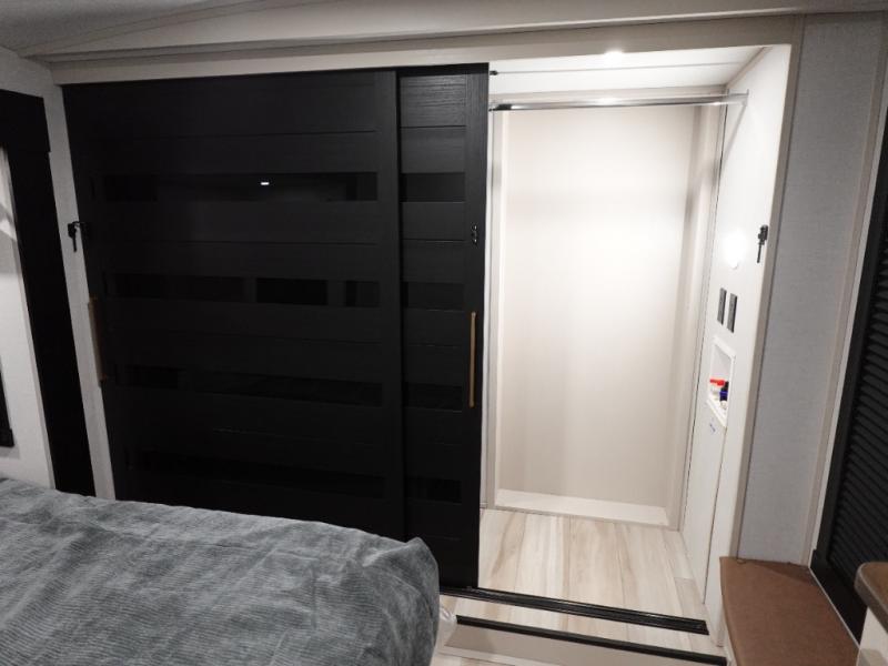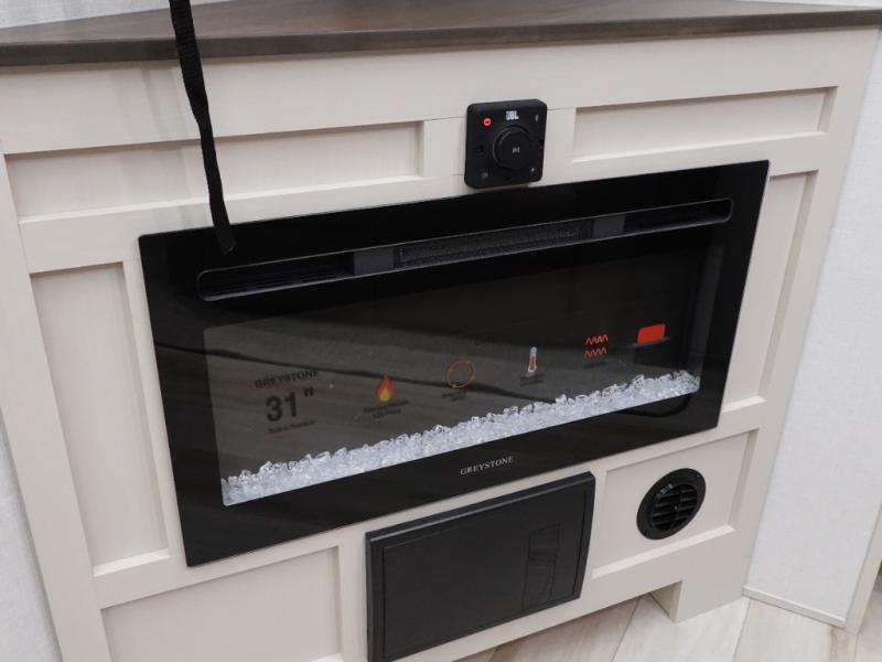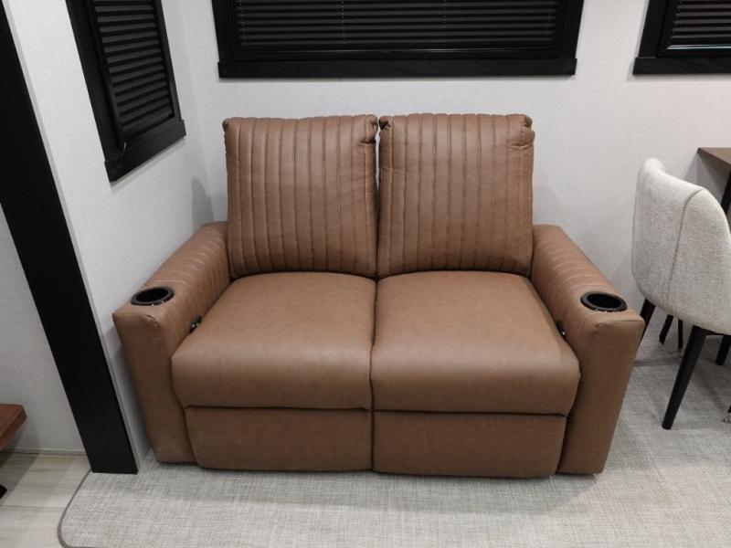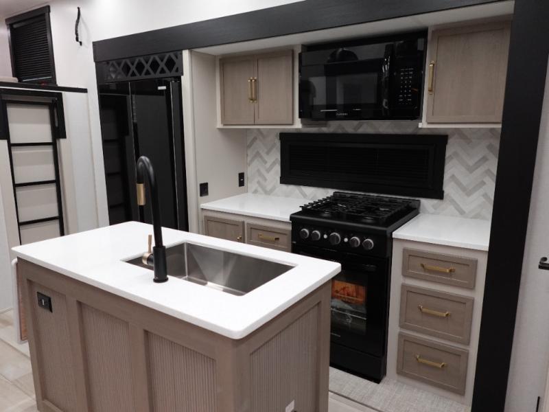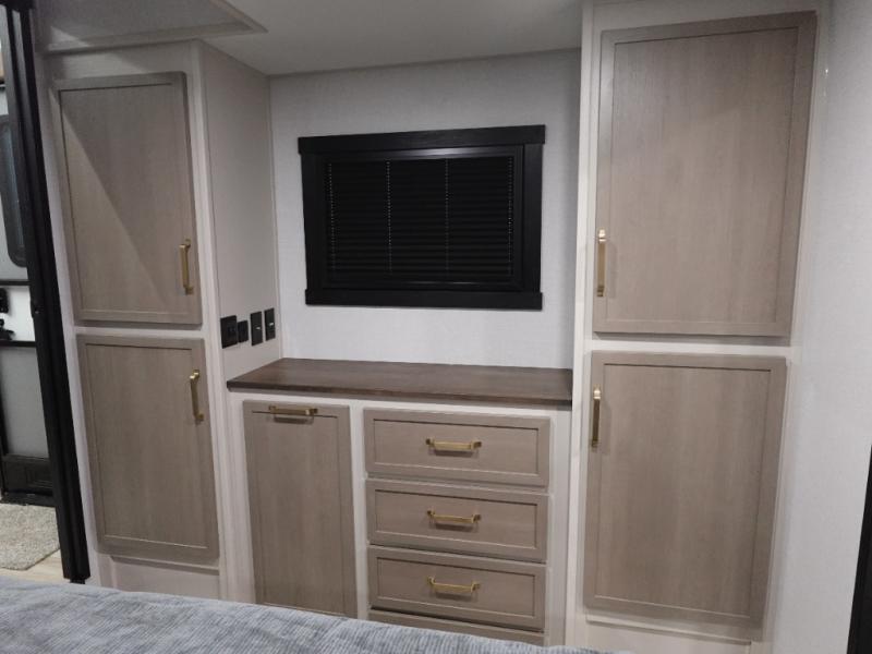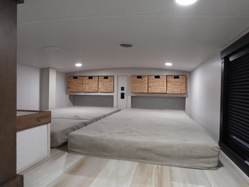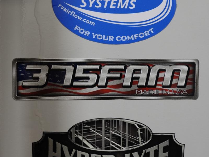 It's easy to see why this fifth wheel is named 375FAM; it's for the whole family or group of friends! There are two private bedrooms, two full baths, a loft, and four slides for tons of space! The front bedroom includes a custom king bed, a dresser with a bench beside it, plus a walk-in closet with shelves and washer/dryer prep! Head to the rear master bedroom to find a custom queen bed, dual wardrobes, plus a rear bath with the second entry door! The loft above this room includes two bunk mats and storage for your guests' things, or you can utilize this space for storage if you don't have extra campers tag along. Everyone can meet in the main living area/kitchen that includes table and chairs, theater seating, a spacious kitchen island with an extension, plus an entertainment center with a fireplace. There is also a 16 cu. ft. 12V refrigerator and walk-in pantry for food storage galore!