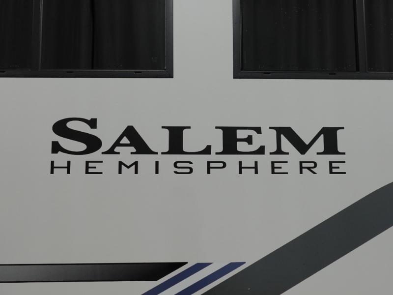 The Salem Hemisphere fifth wheels and travel trailers by Forest River are packed with features, while still being value-minded! Each model is constructed with laminated "Aluma Frame" sidewalls and floor with block foam insulation plus full length barreled ceilings for added head space. There are LED awning, marker and tail lights outside, along with an extra large pass-thru storage with slam latch baggage doors, plus solar prep and Lippert On-The-Go ladder prep. The 60K on-demand tankless water heater will provide endless hot showers, and the JBL sound system includes a head unit plus interior and exterior speakers to keep the party going. There are also many interior comforts found throughout that will make you feel right at home!