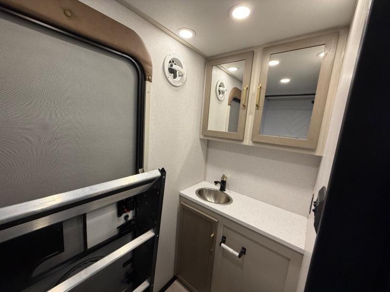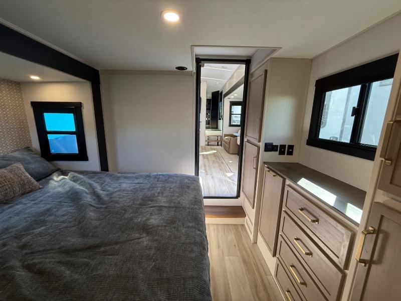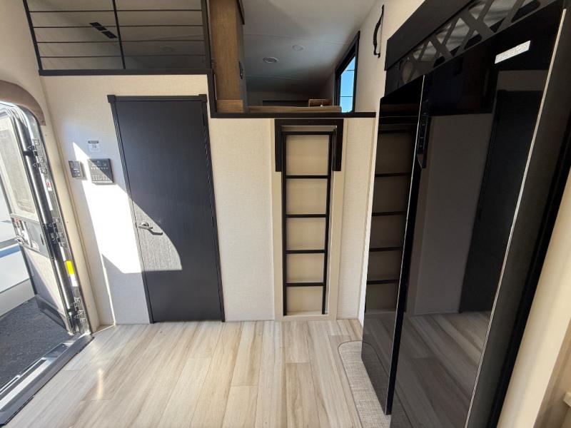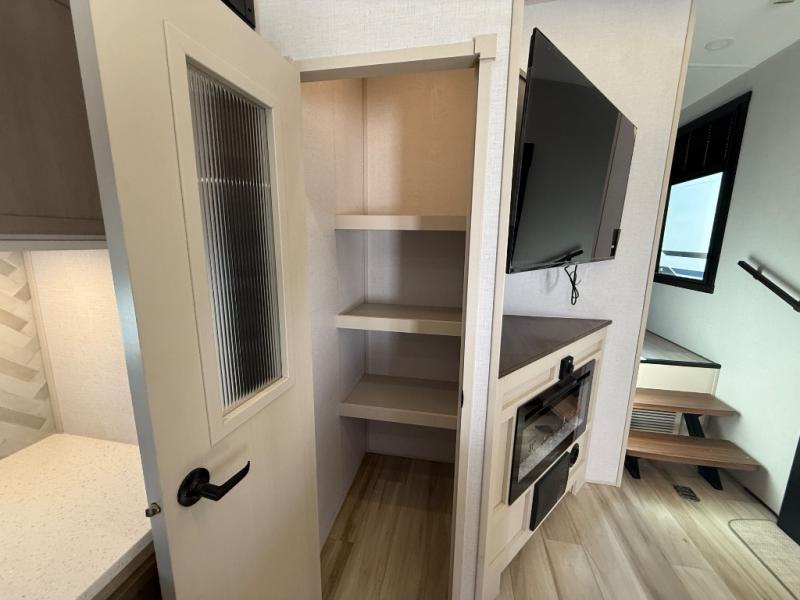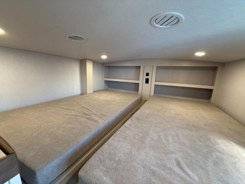 It's easy to see why this fifth wheel is named 375FAM; it's for the whole family or group of friends! There are two private bedrooms, two full baths, a loft, and four slides for tons of space! The front bedroom includes a custom king bed, a dresser with a bench beside it, plus a walk-in closet with shelves and washer/dryer prep! Head to the rear master bedroom to find a custom queen bed, dual wardrobes, plus a rear bath with the second entry door! The loft above this room includes two bunk mats and storage for your guests' things, or you can utilize this space for storage if you don't have extra campers tag along. Everyone can meet in the main living area/kitchen that includes table and chairs, theater seating, a spacious kitchen island with an extension, plus an entertainment center with a fireplace. There is also a 16 cu. ft. 12V refrigerator and walk-in pantry for food storage galore!