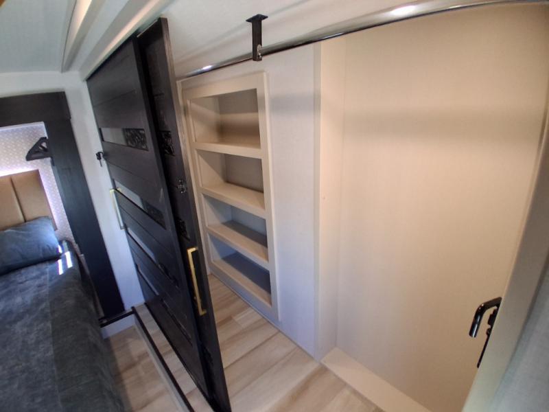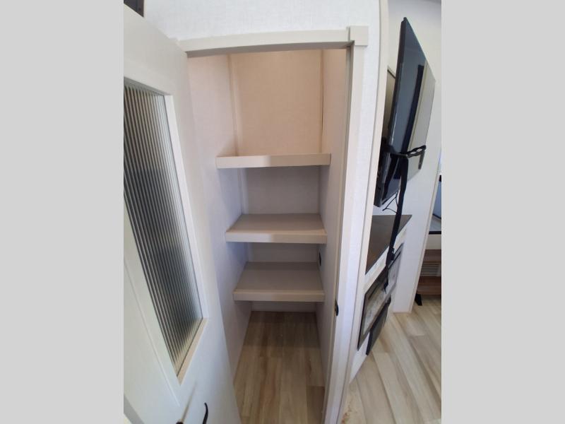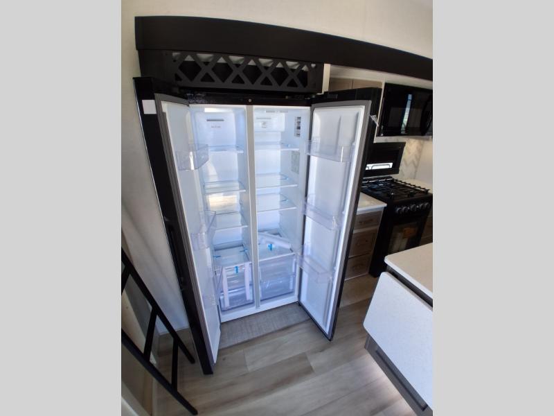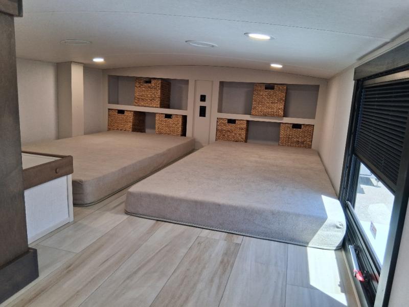 It's easy to see why this fifth wheel is named 375FAM; it's for the whole family or group of friends! There are two private bedrooms, two full baths, a loft, and four slides for tons of space! The front bedroom includes a custom king bed, a dresser with a bench beside it, plus a walk-in closet with shelves and washer/dryer prep! Head to the rear master bedroom to find a custom queen bed, dual wardrobes, plus a rear bath with the second entry door! The loft above this room includes two bunk mats and storage for your guests' things, or you can utilize this space for storage if you don't have extra campers tag along. Everyone can meet in the main living area/kitchen that includes table and chairs, theater seating, a spacious kitchen island with an extension, plus an entertainment center with a fireplace. There is also a 16 cu. ft. 12V refrigerator and walk-in pantry for food storage galore!