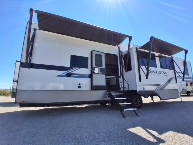 The Salem Hemisphere fifth wheels and travel trailers by Forest River are packed with features, while still being value-minded! Each model is constructed with laminated "Aluma Frame" sidewalls and floor with block foam insulation plus full length barreled ceilings for added head space. There are LED awning, marker and tail lights outside, along with an extra large pass-thru storage with slam latch baggage doors, plus solar prep and Lippert On-The-Go ladder prep. The 60K on-demand tankless water heater will provide endless hot showers, and the JBL sound system includes a head unit plus interior and exterior speakers to keep the party going. There are also many interior comforts found throughout that will make you feel right at home!