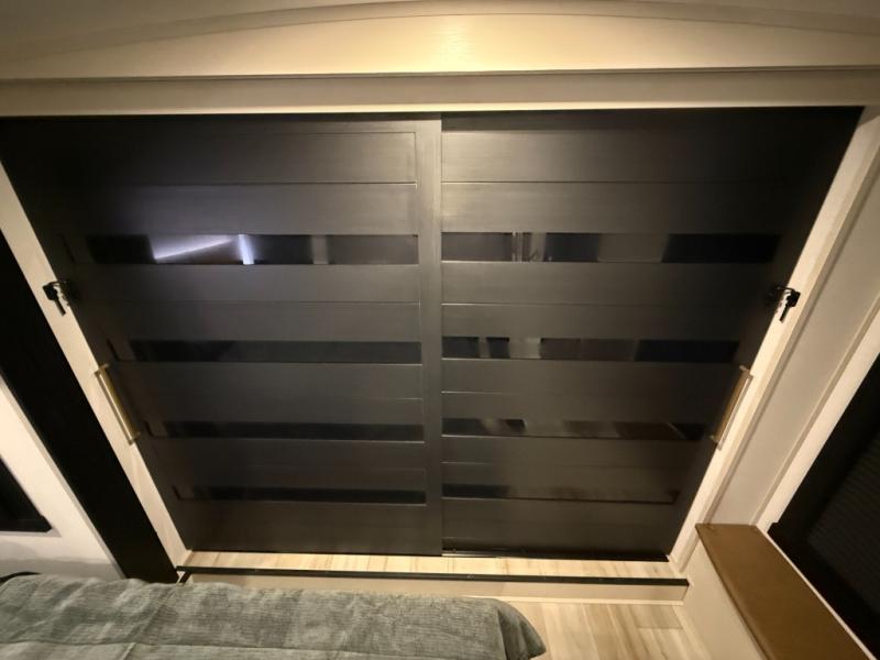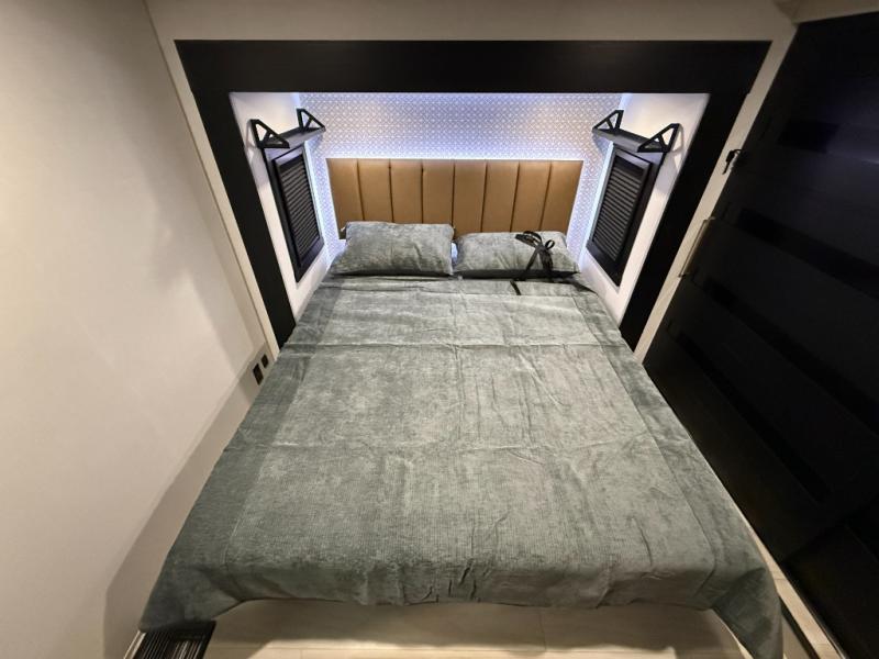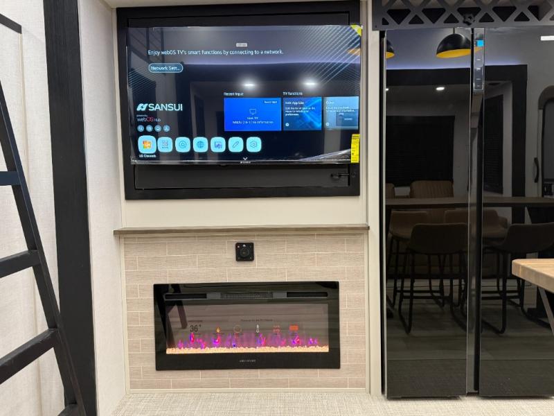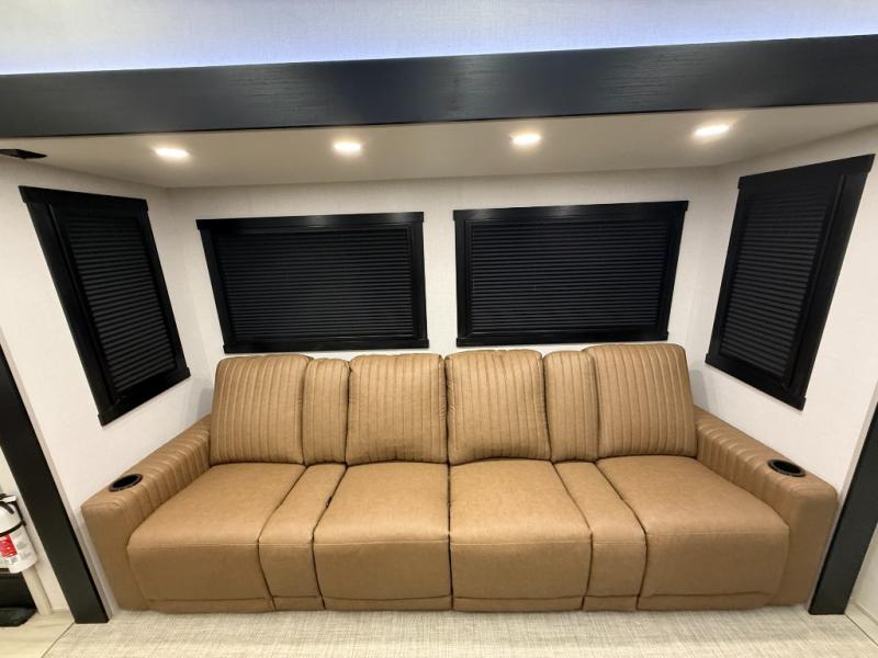 The whole family will love camping in this spacious fifth wheel! There are four slide outs, two bedrooms, plus two full baths, one of which is located in the rear master bedroom. A custom queen bed and dual wardrobes are also found in the master, while a custom king bed is found in the front private bedroom. And the loft with bunk mats can be used for additional sleeping or storage space! The chef of your group will find a full kitchen to cook meals, including ample counter space and a 16-cu. ft. 12V refrigerator and hidden storage behind the 50" TV for snacks or movies. The theater seating with cup holders provides a comfy place to relax each day, and the kitchen island with chairs will be perfect for dining space!