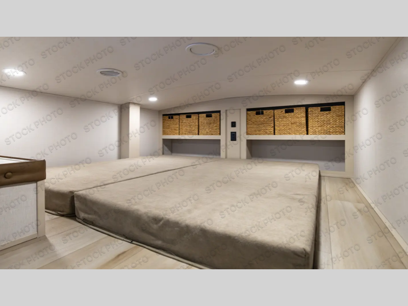 The whole family will love camping in this spacious fifth wheel! There are four slide outs, two bedrooms, plus two full baths, one of which is located in the rear master bedroom. A custom queen bed and dual wardrobes are also found in the master, while a custom king bed is found in the front private bedroom. And the loft with bunk mats can be used for additional sleeping or storage space! The chef of your group will find a full kitchen to cook meals, including ample counter space and a 16-cu. ft. 12V refrigerator and hidden storage behind the 50" TV for snacks or movies. The theater seating with cup holders provides a comfy place to relax each day, and the kitchen island with chairs will be perfect for dining space!