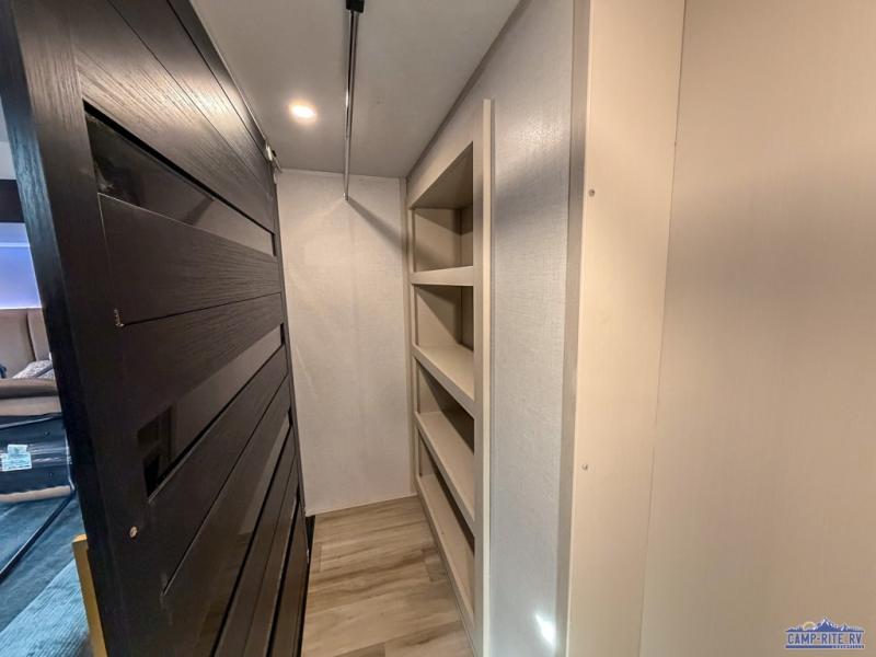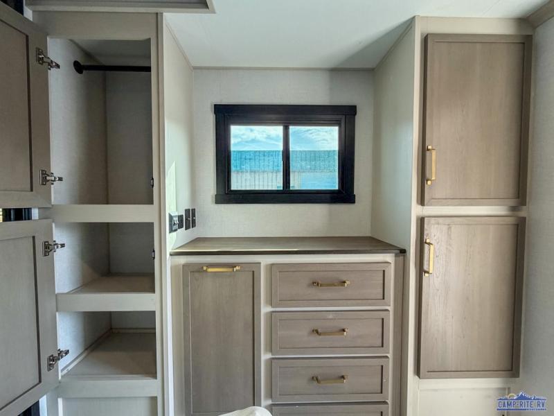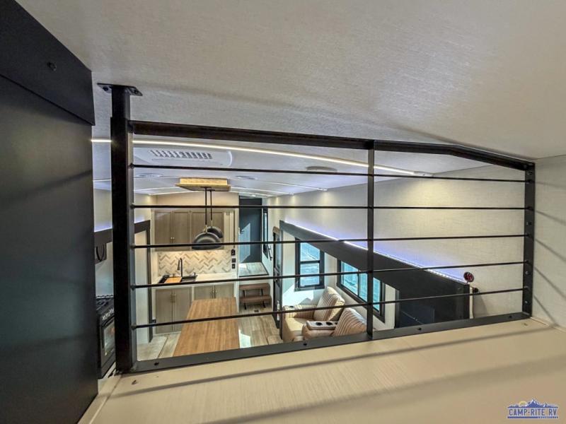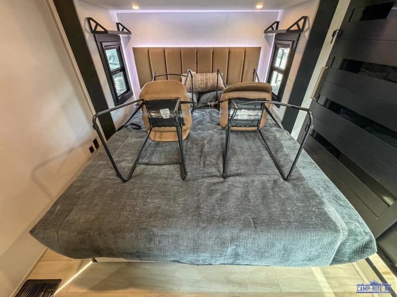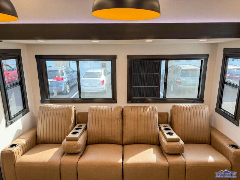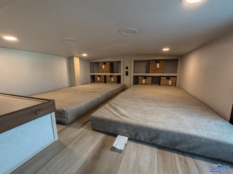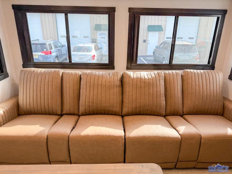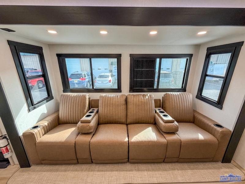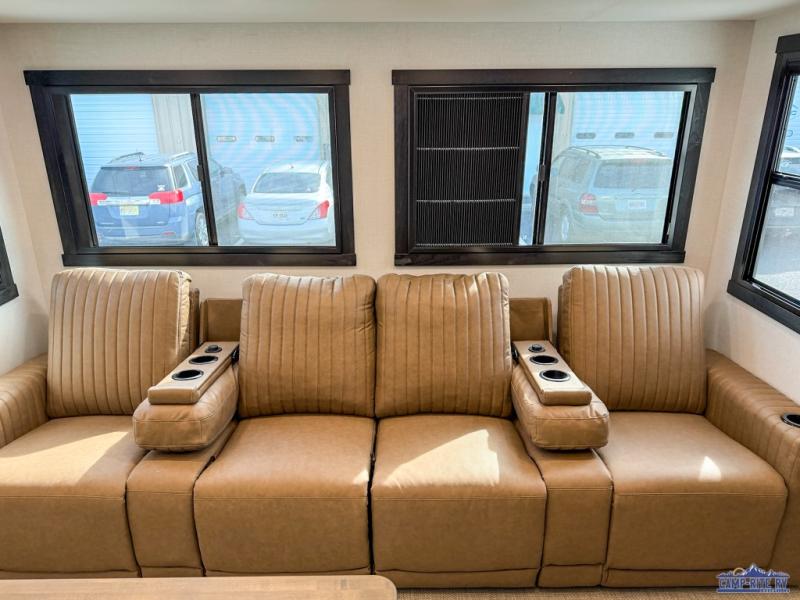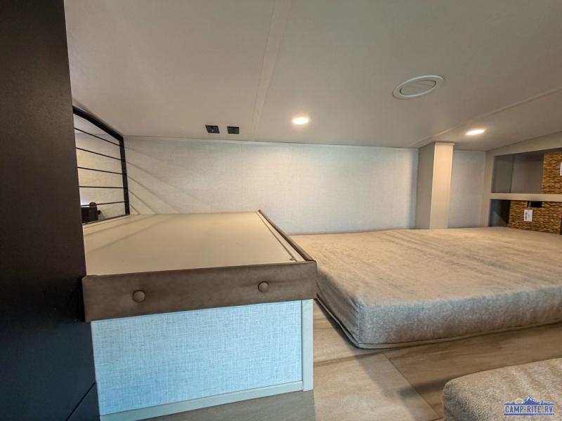 The whole family will love camping in this spacious fifth wheel! There are four slide outs, two bedrooms, plus two full baths, one of which is located in the rear master bedroom. A custom queen bed and dual wardrobes are also found in the master, while a custom king bed is found in the front private bedroom. And the loft with bunk mats can be used for additional sleeping or storage space! The chef of your group will find a full kitchen to cook meals, including ample counter space and a 16-cu. ft. 12V refrigerator and hidden storage behind the 50" TV for snacks or movies. The theater seating with cup holders provides a comfy place to relax each day, and the kitchen island with chairs will be perfect for dining space!
