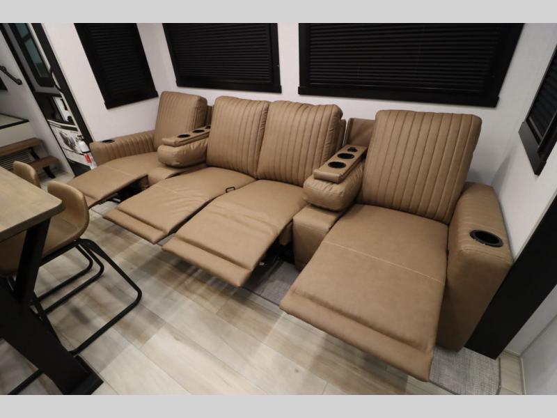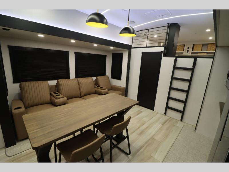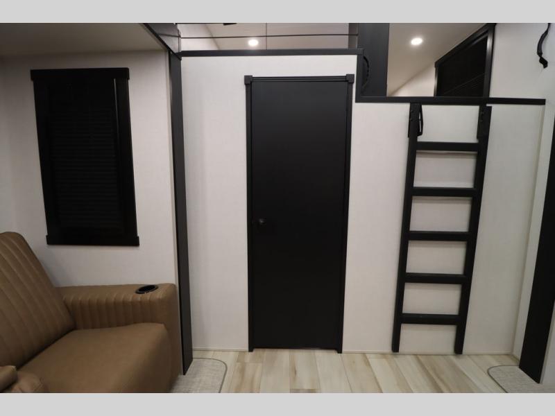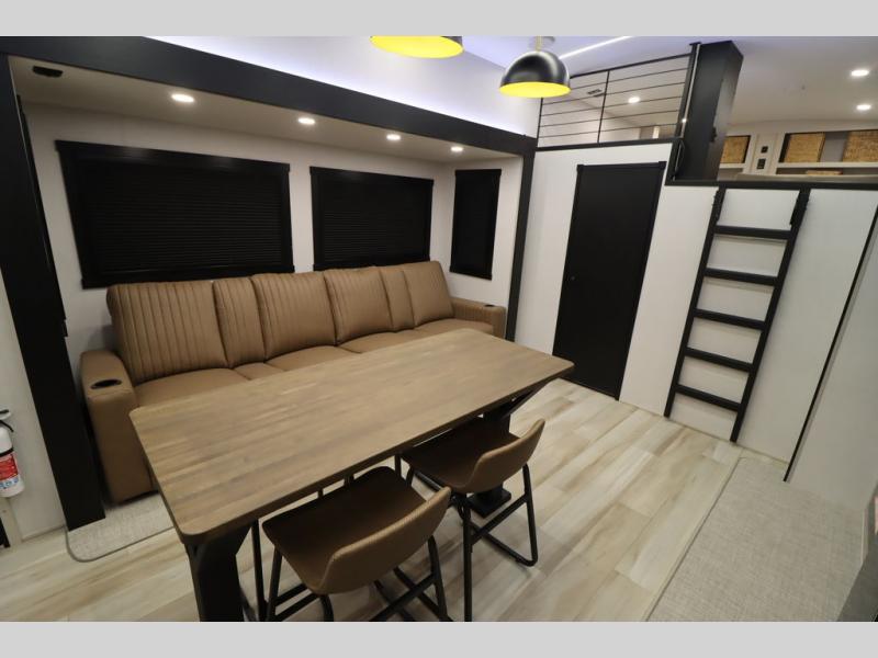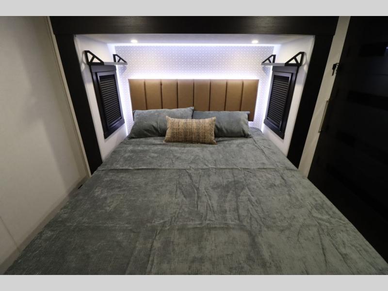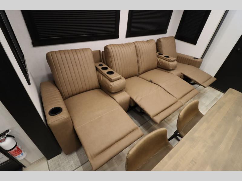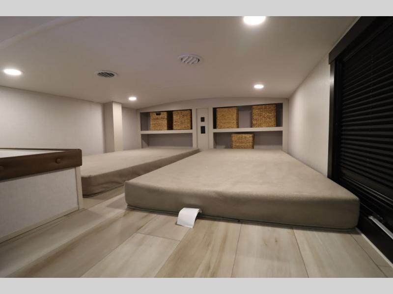 The whole family will love camping in this spacious fifth wheel! There are four slide outs, two bedrooms, plus two full baths, one of which is located in the rear master bedroom. A custom queen bed and dual wardrobes are also found in the master, while a custom king bed is found in the front private bedroom. And the loft with bunk mats can be used for additional sleeping or storage space! The chef of your group will find a full kitchen to cook meals, including ample counter space and a 16-cu. ft. 12V refrigerator and hidden storage behind the 50" TV for snacks or movies. The theater seating with cup holders provides a comfy place to relax each day, and the kitchen island with chairs will be perfect for dining space!