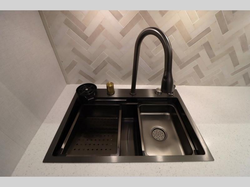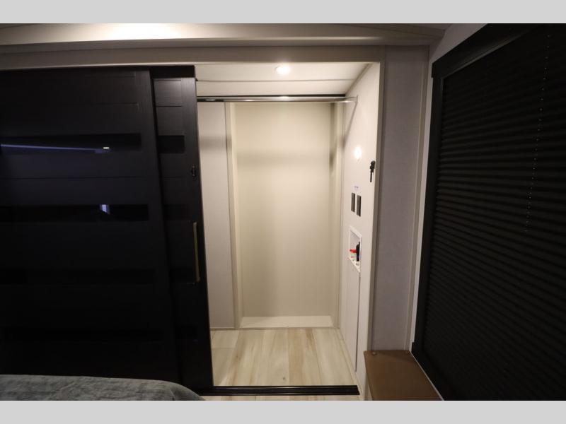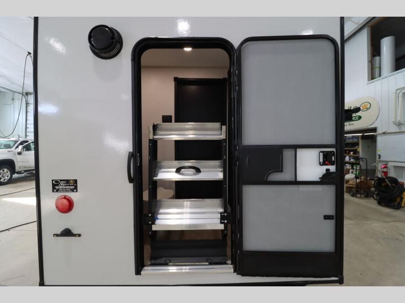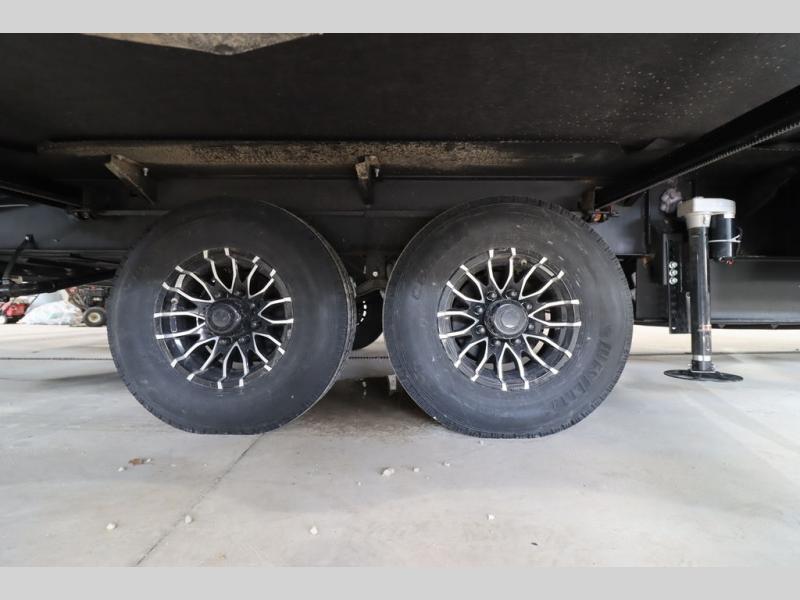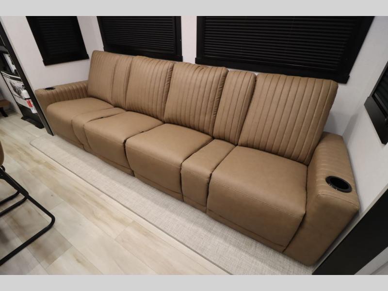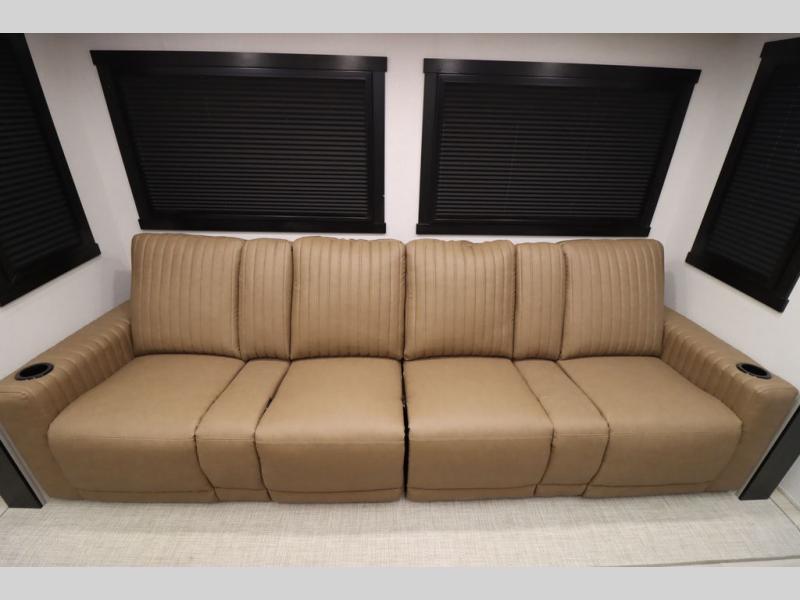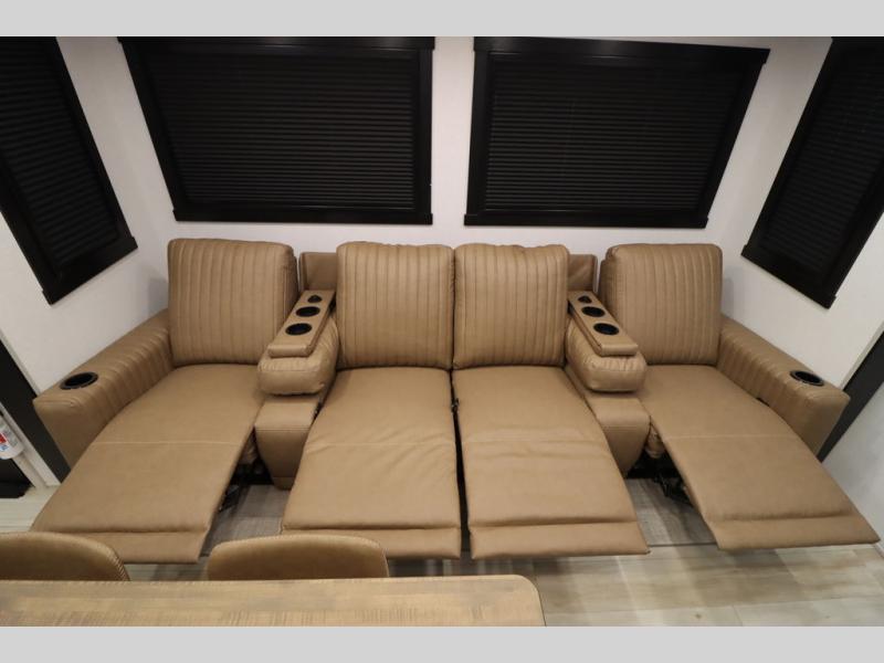 The whole family will love camping in this spacious fifth wheel! There are four slide outs, two bedrooms, plus two full baths, one of which is located in the rear master bedroom. A custom queen bed and dual wardrobes are also found in the master, while a custom king bed is found in the front private bedroom. And the loft with bunk mats can be used for additional sleeping or storage space! The chef of your group will find a full kitchen to cook meals, including ample counter space and a 16-cu. ft. 12V refrigerator and hidden storage behind the 50" TV for snacks or movies. The theater seating with cup holders provides a comfy place to relax each day, and the kitchen island with chairs will be perfect for dining space!