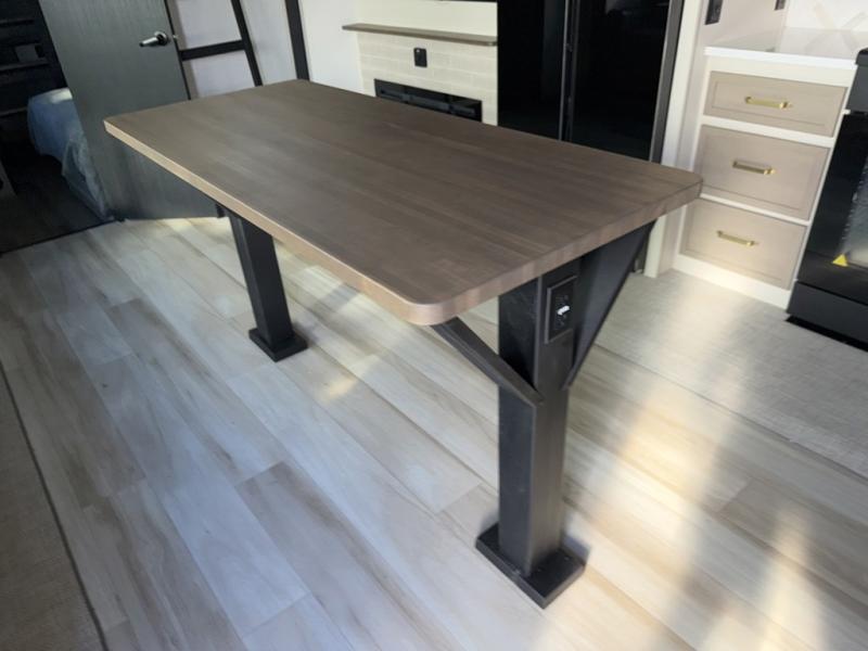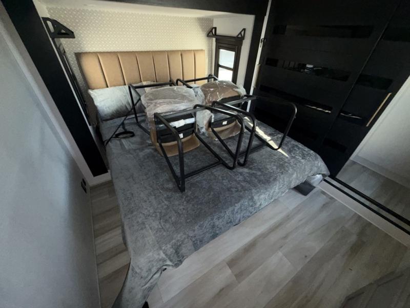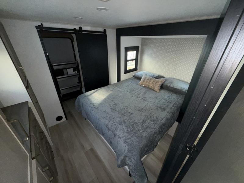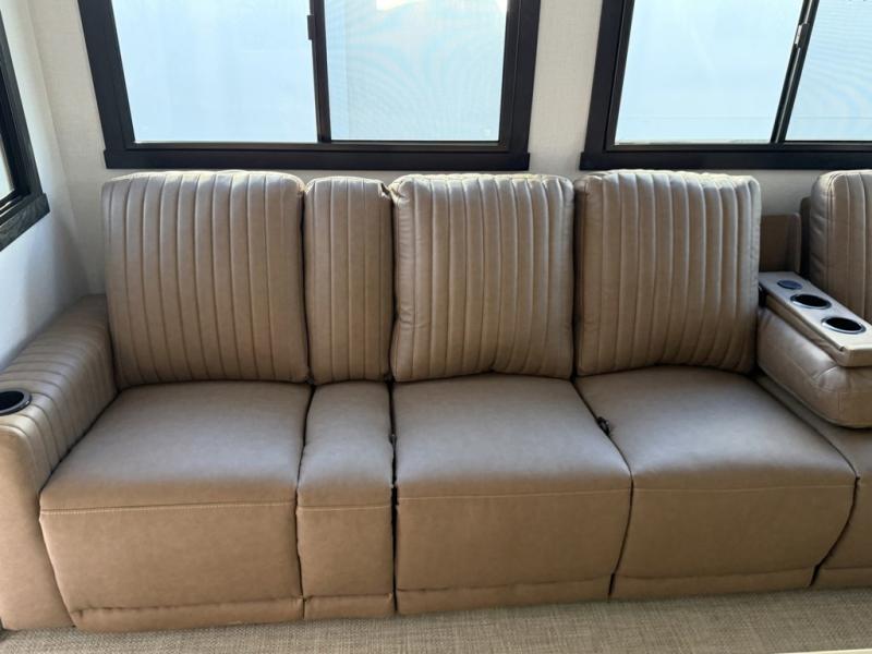 The whole family will love camping in this spacious fifth wheel! There are four slide outs, two bedrooms, plus two full baths, one of which is located in the rear master bedroom. A custom queen bed and dual wardrobes are also found in the master, while a custom king bed is found in the front private bedroom. And the loft with bunk mats can be used for additional sleeping or storage space! The chef of your group will find a full kitchen to cook meals, including ample counter space and a 16-cu. ft. 12V refrigerator and hidden storage behind the 50" TV for snacks or movies. The theater seating with cup holders provides a comfy place to relax each day, and the kitchen island with chairs will be perfect for dining space!