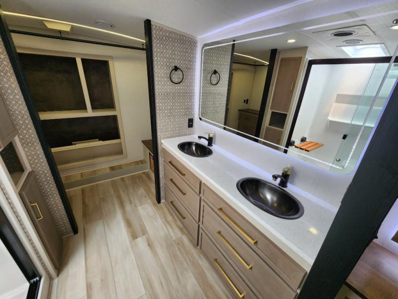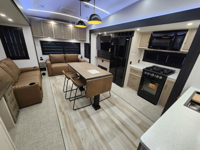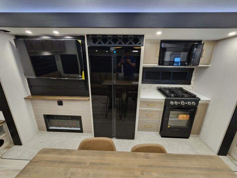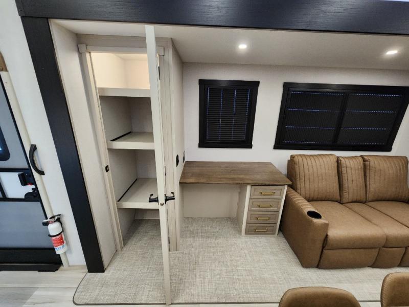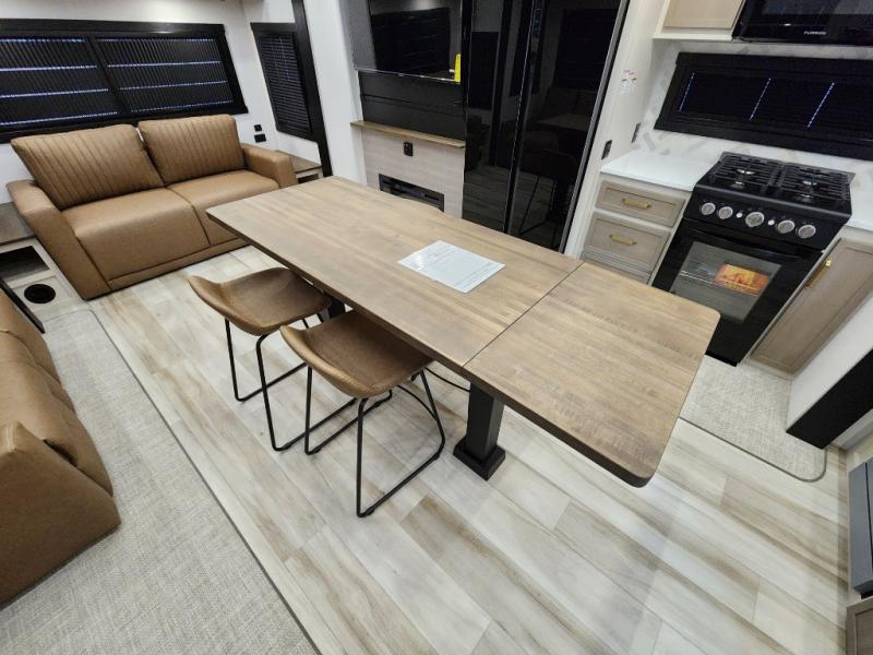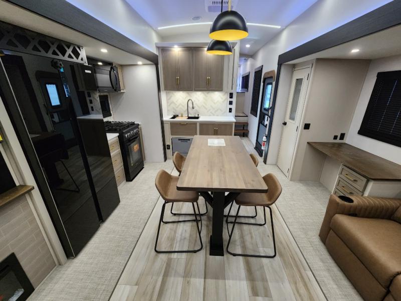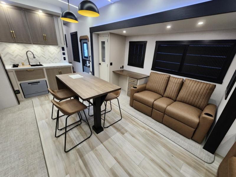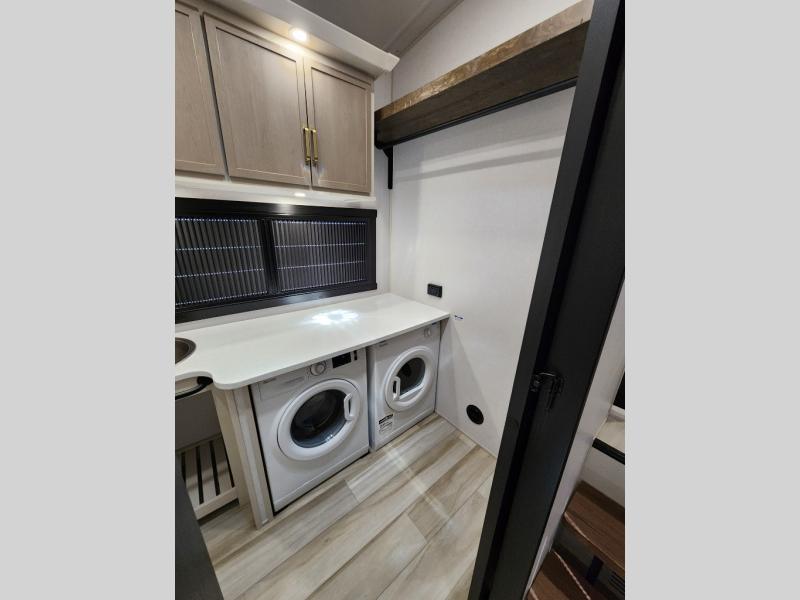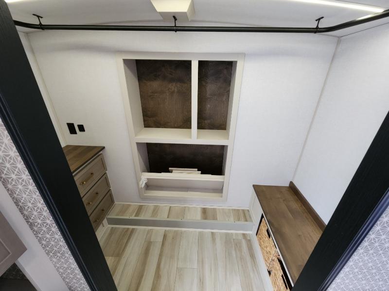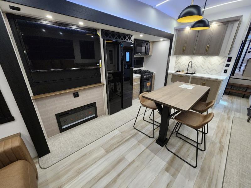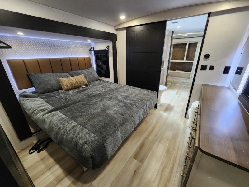 One look at this fifth wheel and you'll be sold! You can wake up each morning in the master bedroom that includes a custom king bed and a dresser with an ottoman. The front full bath has two bath sinks so you both can get ready at once, and you're going to love the walk-in wardrobe with wrap-around hanging rod. A half bath includes a floating shelf with a hanging rod plus washer/dryer prep, giving you the option to make this a laundry room! The back of this unit is where you can cook meals with full kitchen amenities, dine at the kitchen island with four chairs, and relax on the theater seating and tri-fold sofa. A 50" TV and fireplace is also found here, complete with hidden storage behind for board games, movies, and snacks!