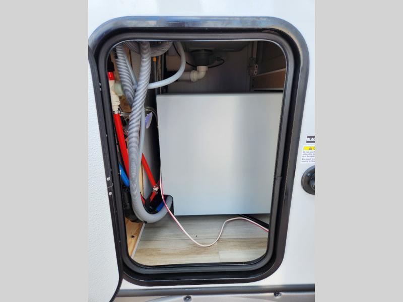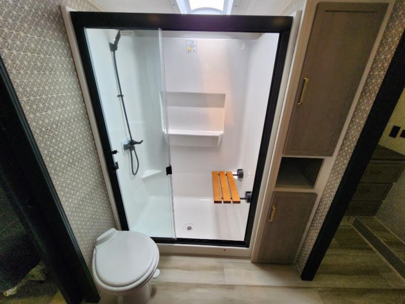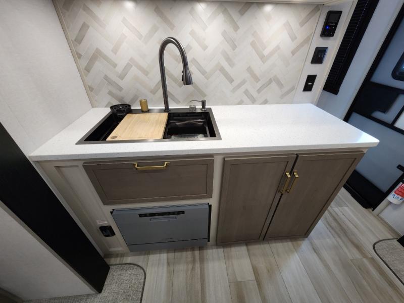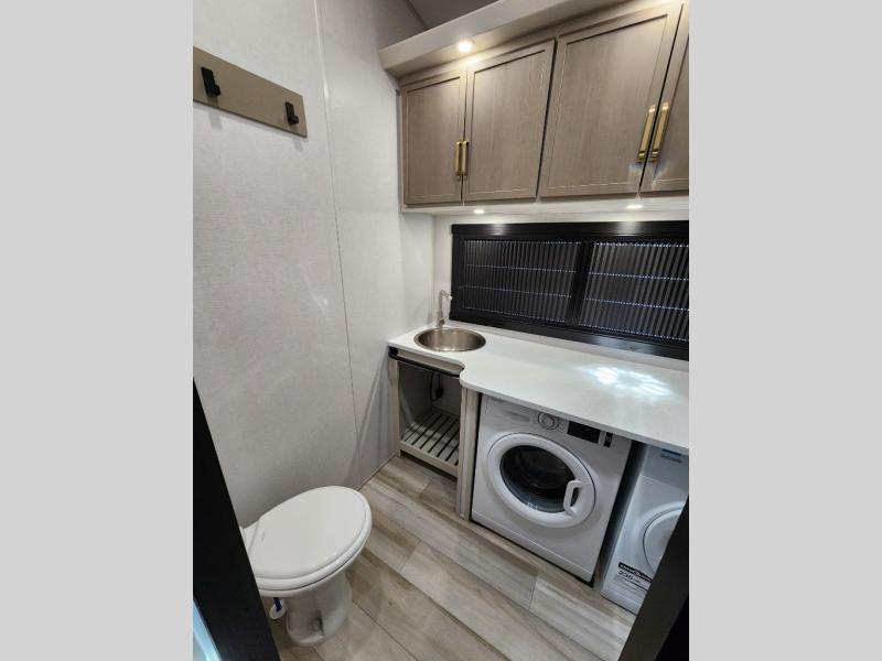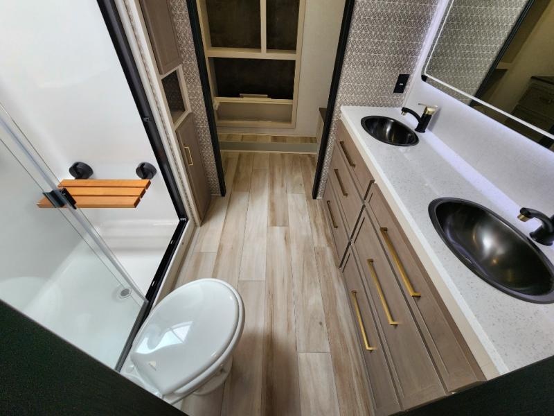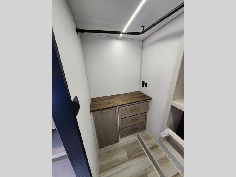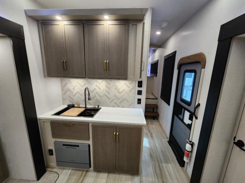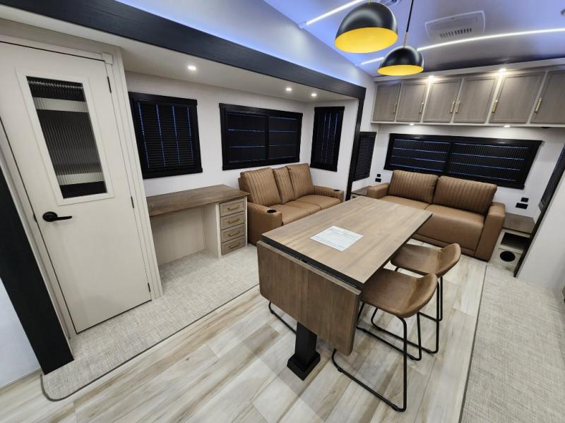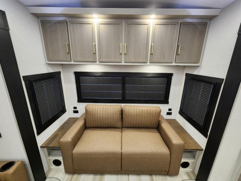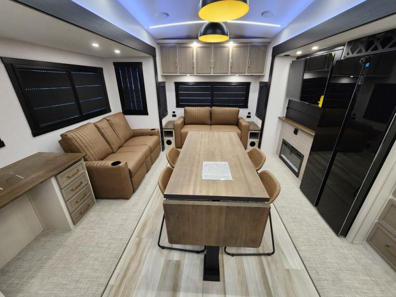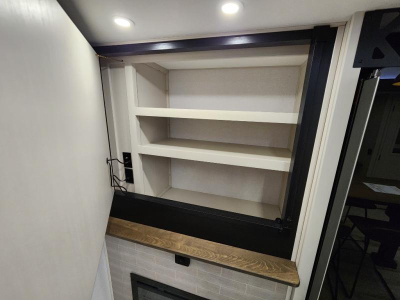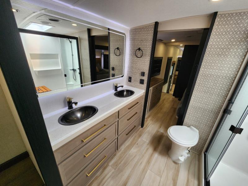 One look at this fifth wheel and you'll be sold! You can wake up each morning in the master bedroom that includes a custom king bed and a dresser with an ottoman. The front full bath has two bath sinks so you both can get ready at once, and you're going to love the walk-in wardrobe with wrap-around hanging rod. A half bath includes a floating shelf with a hanging rod plus washer/dryer prep, giving you the option to make this a laundry room! The back of this unit is where you can cook meals with full kitchen amenities, dine at the kitchen island with four chairs, and relax on the theater seating and tri-fold sofa. A 50" TV and fireplace is also found here, complete with hidden storage behind for board games, movies, and snacks!