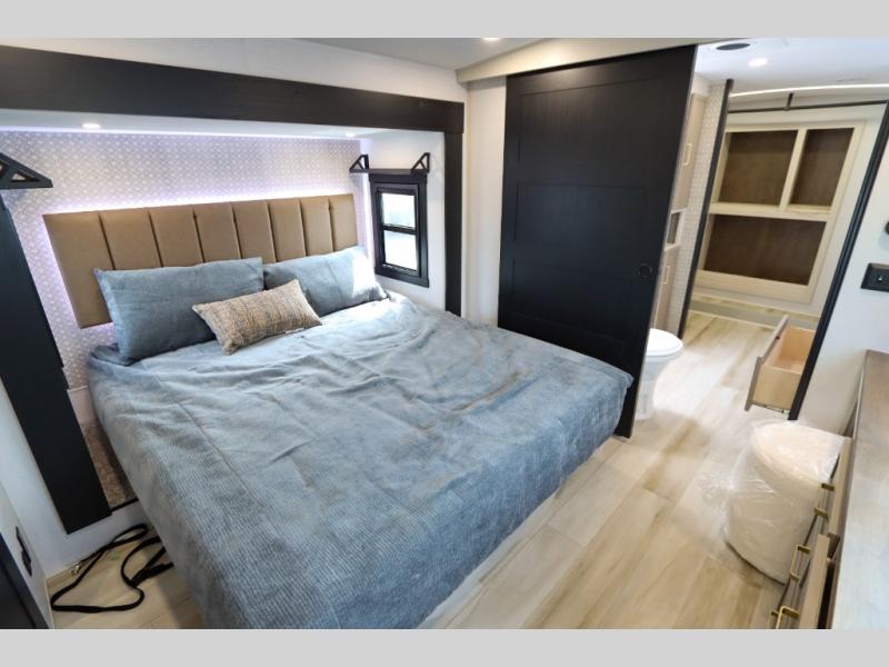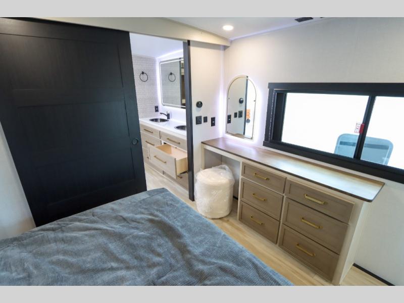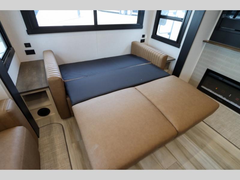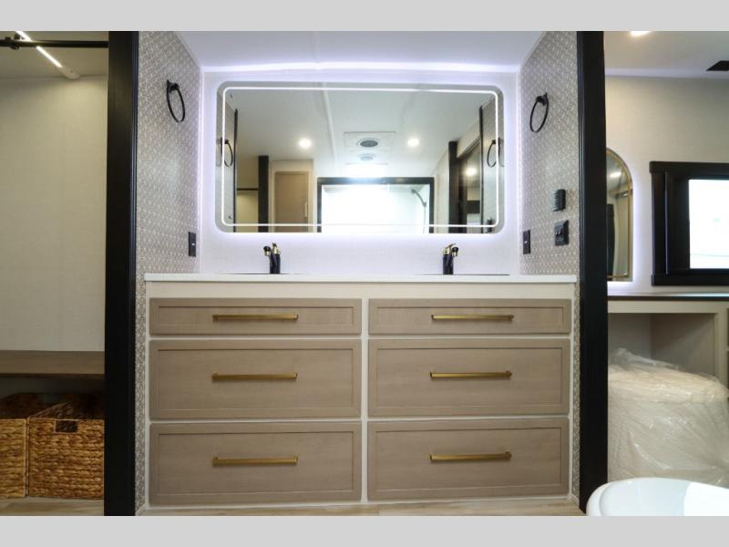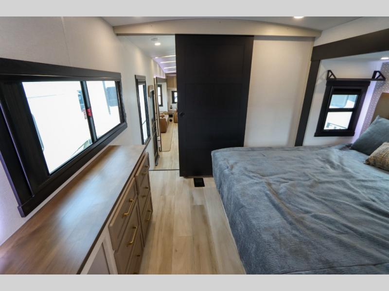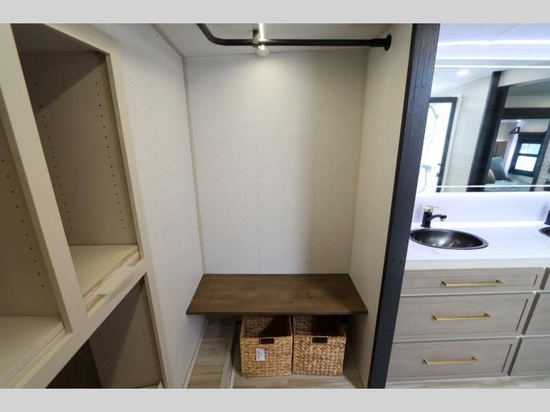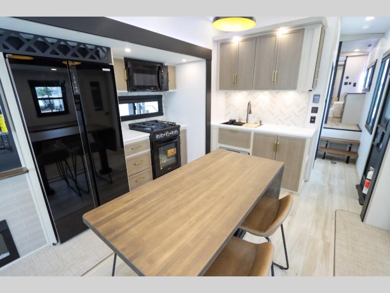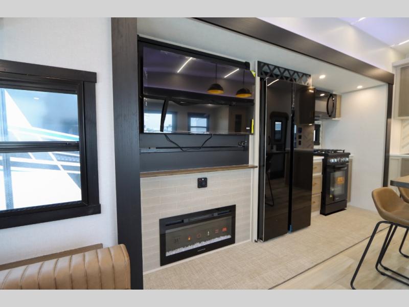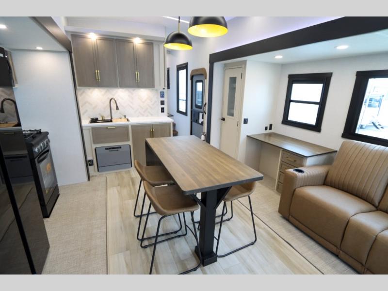 One look at this fifth wheel and you'll be sold! You can wake up each morning in the master bedroom that includes a custom king bed and a dresser with an ottoman. The front full bath has two bath sinks so you both can get ready at once, and you're going to love the walk-in wardrobe with wrap-around hanging rod. A half bath includes a floating shelf with a hanging rod plus washer/dryer prep, giving you the option to make this a laundry room! The back of this unit is where you can cook meals with full kitchen amenities, dine at the kitchen island with four chairs, and relax on the theater seating and tri-fold sofa. A 50" TV and fireplace is also found here, complete with hidden storage behind for board games, movies, and snacks!