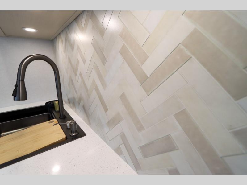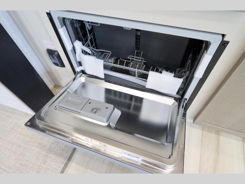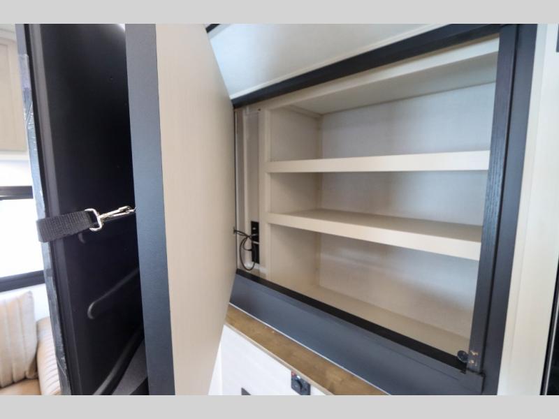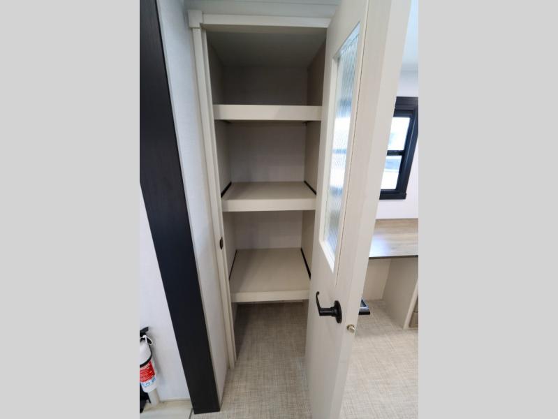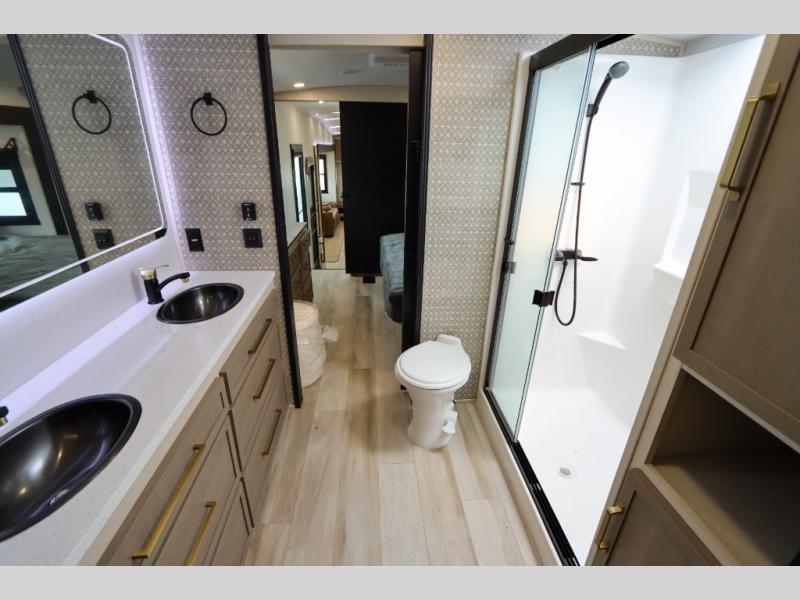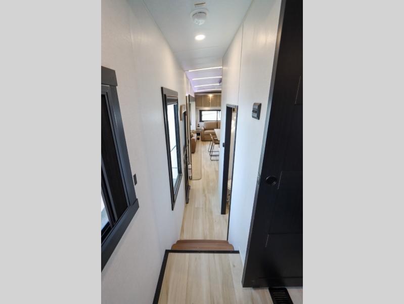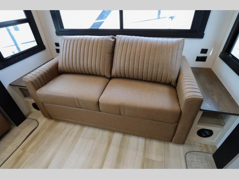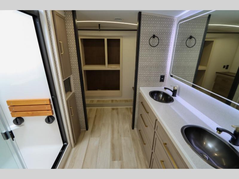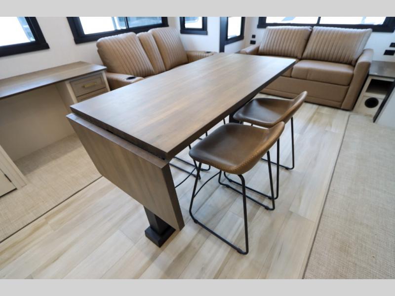 One look at this fifth wheel and you'll be sold! You can wake up each morning in the master bedroom that includes a custom king bed and a dresser with an ottoman. The front full bath has two bath sinks so you both can get ready at once, and you're going to love the walk-in wardrobe with wrap-around hanging rod. A half bath includes a floating shelf with a hanging rod plus washer/dryer prep, giving you the option to make this a laundry room! The back of this unit is where you can cook meals with full kitchen amenities, dine at the kitchen island with four chairs, and relax on the theater seating and tri-fold sofa. A 50" TV and fireplace is also found here, complete with hidden storage behind for board games, movies, and snacks!