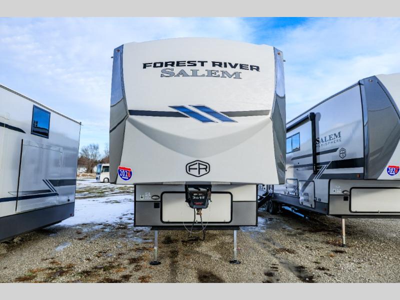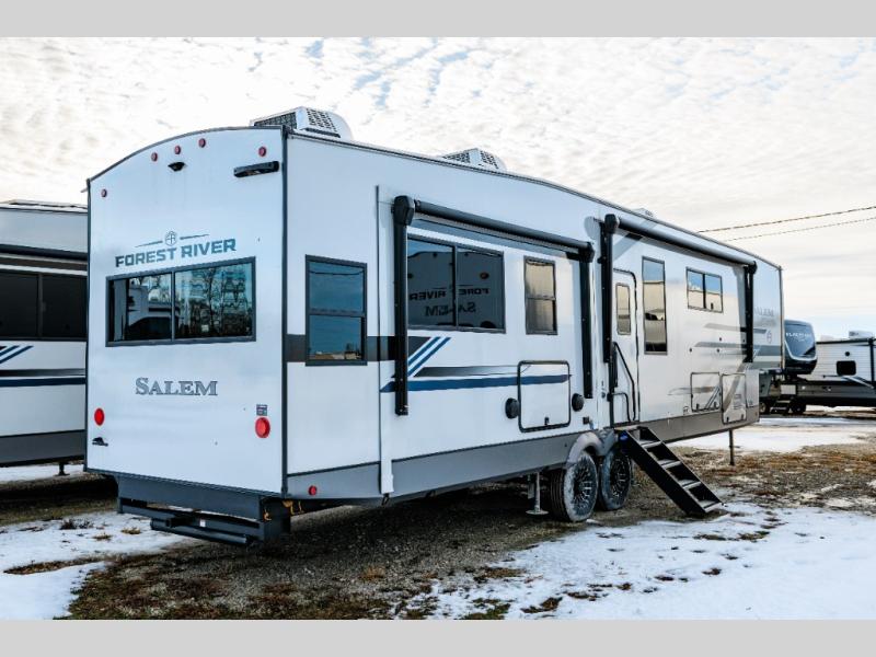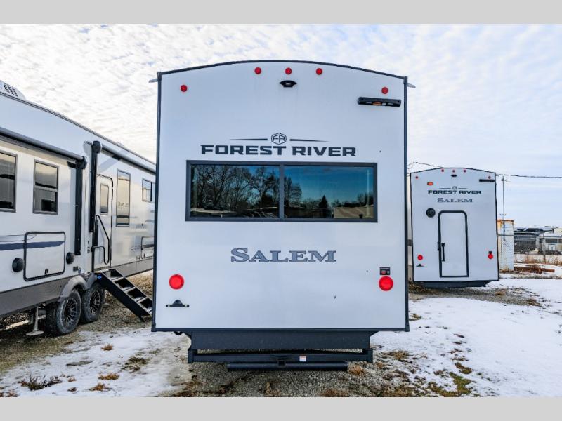 The Salem Hemisphere fifth wheels by Forest River are packed with features, while still being value-minded! Each model is constructed with laminated "Aluma Frame" sidewalls and floor with block foam insulation plus full-length barreled ceilings for added head space. There are LED awning, marker and taillights outside, along with an extra-large pass-thru storage with slam latch baggage doors, plus solar prep and Lippert On-The-Go ladder prep. The 60K on-demand tankless water heater will provide endless hot showers, and the JBL sound system includes a head unit plus interior and exterior speakers to keep the party going. There are also many interior comforts found throughout that will make you feel right at home!