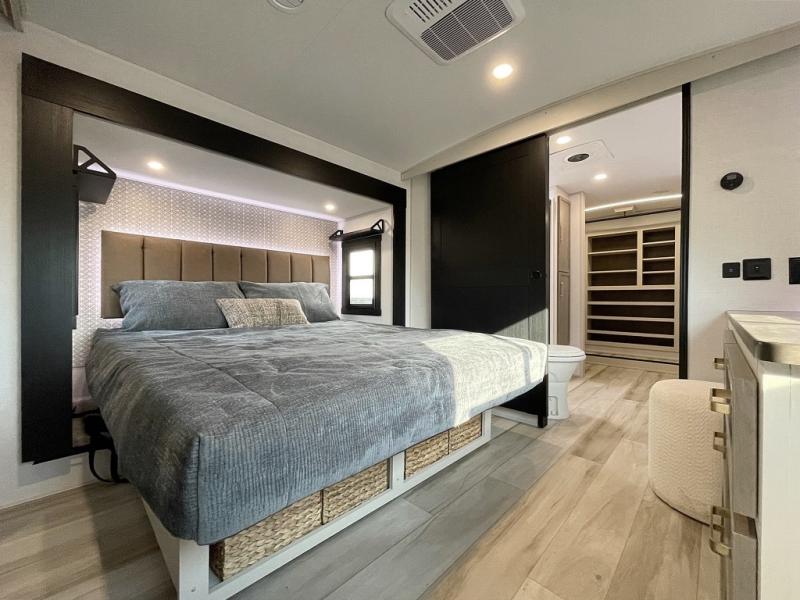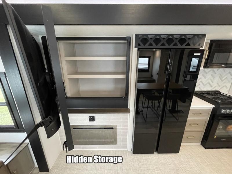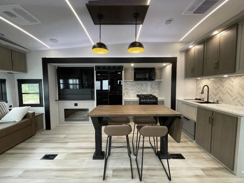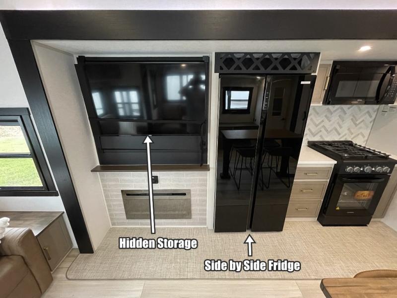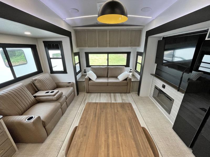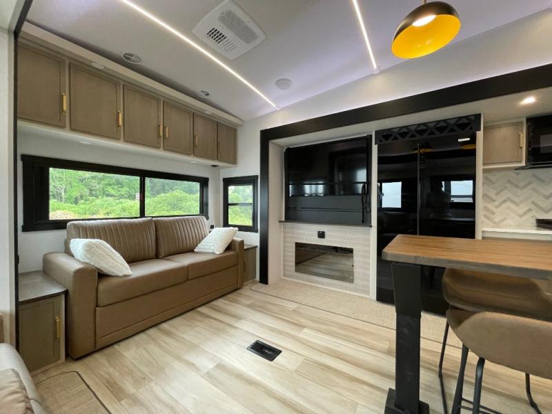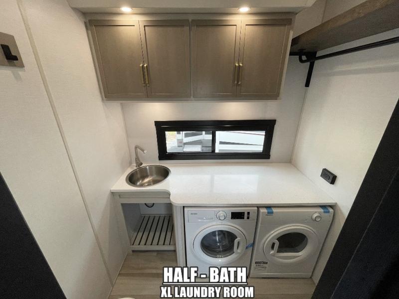 One look at this fifth wheel and you'll be sold! You can wake up each morning in the master bedroom that includes a custom king bed and a dresser with an ottoman. The front full bath has two bath sinks so you both can get ready at once, and you're going to love the walk-in wardrobe with wrap-around hanging rod. A half bath includes a floating shelf with a hanging rod plus washer/dryer prep, giving you the option to make this a laundry room! The back of this unit is where you can cook meals with full kitchen amenities, dine at the kitchen island with four chairs, and relax on the theater seating and tri-fold sofa. A 50" TV and fireplace is also found here, complete with hidden storage behind for board games, movies, and snacks!