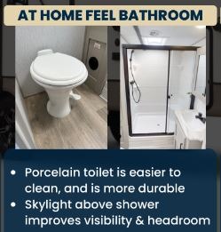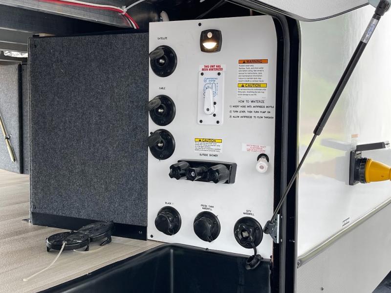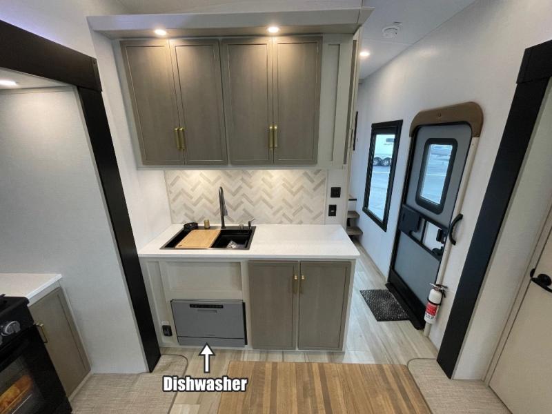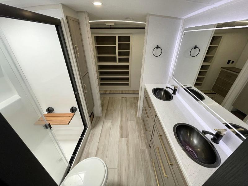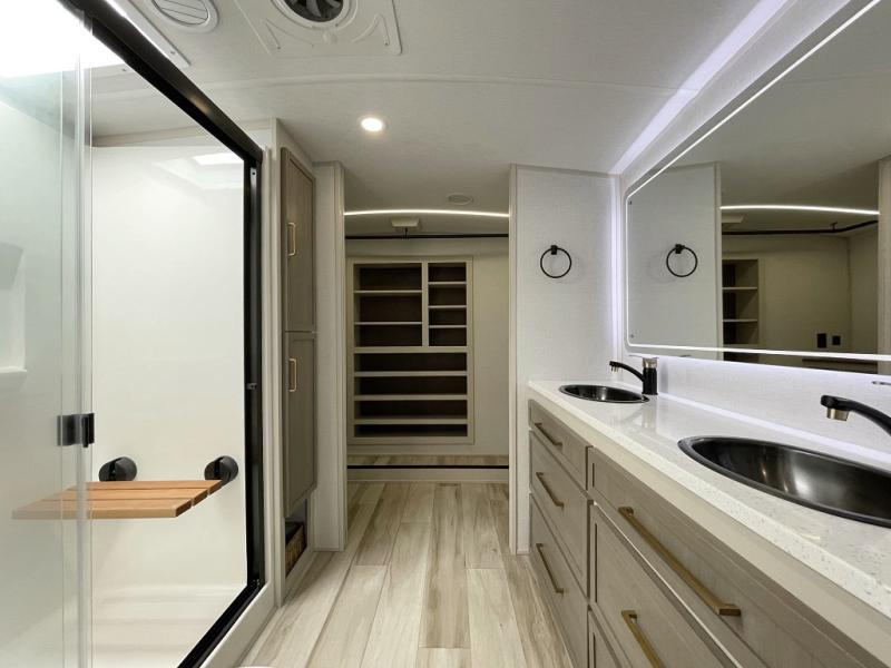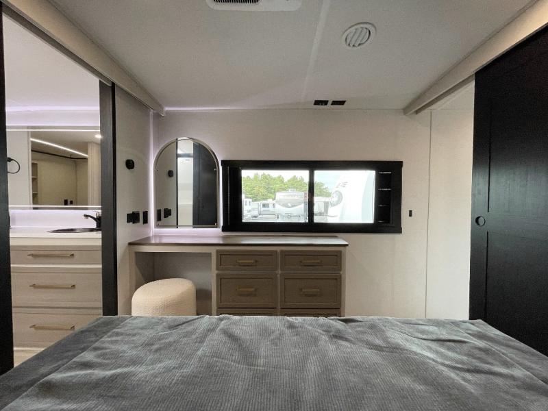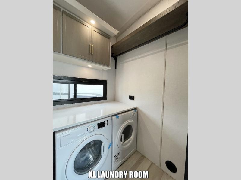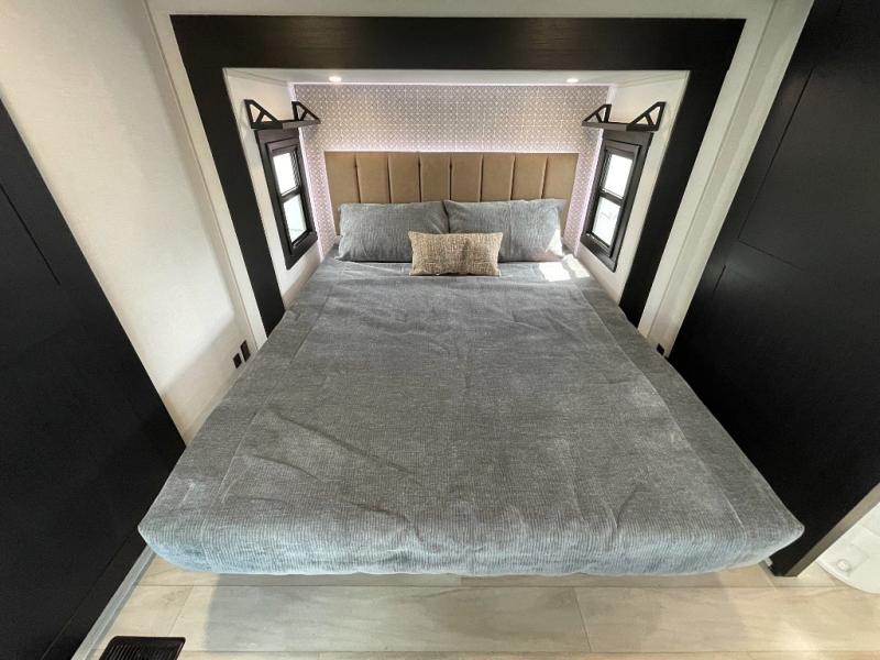 One look at this fifth wheel and you'll be sold! You can wake up each morning in the master bedroom that includes a custom king bed and a dresser with an ottoman. The front full bath has two bath sinks so you both can get ready at once, and you're going to love the walk-in wardrobe with wrap-around hanging rod. A half bath includes a floating shelf with a hanging rod plus washer/dryer prep, giving you the option to make this a laundry room! The back of this unit is where you can cook meals with full kitchen amenities, dine at the kitchen island with four chairs, and relax on the theater seating and tri-fold sofa. A 50" TV and fireplace is also found here, complete with hidden storage behind for board games, movies, and snacks!