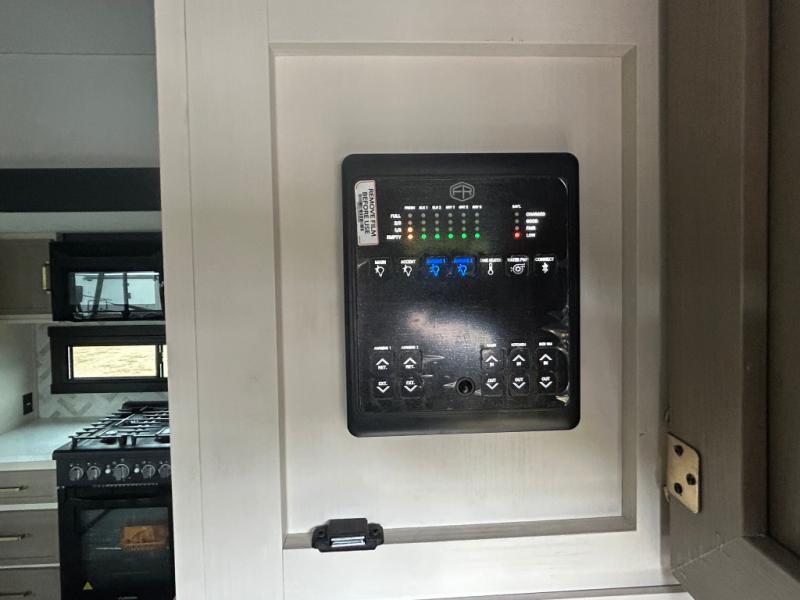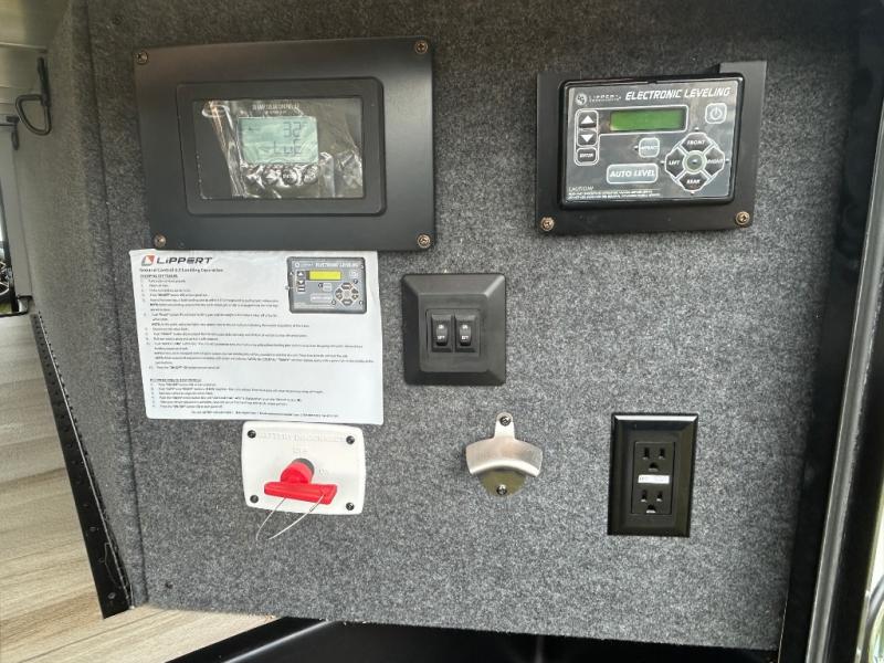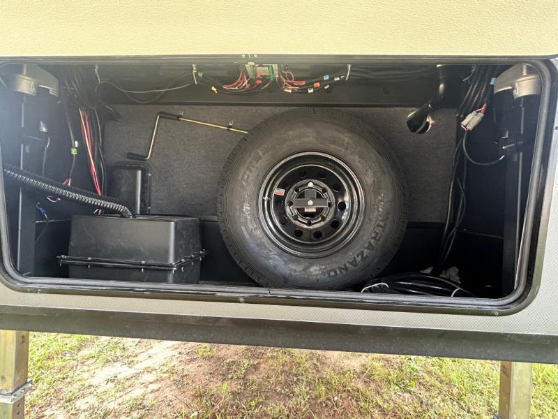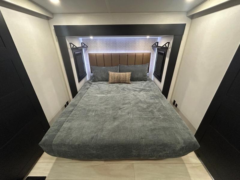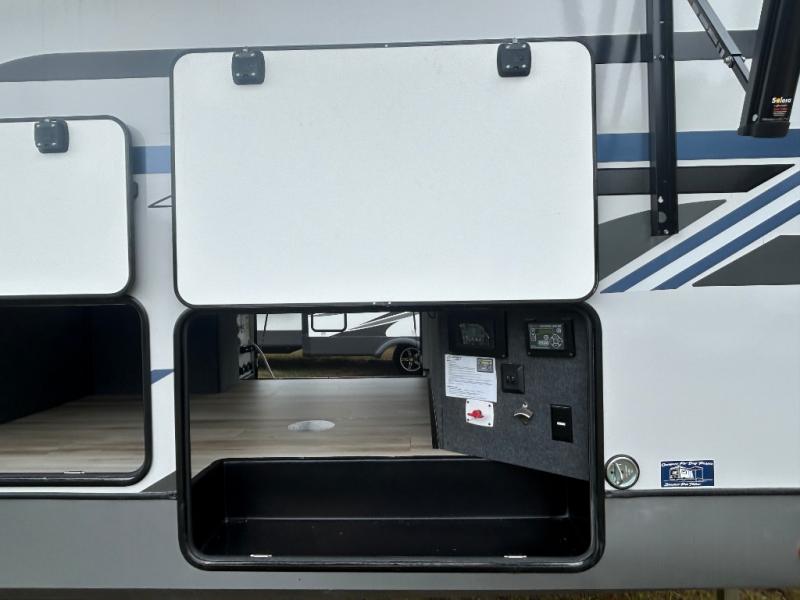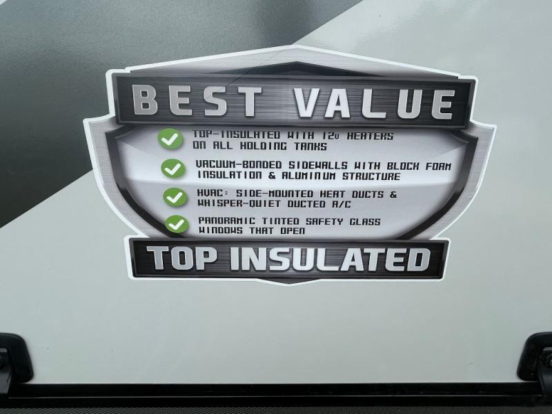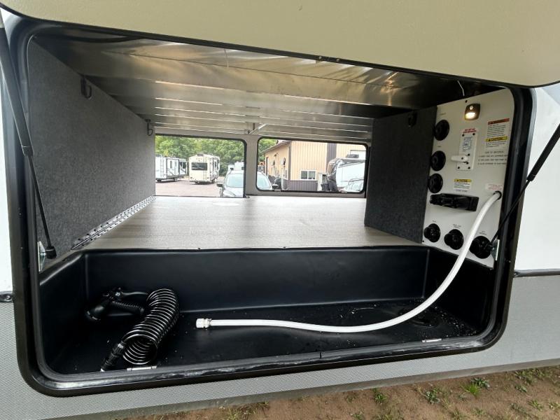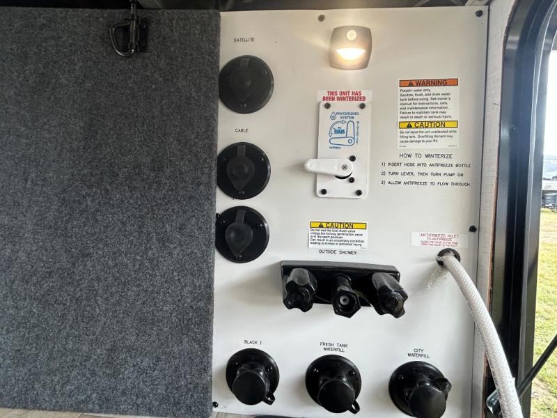 The RV is built with laminated "Aluma Frame" sidewalls and floor and a fiberglass exterior. It comes with a 15,000 BTU A/C and is prepped for a second A/C unit. It has a 49-gallon fresh water tank, a 78-gallon gray water tank, and a 30-gallon black water tank. Other features include a 21-foot power awning with LED lights, a universal docking station, and a heated and enclosed underbelly with 12V tank heaters for all-season use. It also has a 60K BTU on-demand tankless water heater.