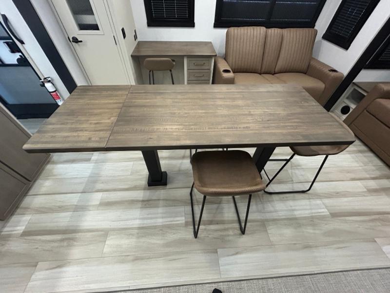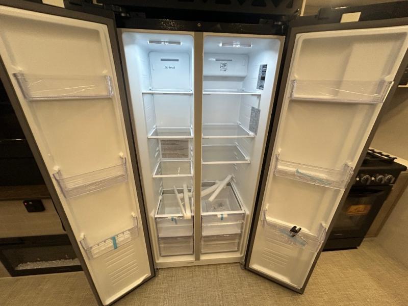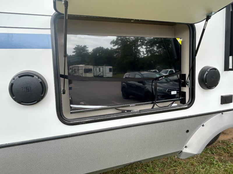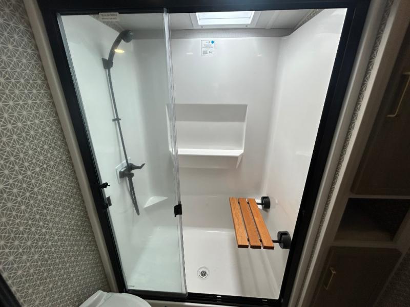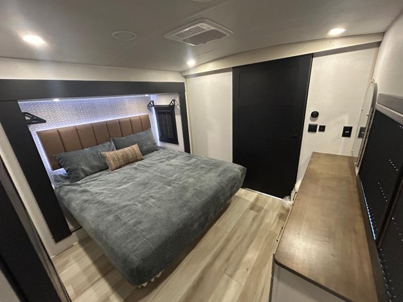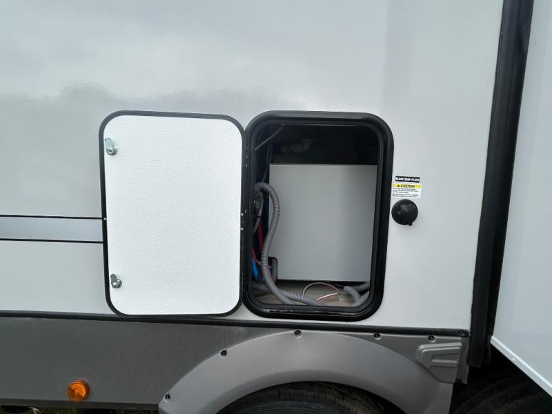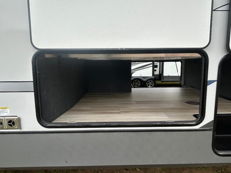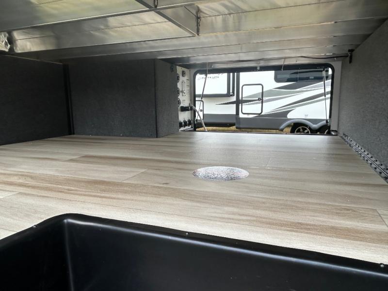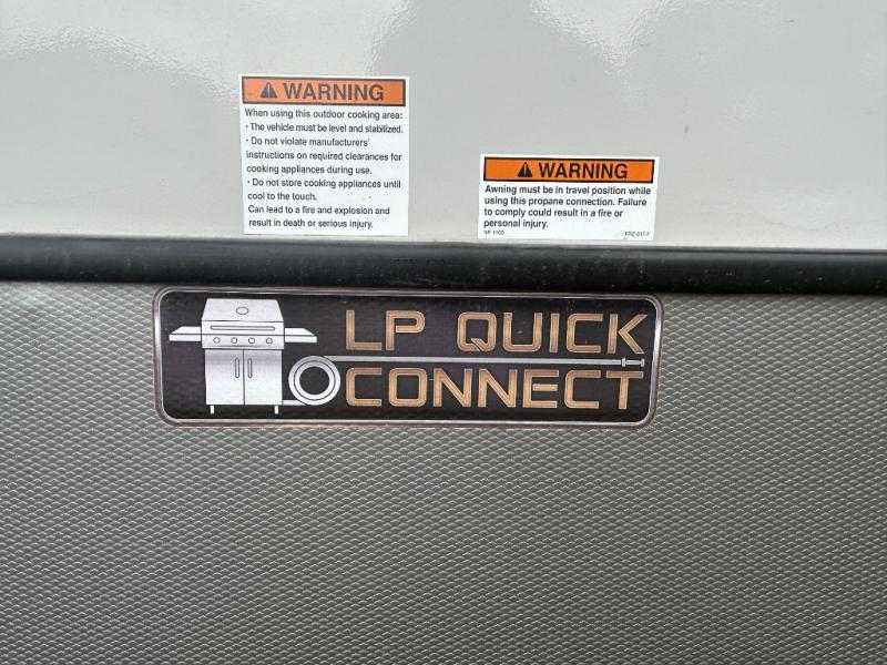 The RV is built with laminated "Aluma Frame" sidewalls and floor and a fiberglass exterior. It comes with a 15,000 BTU A/C and is prepped for a second A/C unit. It has a 49-gallon fresh water tank, a 78-gallon gray water tank, and a 30-gallon black water tank. Other features include a 21-foot power awning with LED lights, a universal docking station, and a heated and enclosed underbelly with 12V tank heaters for all-season use. It also has a 60K BTU on-demand tankless water heater.