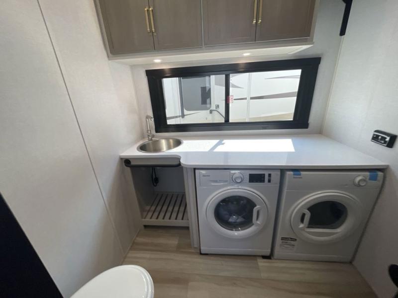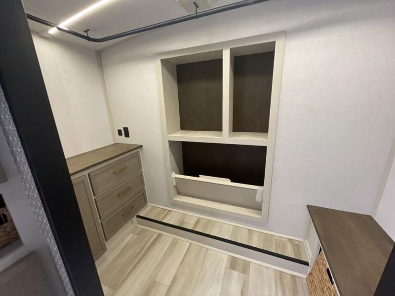 One look at this fifth wheel and you'll be sold! You can wake up each morning in the master bedroom that includes a custom king bed and a dresser with an ottoman. The front full bath has two bath sinks so you both can get ready at once, and you're going to love the walk-in wardrobe with wrap-around hanging rod. A half bath includes a floating shelf with a hanging rod plus washer/dryer prep, giving you the option to make this a laundry room! The back of this unit is where you can cook meals with full kitchen amenities, dine at the kitchen island with four chairs, and relax on the theater seating and tri-fold sofa. A 50" TV and fireplace is also found here, complete with hidden storage behind for board games, movies, and snacks!