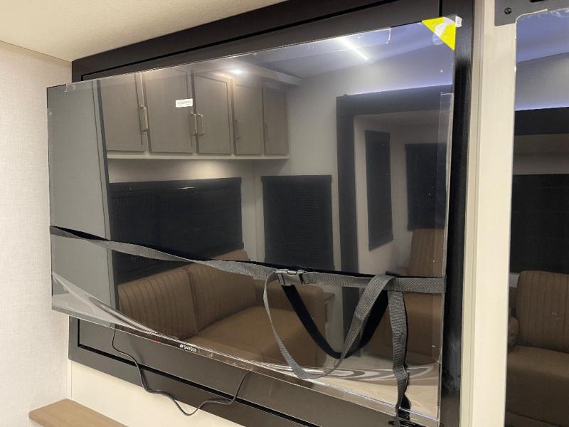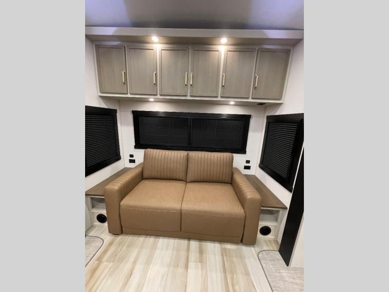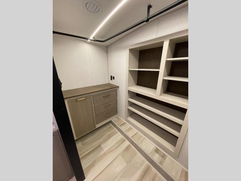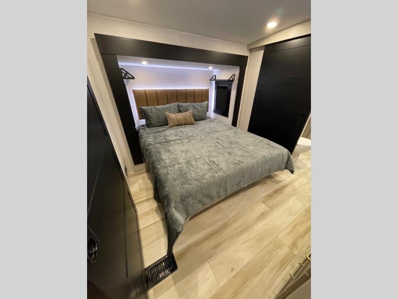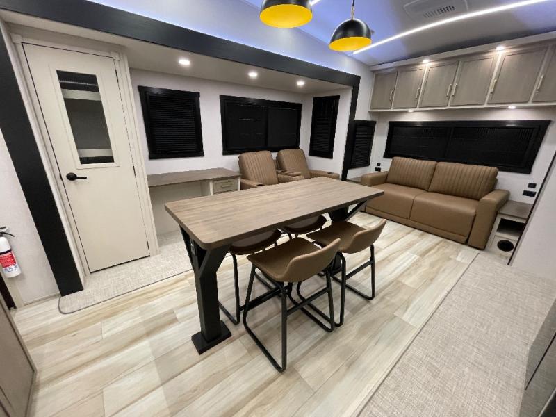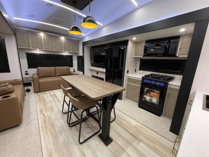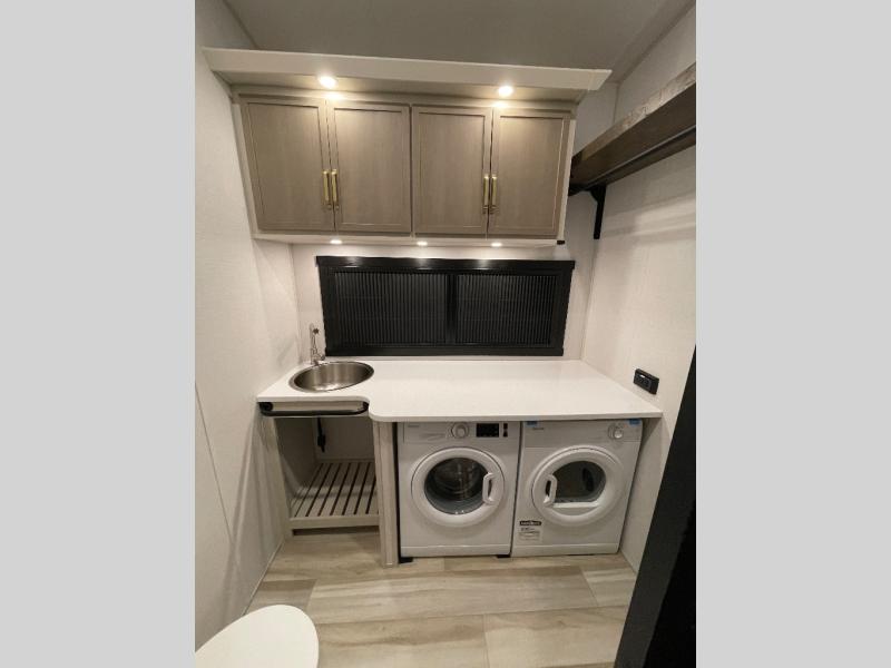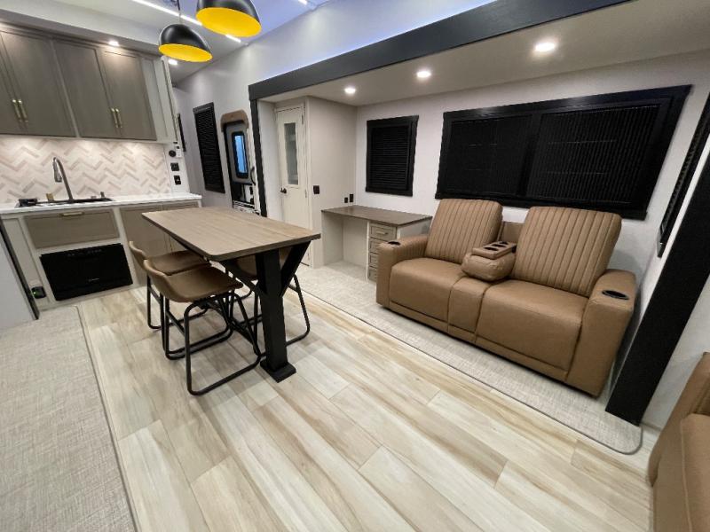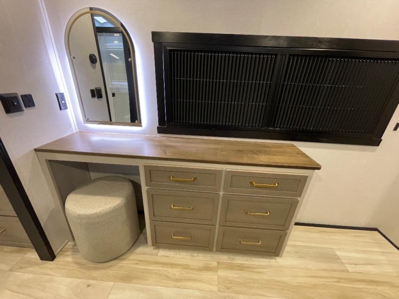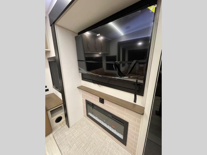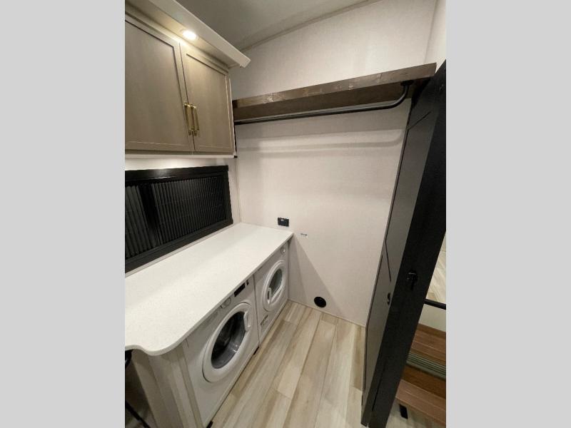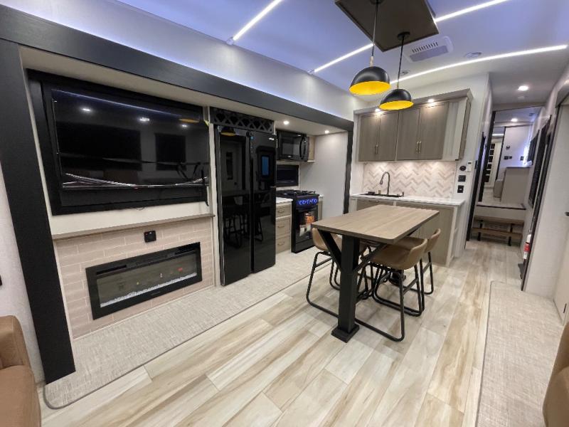 One look at this fifth wheel and you'll be sold! You can wake up each morning in the master bedroom that includes a custom king bed and a dresser with an ottoman. The front full bath has two bath sinks so you both can get ready at once, and you're going to love the walk-in wardrobe with wrap-around hanging rod. A half bath includes a floating shelf with a hanging rod plus washer/dryer prep, giving you the option to make this a laundry room! The back of this unit is where you can cook meals with full kitchen amenities, dine at the kitchen island with four chairs, and relax on the theater seating and tri-fold sofa. A 50" TV and fireplace is also found here, complete with hidden storage behind for board games, movies, and snacks!