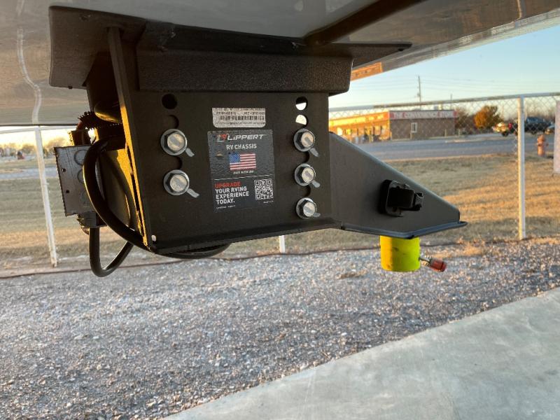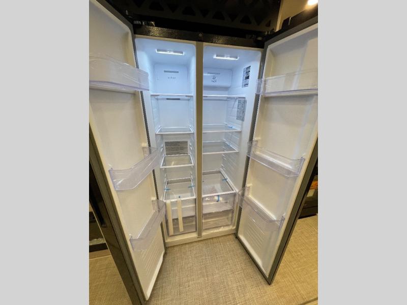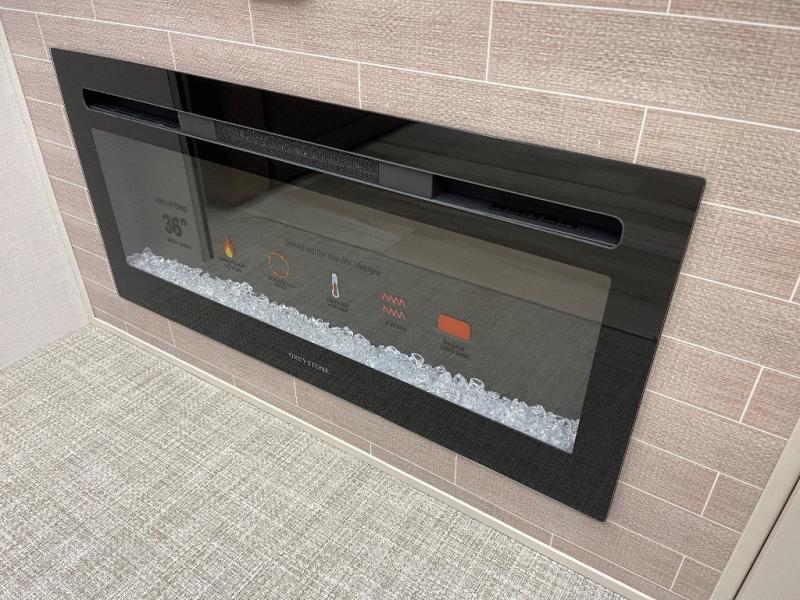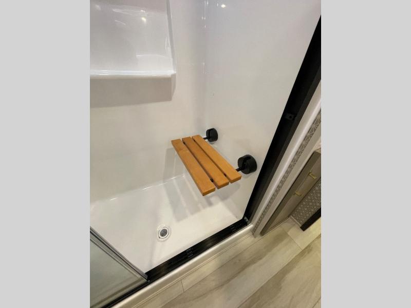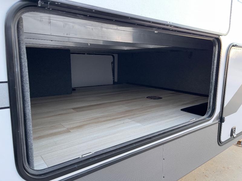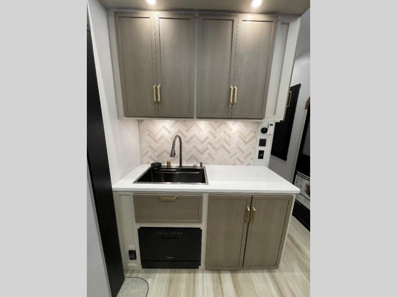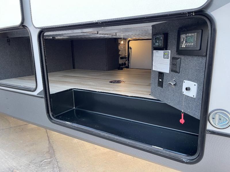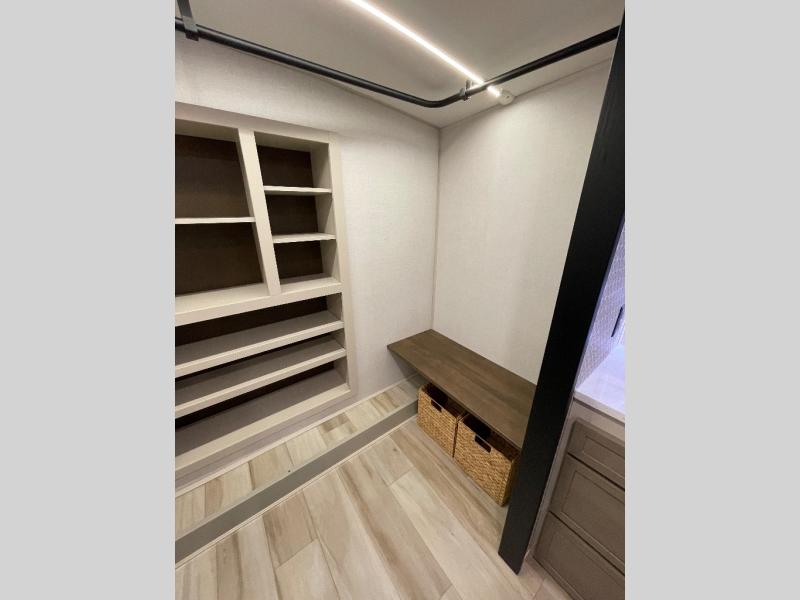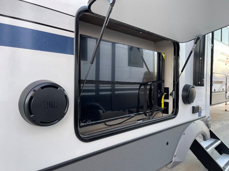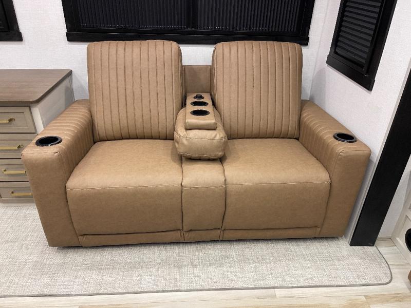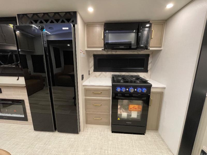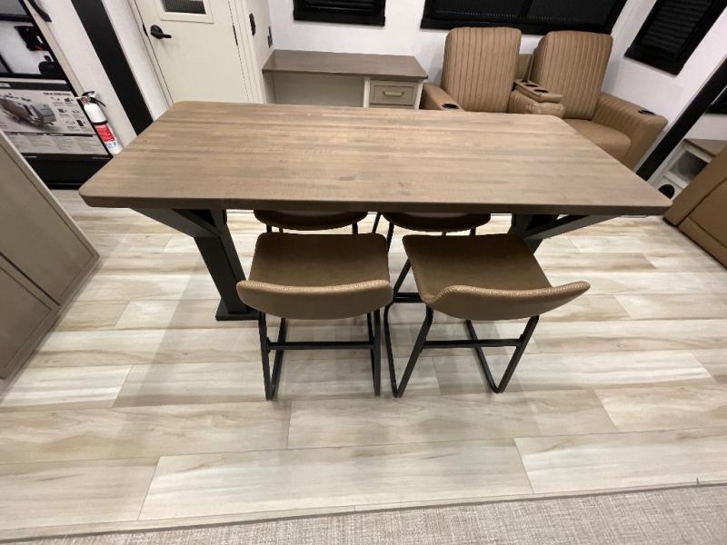 One look at this fifth wheel and you'll be sold! You can wake up each morning in the master bedroom that includes a custom king bed and a dresser with an ottoman. The front full bath has two bath sinks so you both can get ready at once, and you're going to love the walk-in wardrobe with wrap-around hanging rod. A half bath includes a floating shelf with a hanging rod plus washer/dryer prep, giving you the option to make this a laundry room! The back of this unit is where you can cook meals with full kitchen amenities, dine at the kitchen island with four chairs, and relax on the theater seating and tri-fold sofa. A 50" TV and fireplace is also found here, complete with hidden storage behind for board games, movies, and snacks!