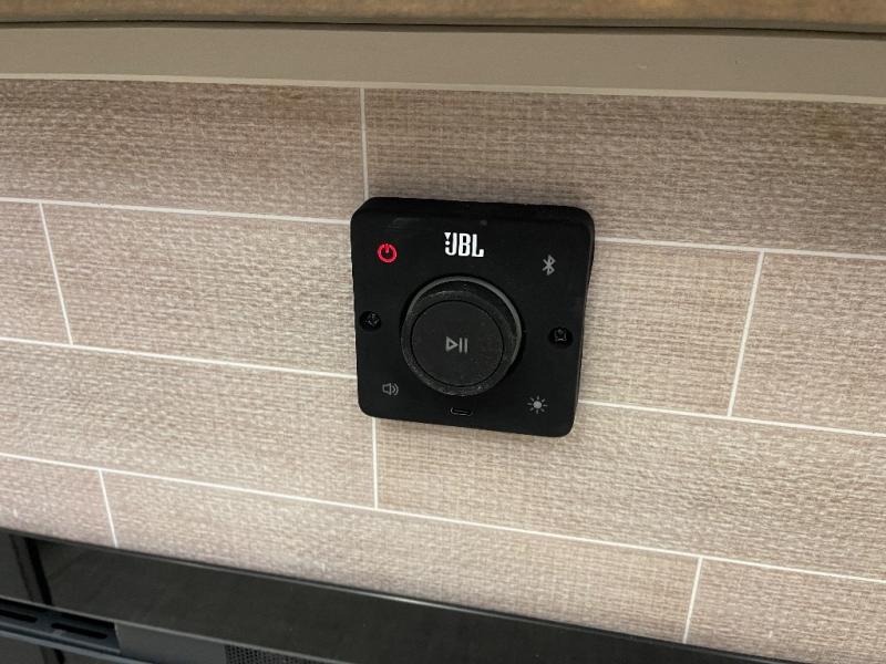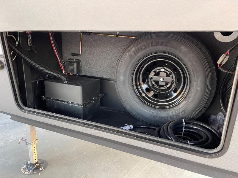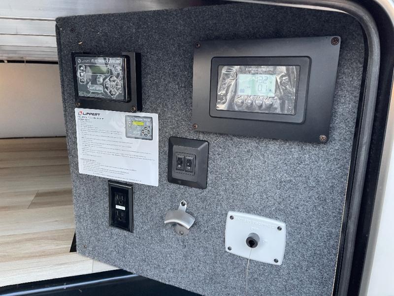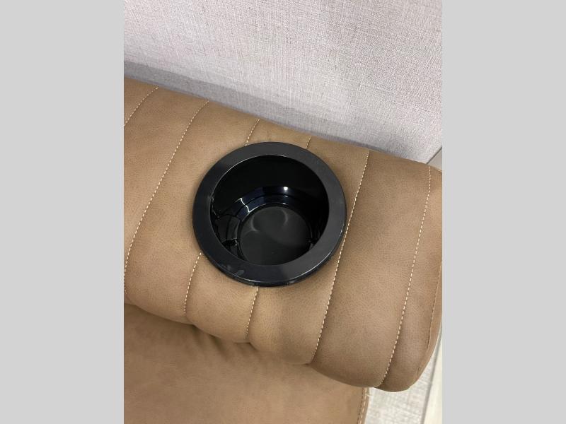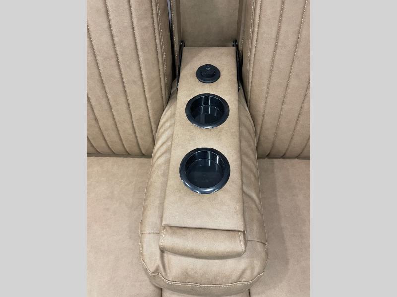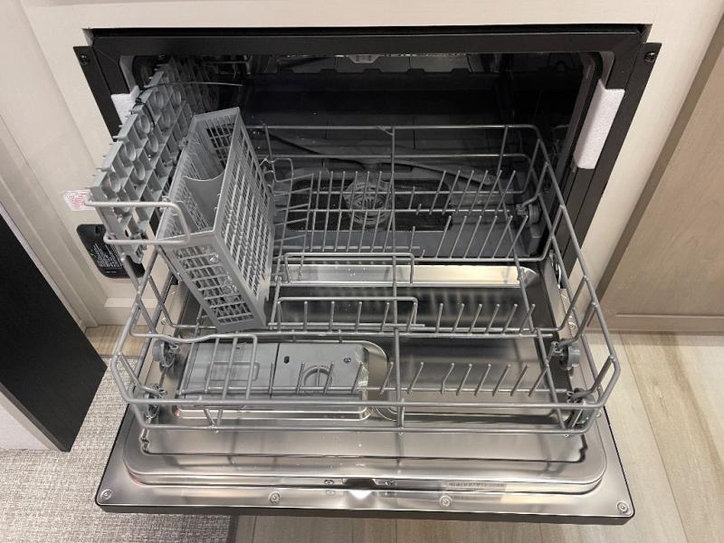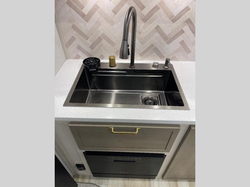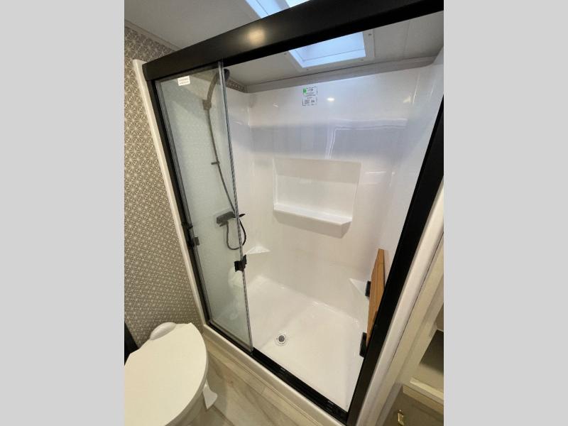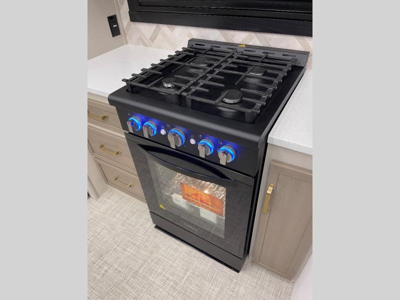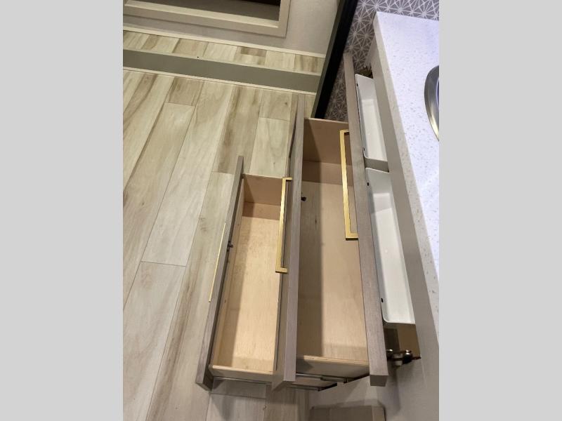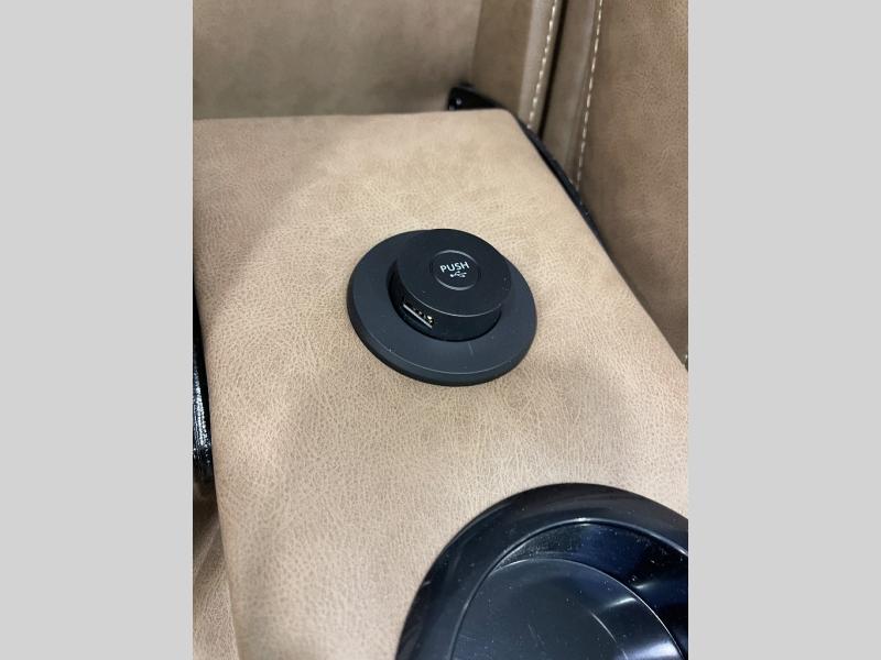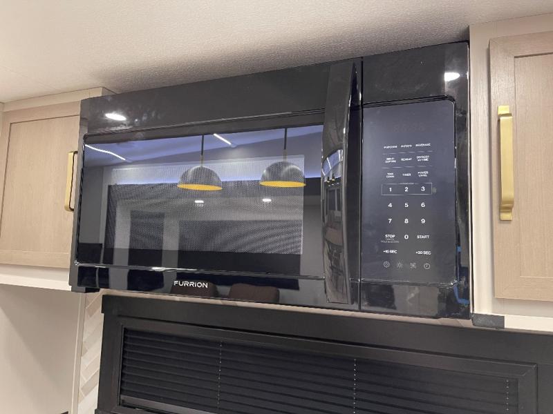 One look at this fifth wheel and you'll be sold! You can wake up each morning in the master bedroom that includes a custom king bed and a dresser with an ottoman. The front full bath has two bath sinks so you both can get ready at once, and you're going to love the walk-in wardrobe with wrap-around hanging rod. A half bath includes a floating shelf with a hanging rod plus washer/dryer prep, giving you the option to make this a laundry room! The back of this unit is where you can cook meals with full kitchen amenities, dine at the kitchen island with four chairs, and relax on the theater seating and tri-fold sofa. A 50" TV and fireplace is also found here, complete with hidden storage behind for board games, movies, and snacks!
