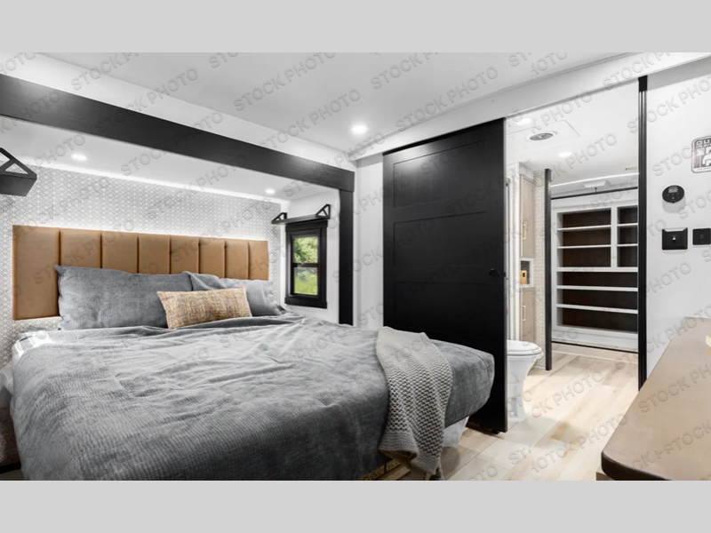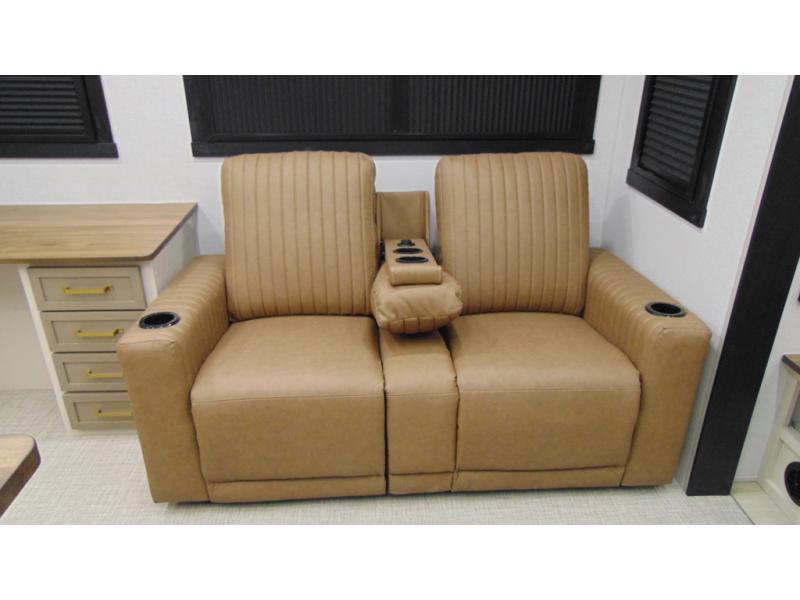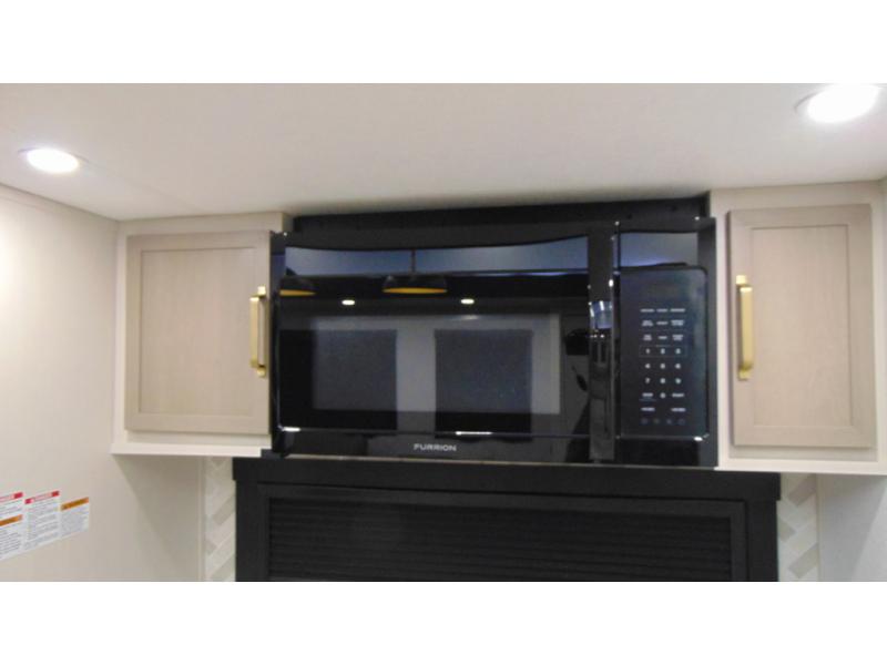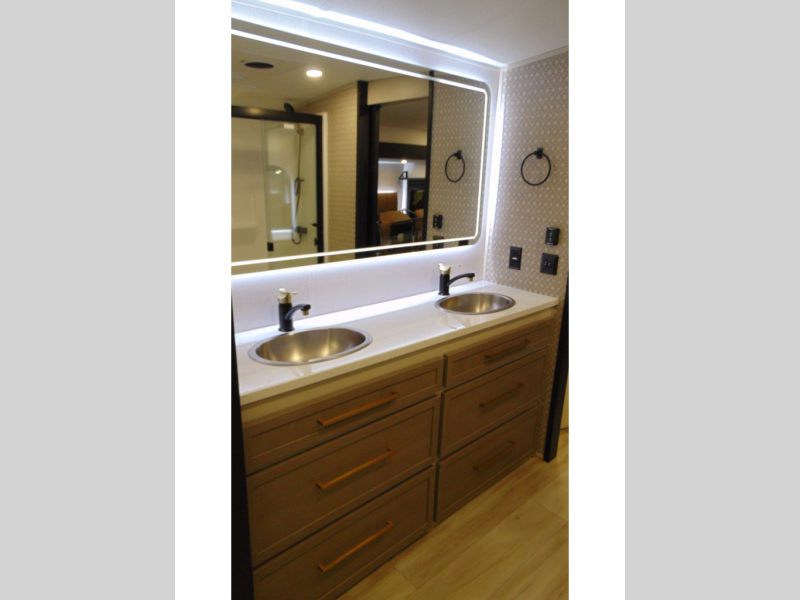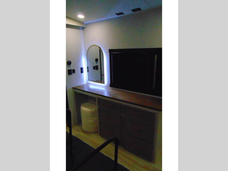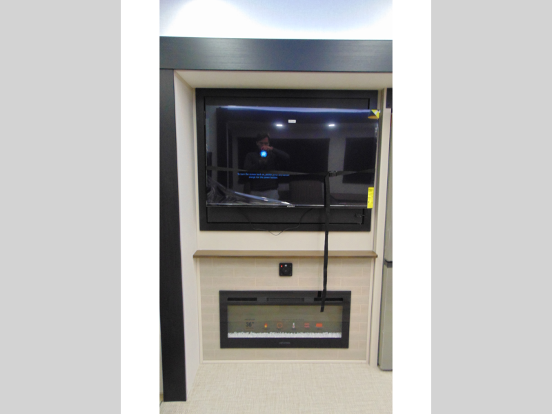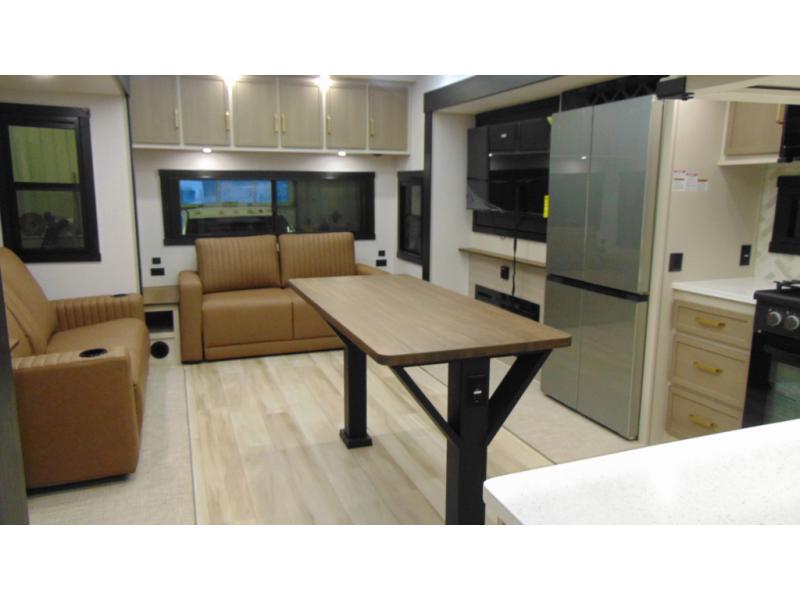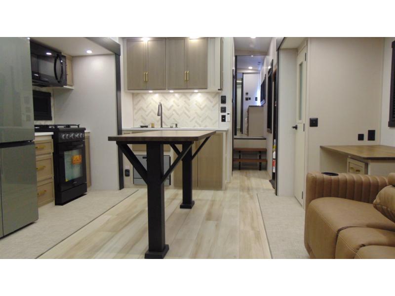 One look at this fifth wheel and you'll be sold! You can wake up each morning in the master bedroom that includes a custom king bed and a dresser with an ottoman. The front full bath has two bath sinks so you both can get ready at once, and you're going to love the walk-in wardrobe with wrap-around hanging rod. A half bath includes a floating shelf with a hanging rod plus washer/dryer prep, giving you the option to make this a laundry room! The back of this unit is where you can cook meals with full kitchen amenities, dine at the kitchen island with four chairs, and relax on the theater seating and tri-fold sofa. A 50" TV and fireplace is also found here, complete with hidden storage behind for board games, movies, and snacks!