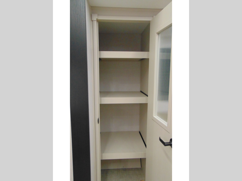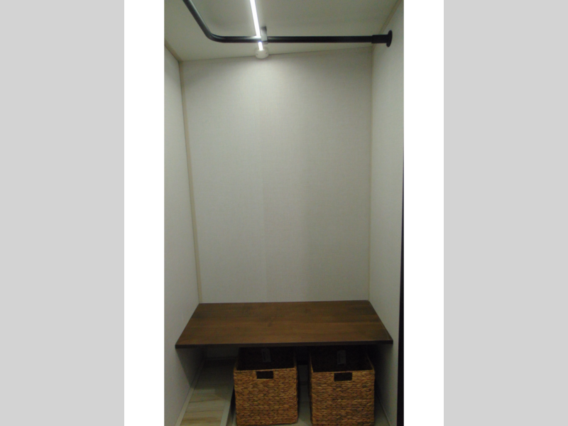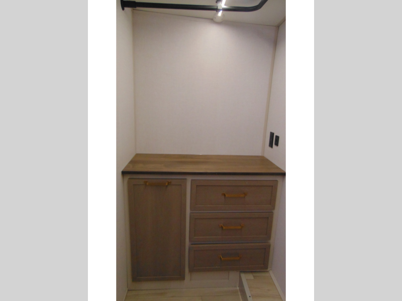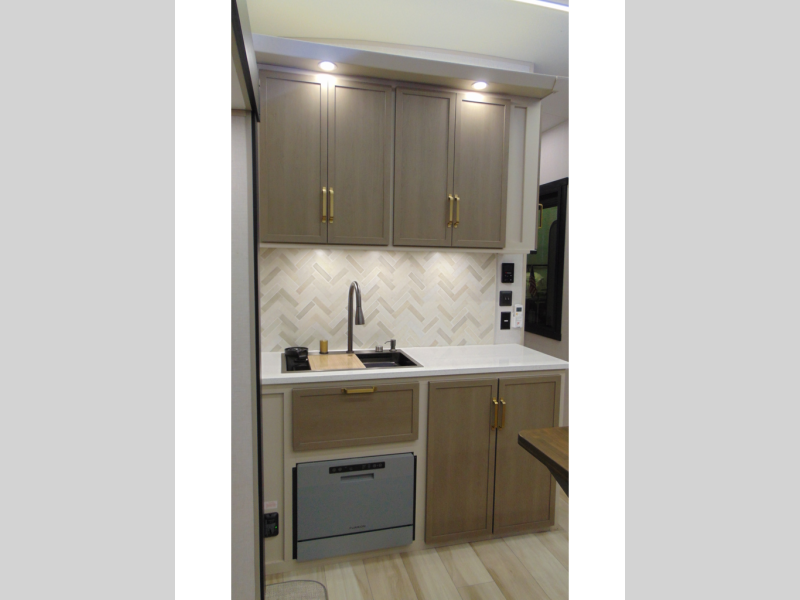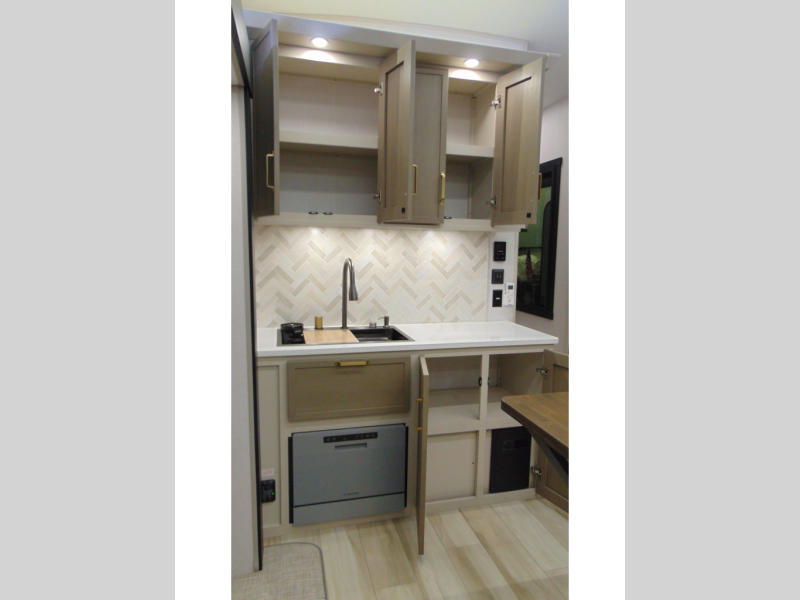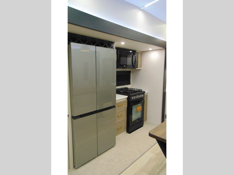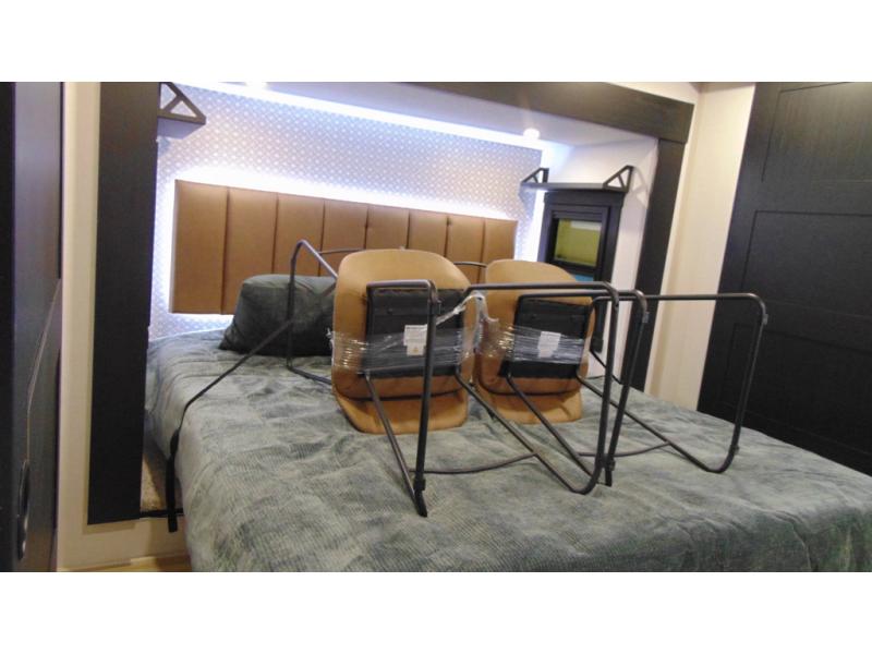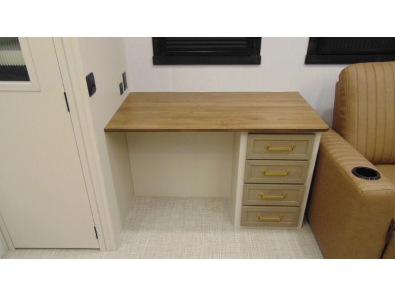 One look at this fifth wheel and you'll be sold! You can wake up each morning in the master bedroom that includes a custom king bed and a dresser with an ottoman. The front full bath has two bath sinks so you both can get ready at once, and you're going to love the walk-in wardrobe with wrap-around hanging rod. A half bath includes a floating shelf with a hanging rod plus washer/dryer prep, giving you the option to make this a laundry room! The back of this unit is where you can cook meals with full kitchen amenities, dine at the kitchen island with four chairs, and relax on the theater seating and tri-fold sofa. A 50" TV and fireplace is also found here, complete with hidden storage behind for board games, movies, and snacks!