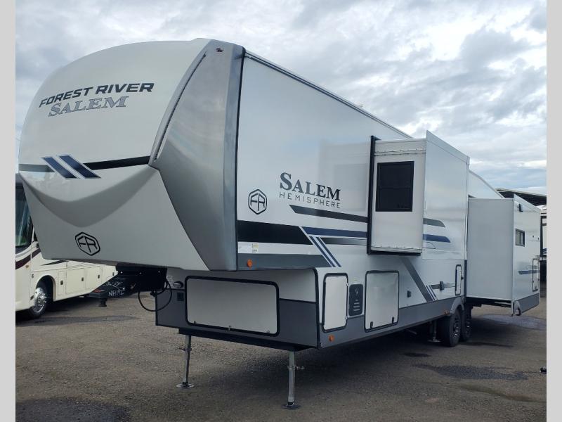 The Salem Hemisphere fifth wheels by Forest River are packed with features, while still being value-minded! Each model is constructed with laminated "Aluma Frame" sidewalls and floor with block foam insulation plus full-length barreled ceilings for added head space. There are LED awning, marker and taillights outside, along with an extra-large pass-thru storage with slam latch baggage doors, plus solar prep and Lippert On-The-Go ladder prep. The 60K on-demand tankless water heater will provide endless hot showers, and the JBL sound system includes a head unit plus interior and exterior speakers to keep the party going. There are also many interior comforts found throughout that will make you feel right at home!