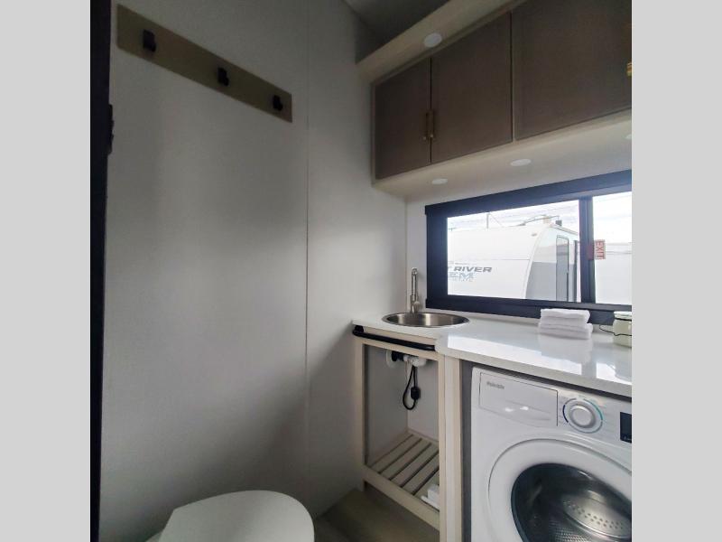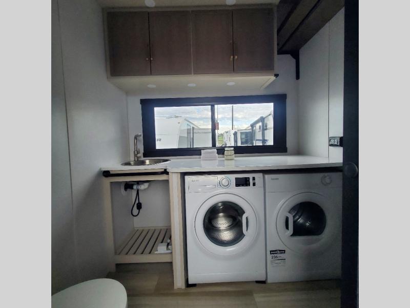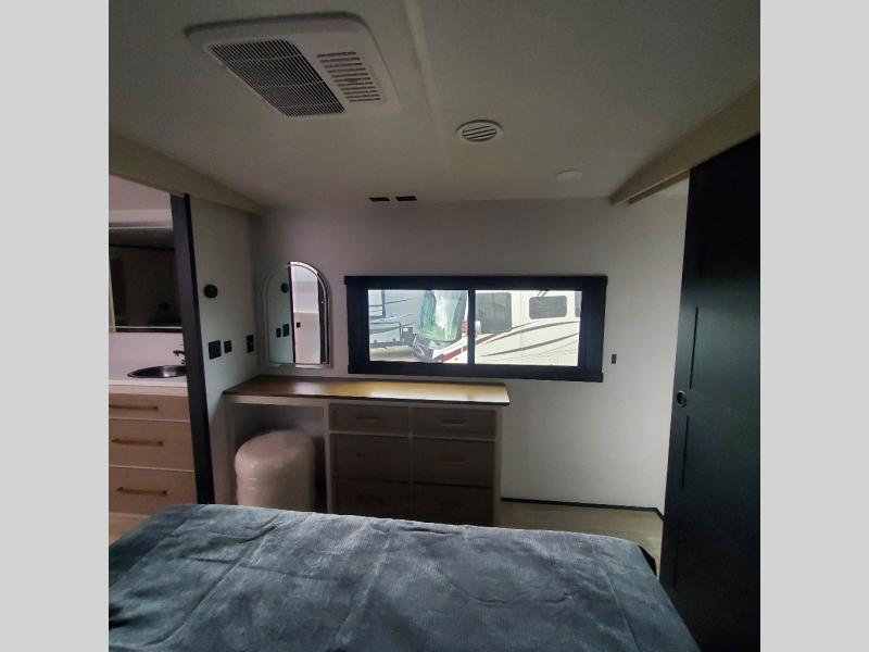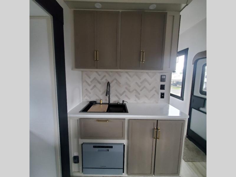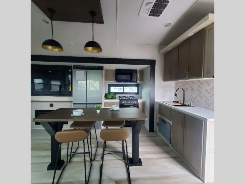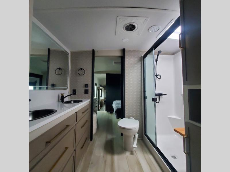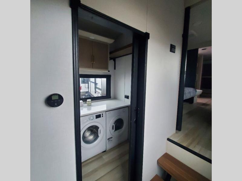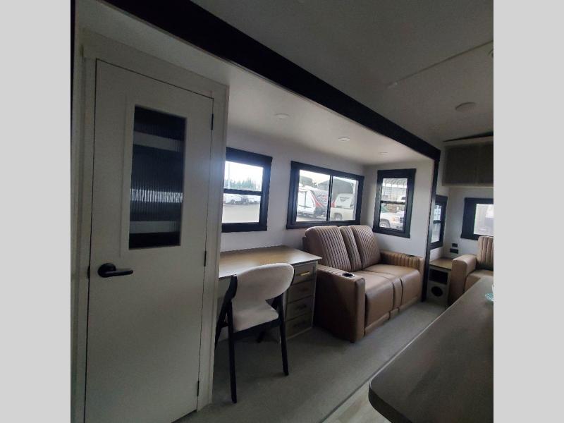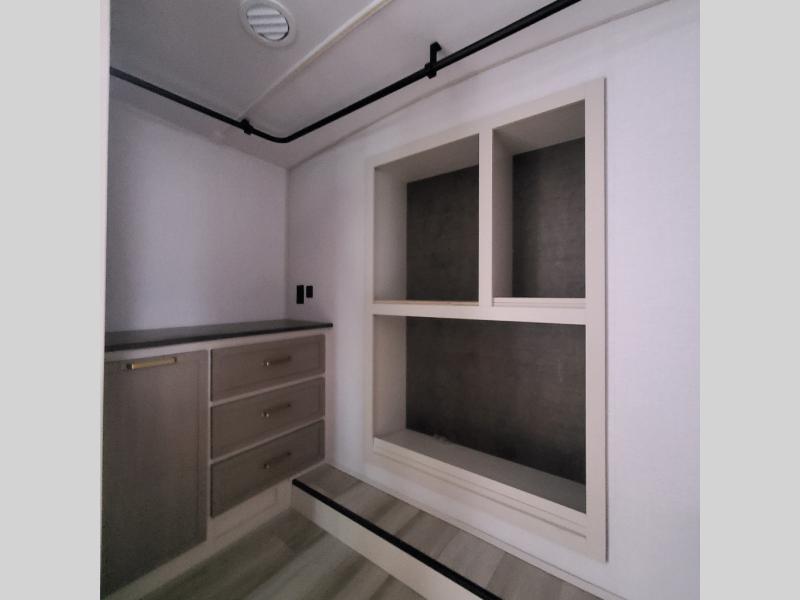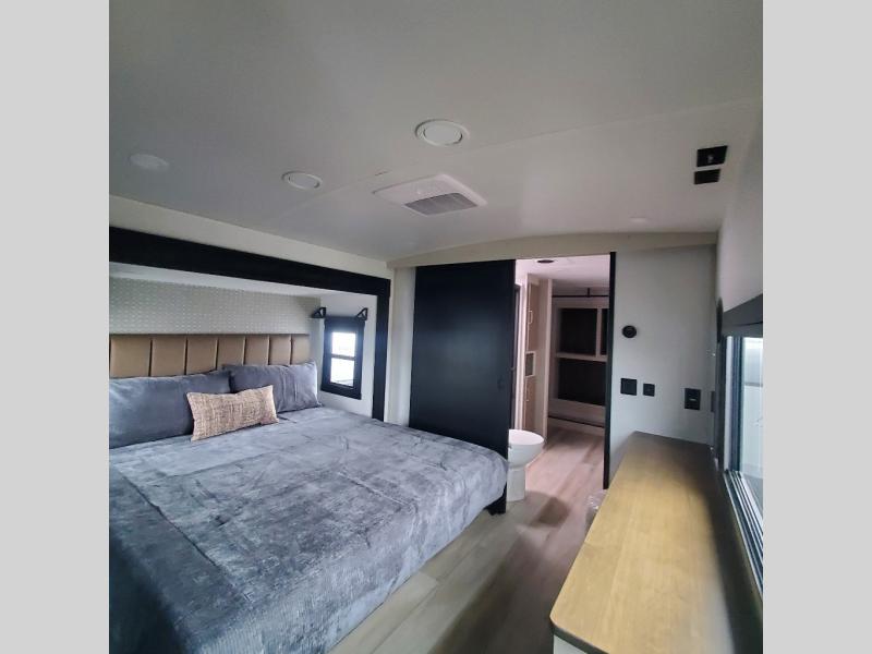 One look at this fifth wheel and you'll be sold! You can wake up each morning in the master bedroom that includes a custom king bed and a dresser with an ottoman. The front full bath has two bath sinks so you both can get ready at once, and you're going to love the walk-in wardrobe with wrap-around hanging rod. A half bath includes a floating shelf with a hanging rod plus washer/dryer prep, giving you the option to make this a laundry room! The back of this unit is where you can cook meals with full kitchen amenities, dine at the kitchen island with four chairs, and relax on the theater seating and tri-fold sofa. A 50" TV and fireplace is also found here, complete with hidden storage behind for board games, movies, and snacks!