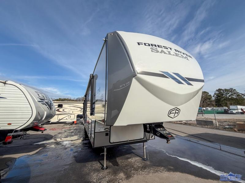 The Salem Hemisphere fifth wheels by Forest River are packed with features, while still being value-minded! Each model is constructed with laminated "Aluma Frame" sidewalls and floor with block foam insulation plus full-length barreled ceilings for added head space. There are LED awning, marker and taillights outside, along with an extra-large pass-thru storage with slam latch baggage doors, plus solar prep and Lippert On-The-Go ladder prep. The 60K on-demand tankless water heater will provide endless hot showers, and the JBL sound system includes a head unit plus interior and exterior speakers to keep the party going. There are also many interior comforts found throughout that will make you feel right at home!