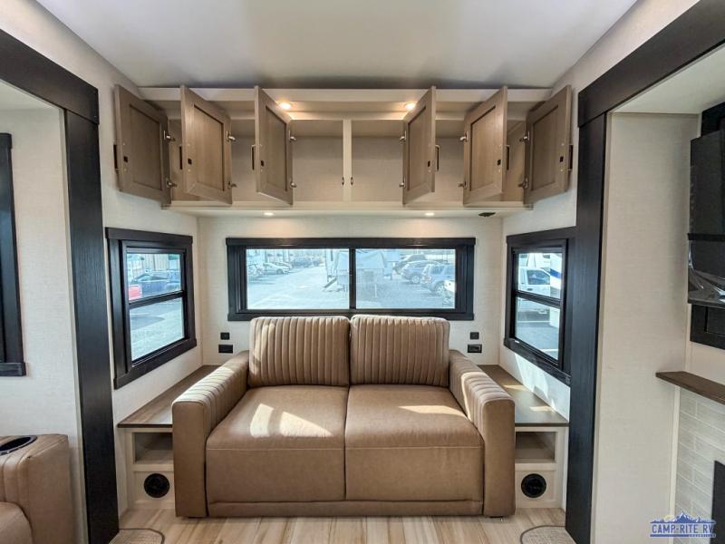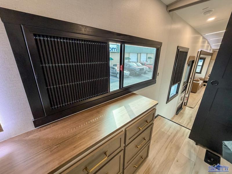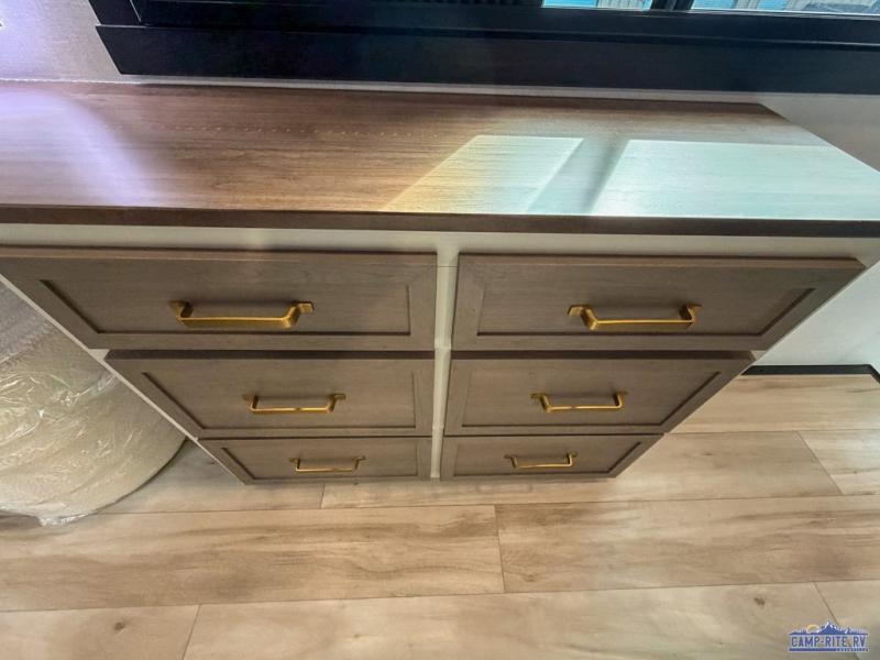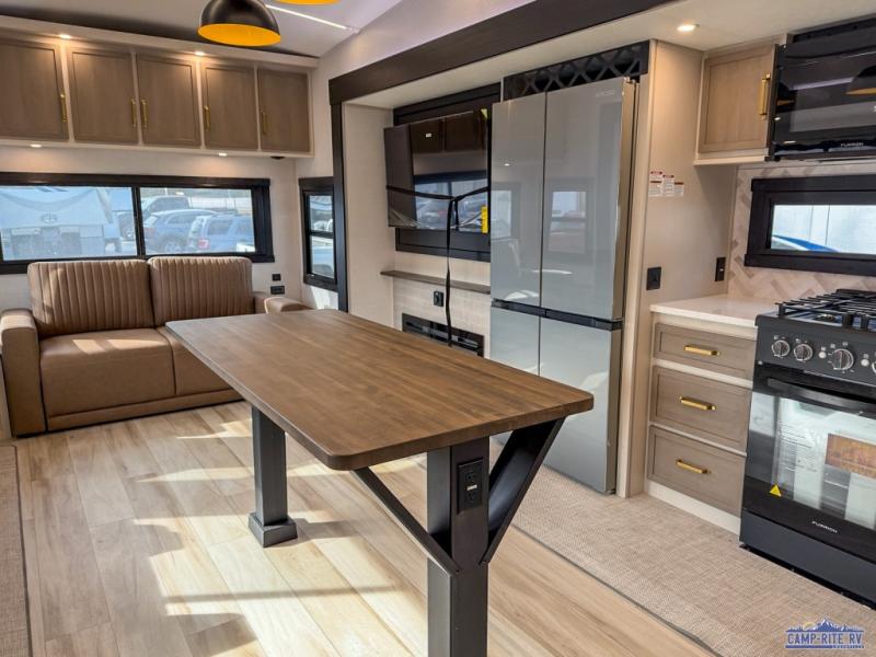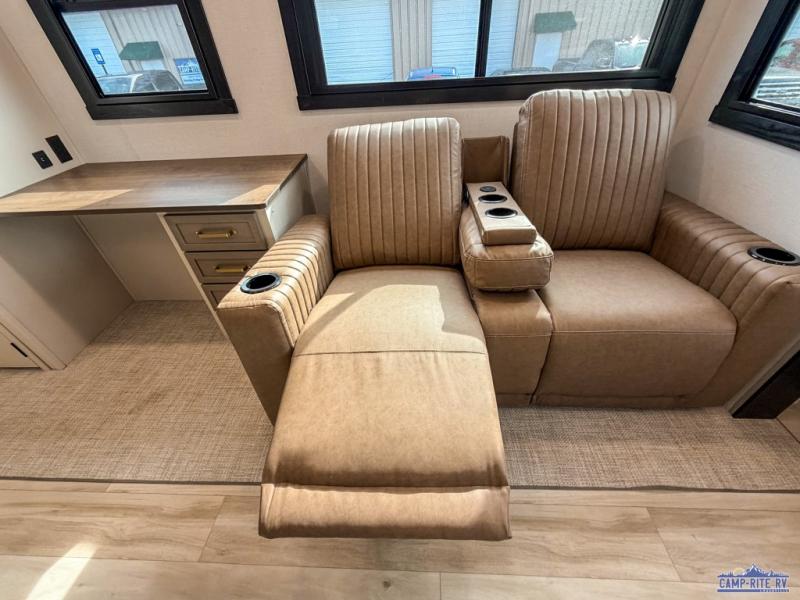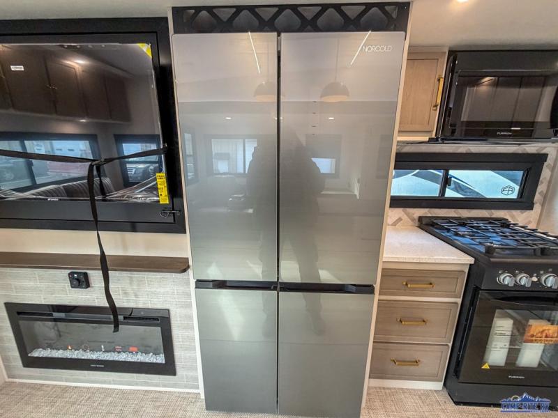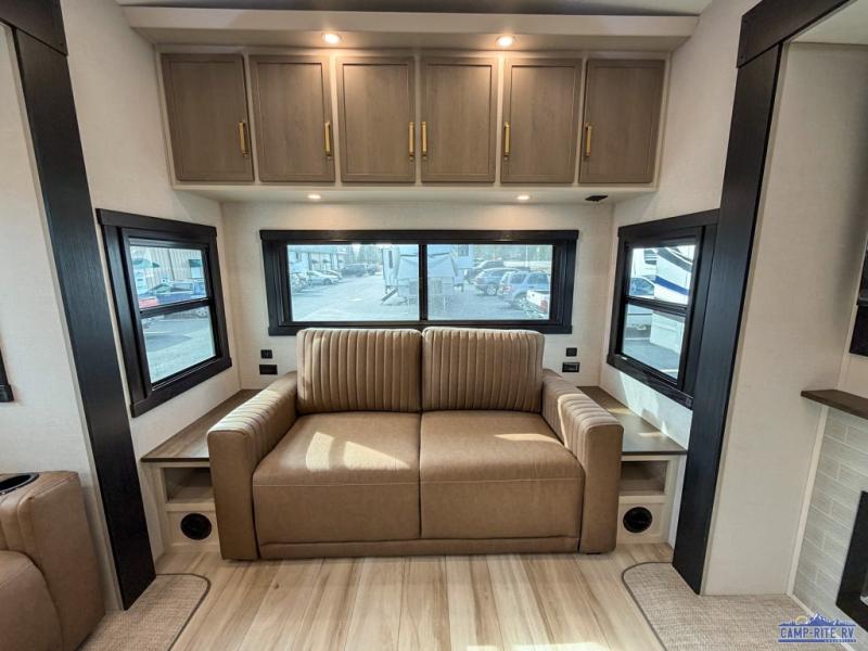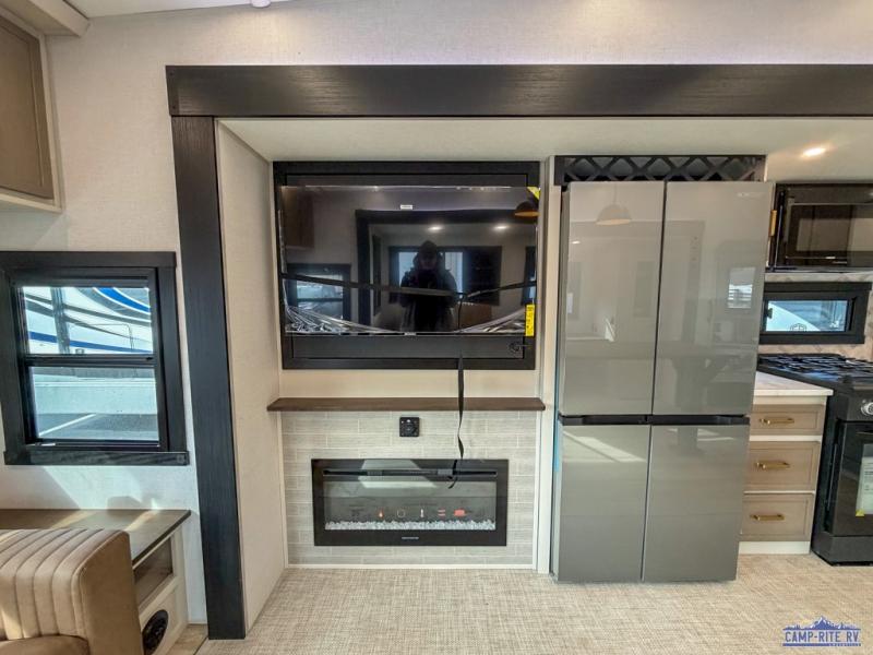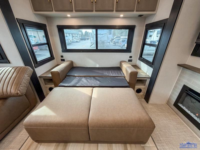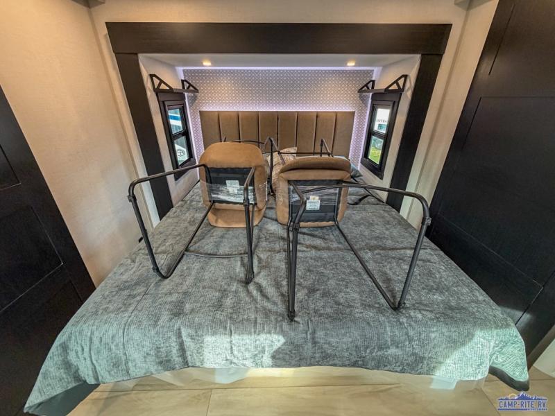 One look at this fifth wheel and you'll be sold! You can wake up each morning in the master bedroom that includes a custom king bed and a dresser with an ottoman. The front full bath has two bath sinks so you both can get ready at once, and you're going to love the walk-in wardrobe with wrap-around hanging rod. A half bath includes a floating shelf with a hanging rod plus washer/dryer prep, giving you the option to make this a laundry room! The back of this unit is where you can cook meals with full kitchen amenities, dine at the kitchen island with four chairs, and relax on the theater seating and tri-fold sofa. A 50" TV and fireplace is also found here, complete with hidden storage behind for board games, movies, and snacks!